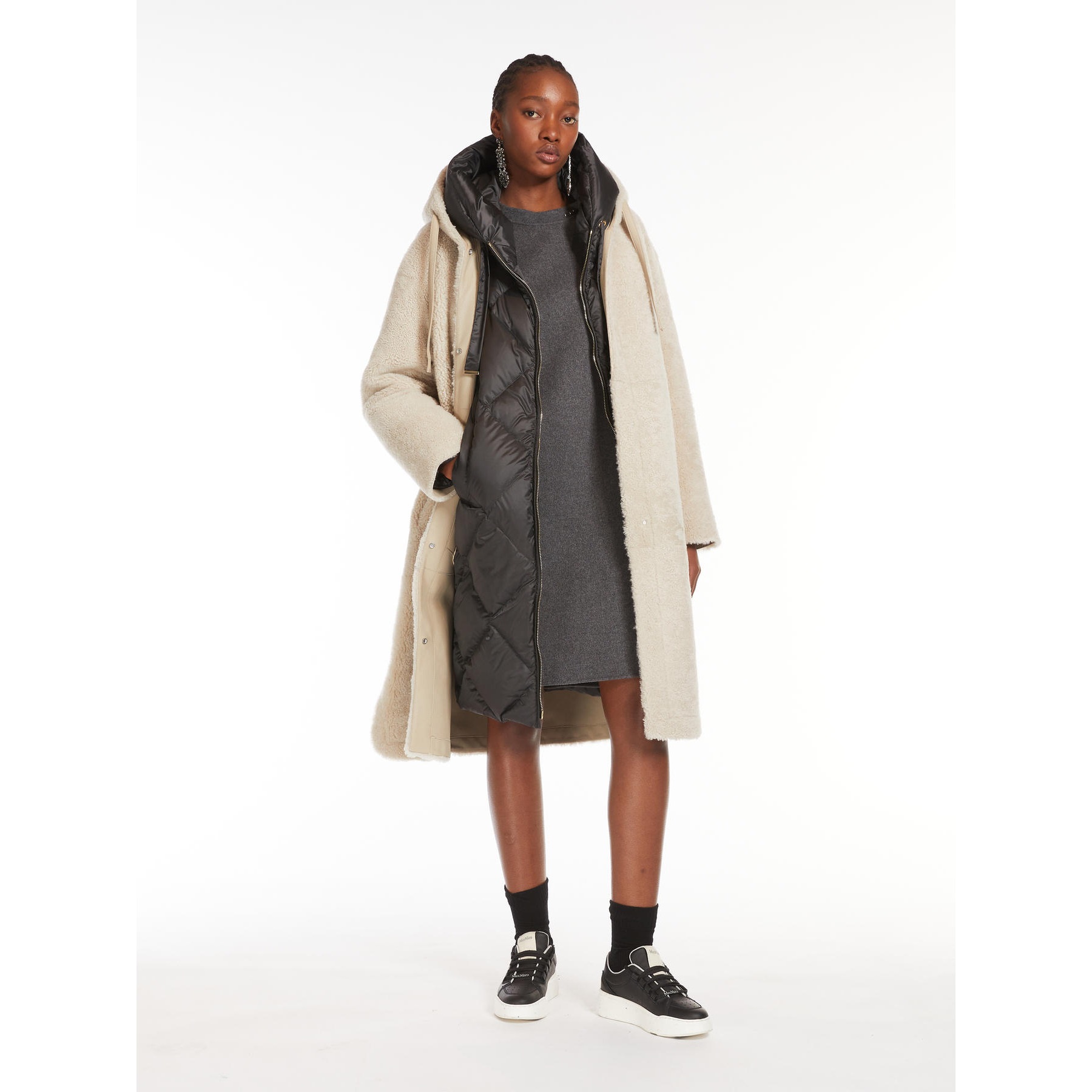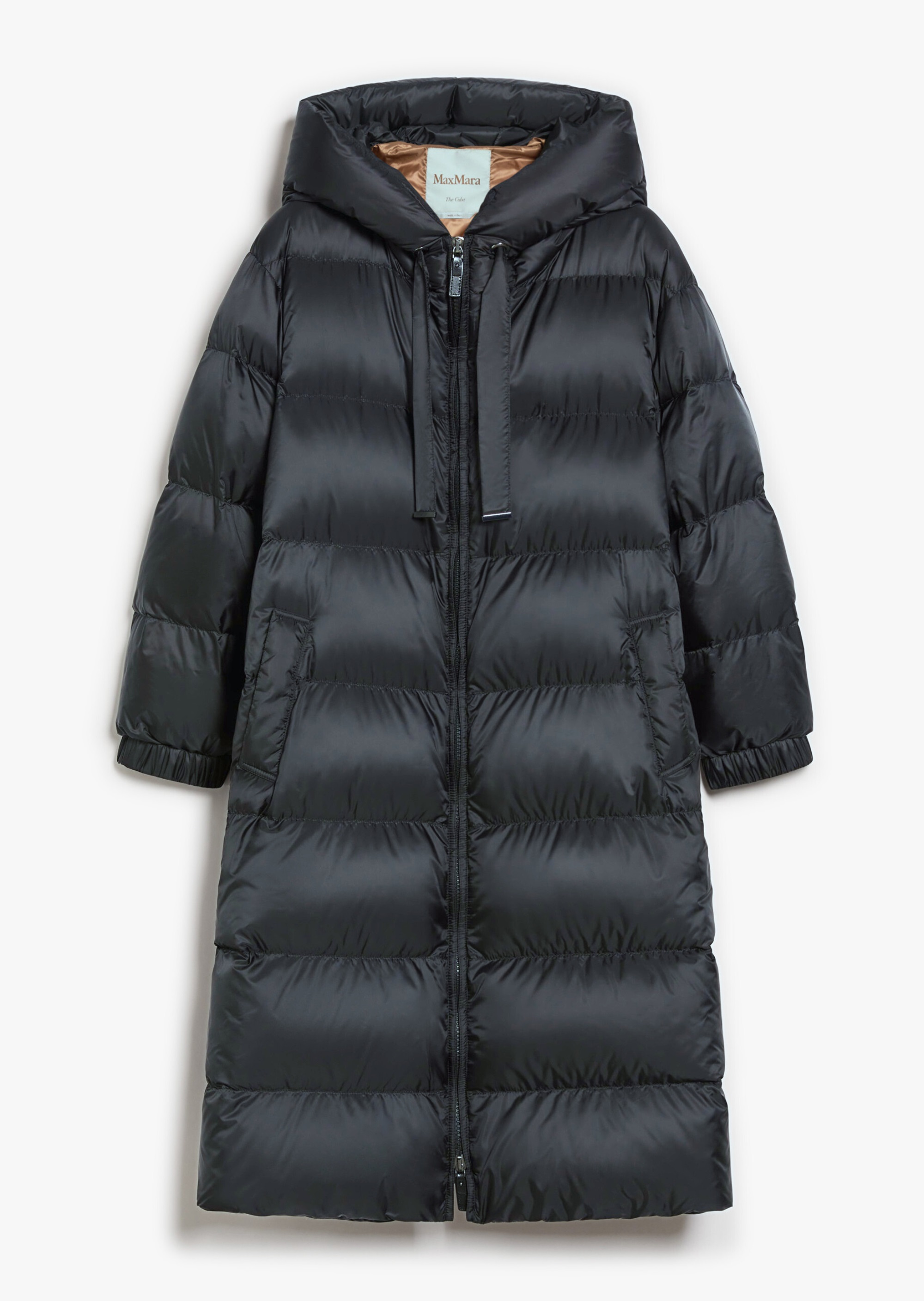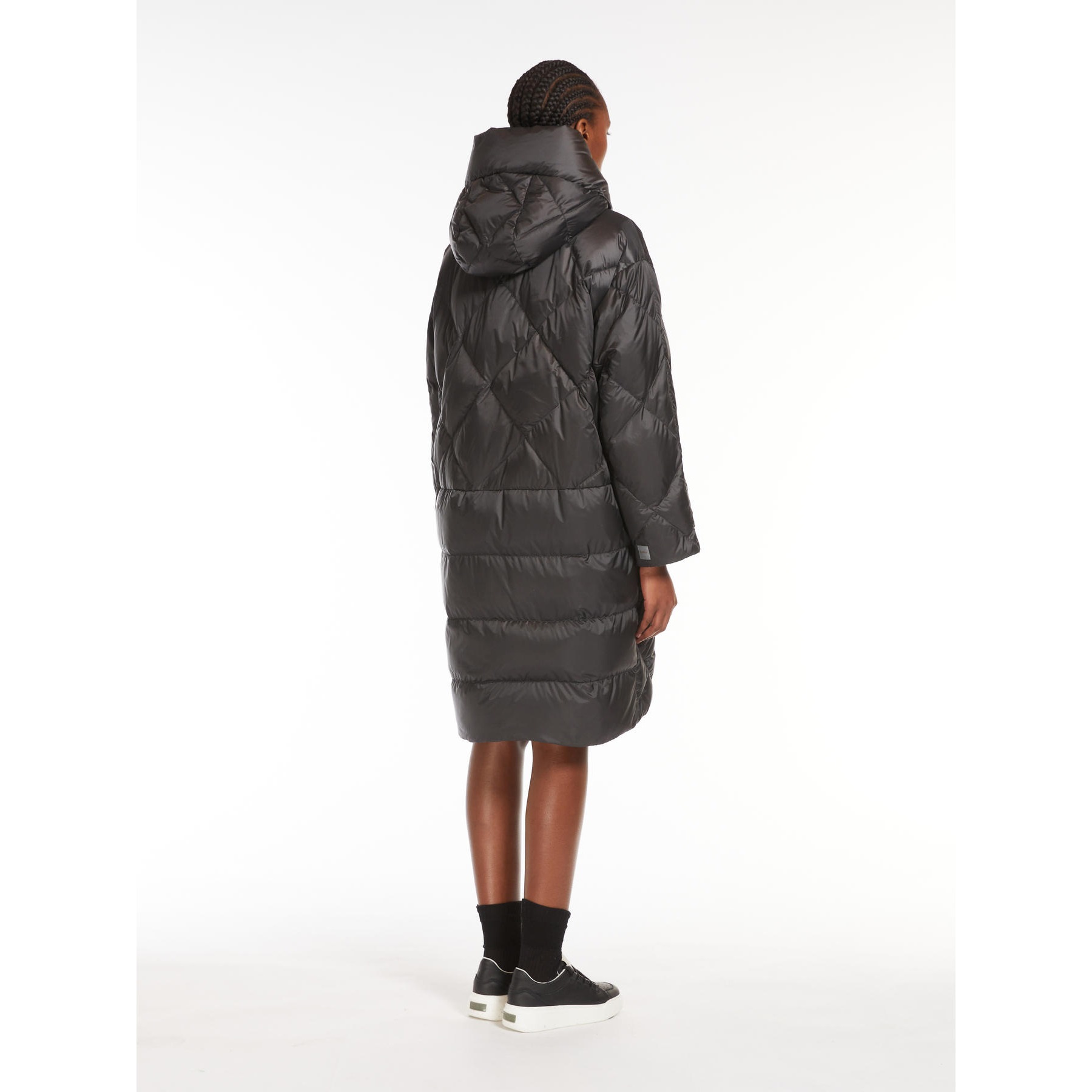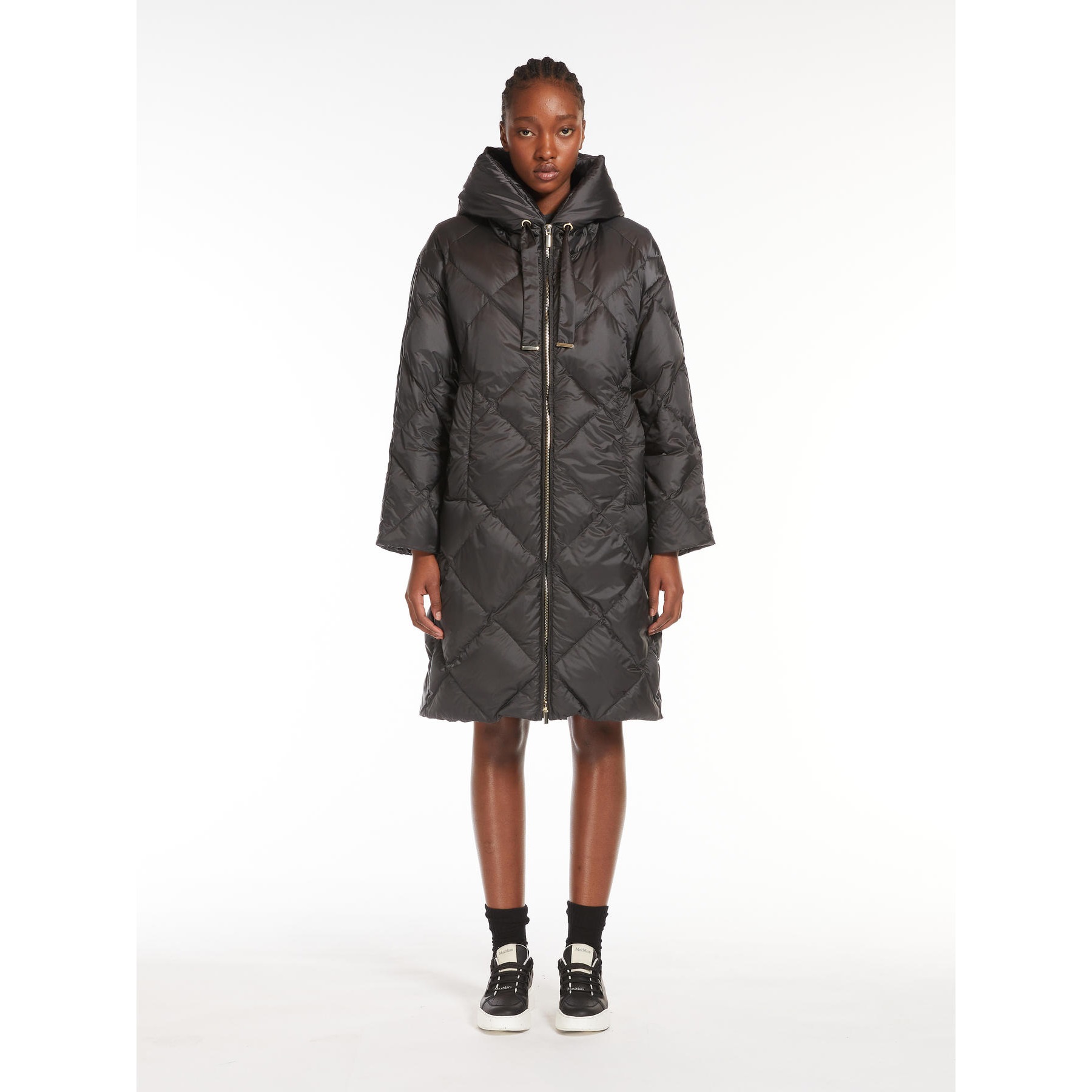 Куртка міді, виконана з водовідштовхувальної тканини на гусячому пуху, зі стьобаним візерунком у вигляді ромбів по всій поверхні, і стьобаною деталлю в смужку на подолі ззаду. Модель має капюшон на шнурівці та бічні прорізні кишені. Металевої блискавки спереду.