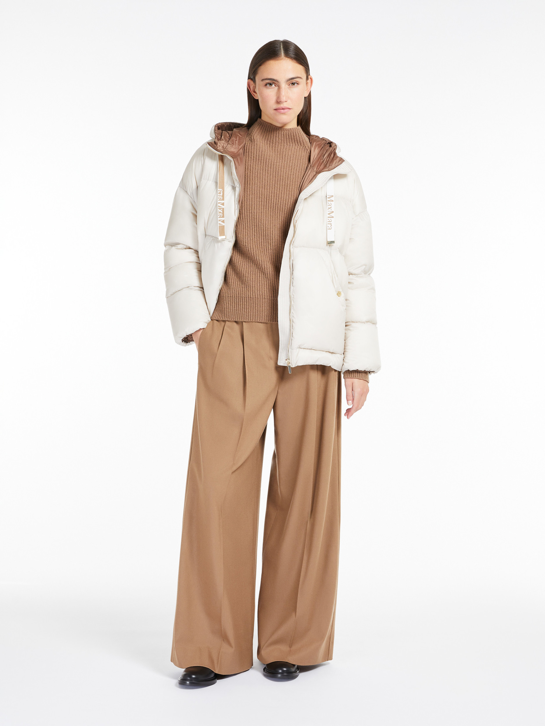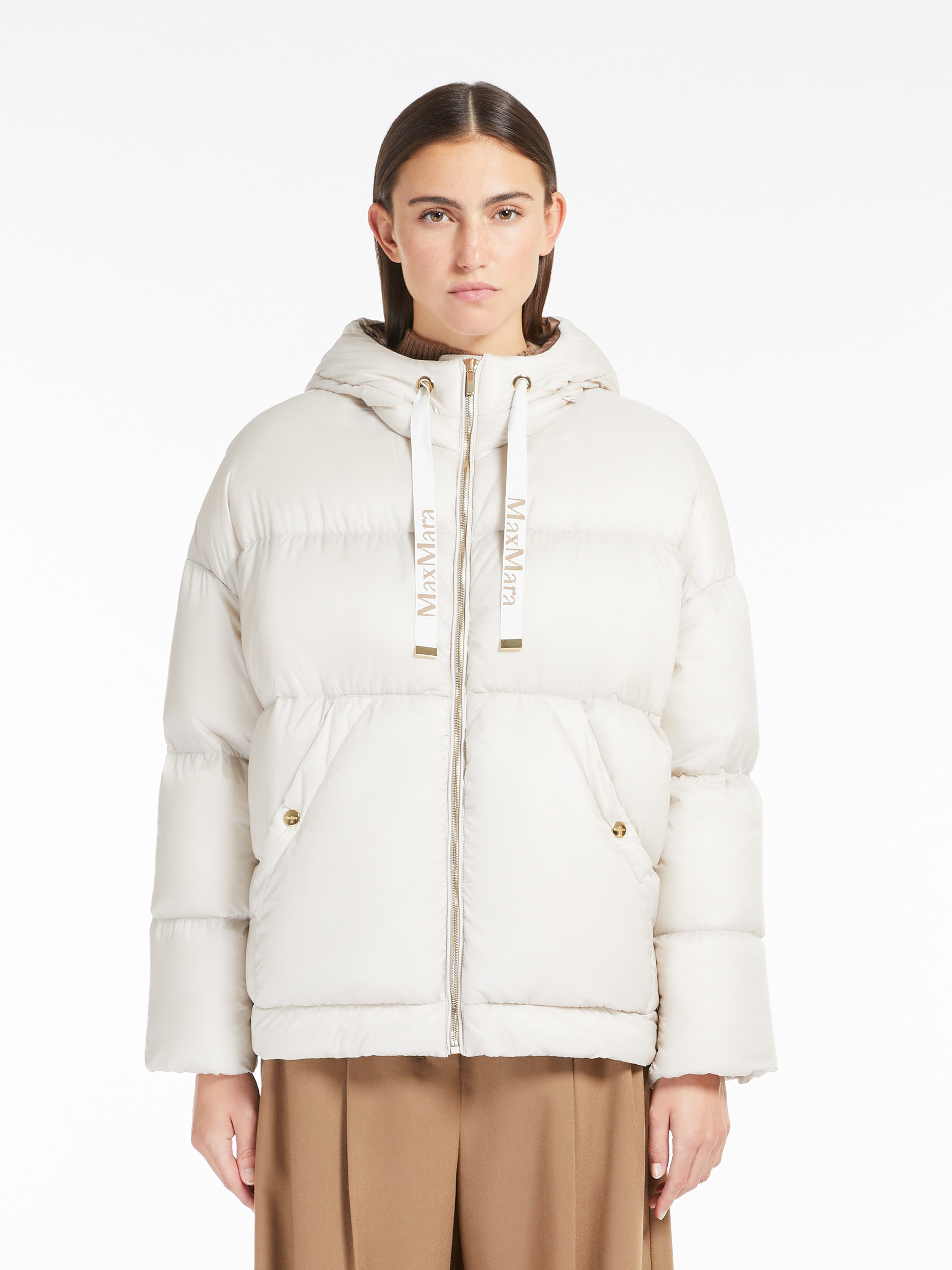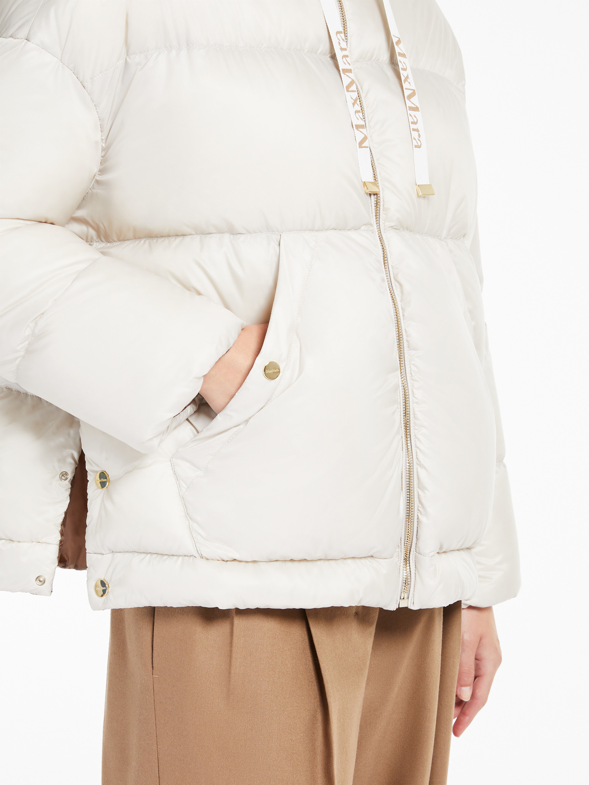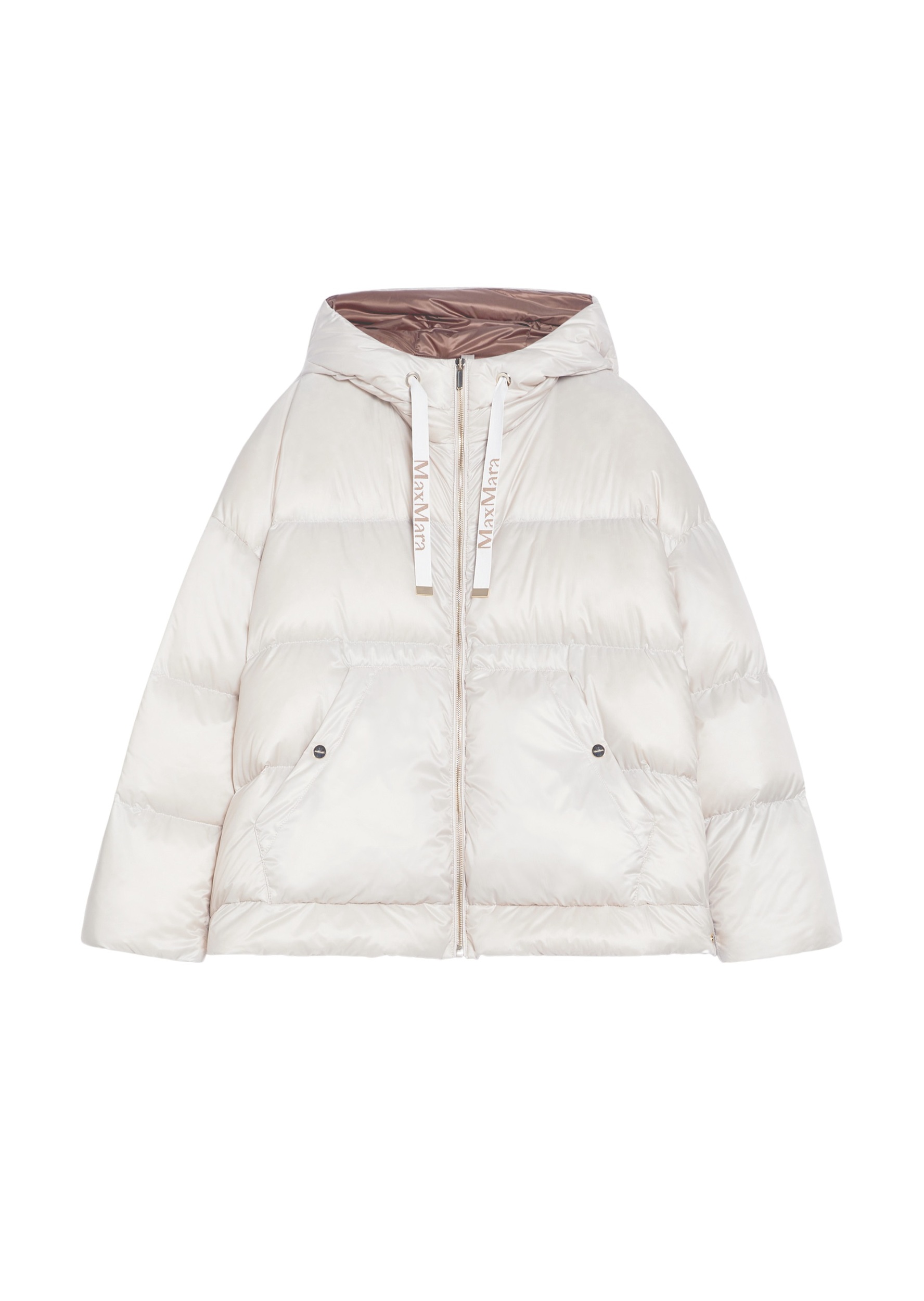 Пуховик з водовідштовхувальної технічної тканини, що переливається, набитий гусячим пухом і оброблений стьобаним візерунком в горизонтальні смуги. Модель має капюшон на шнурку з фірмовими жакардовими стрічками Max Mara, довгі рукави зі спущеними плечима та кишені-кенгуру спереду. Бічні розрізи з фірмовими металевими кнопками дозволяють носити їх відкритими або закритими, а також застібку-блискавку спереду.