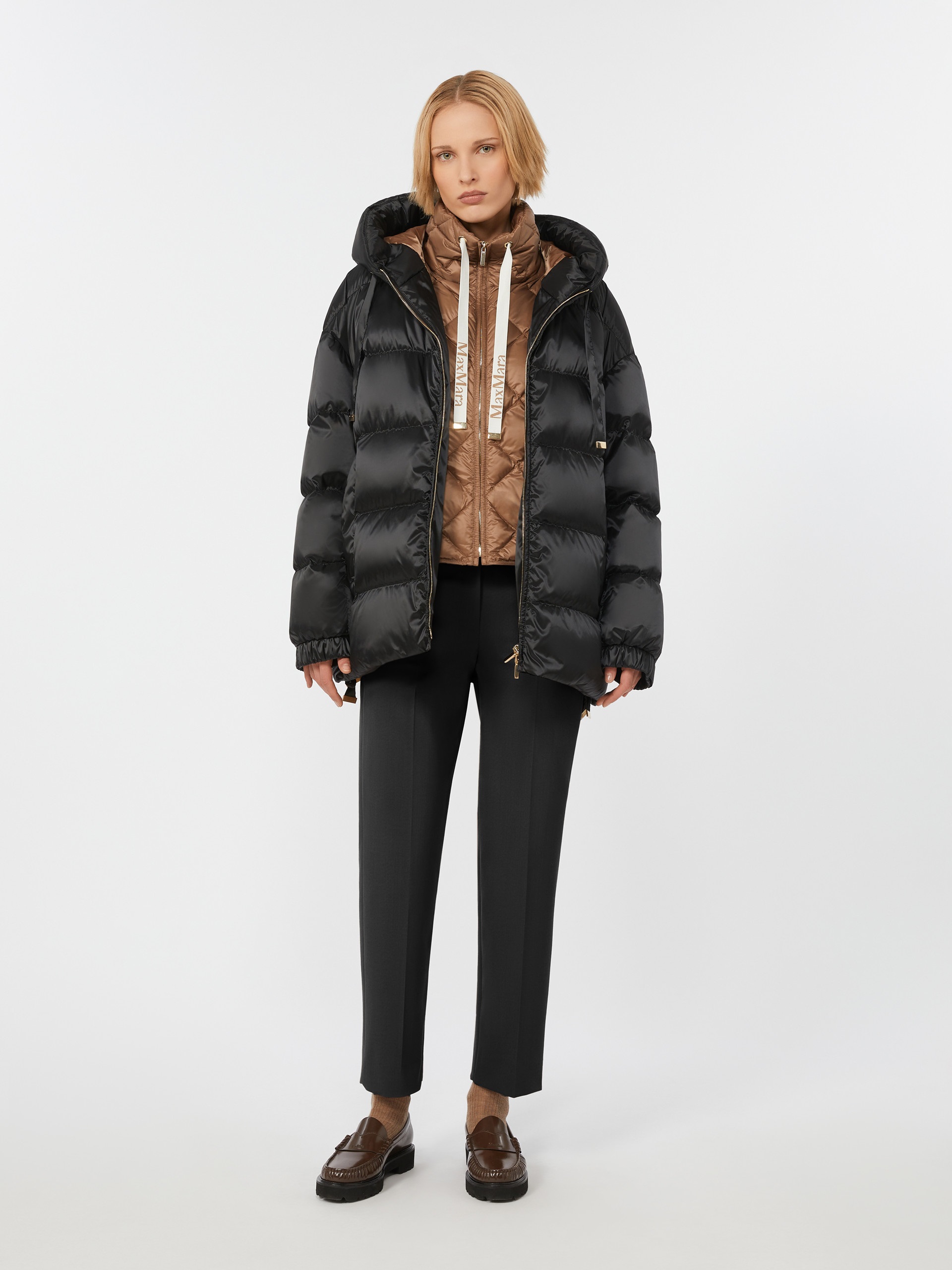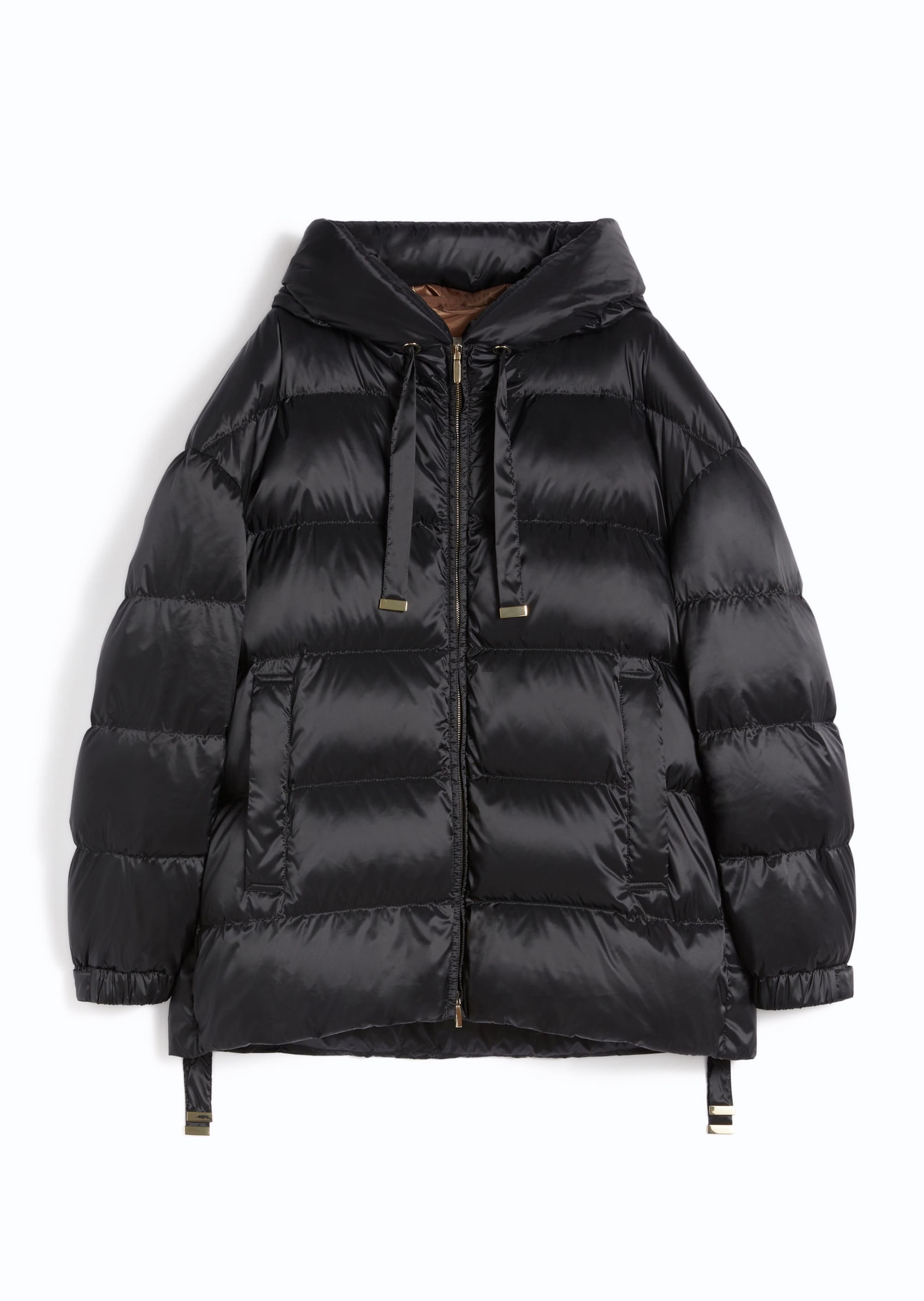 Пуховик Max Mara Cube у чорному кольорі, виготовлений із гладкого змішаного матеріалу. Сучасна текстура з легким шляхетним блиском підкреслює лаконічну естетику виробу. Прямий крій з об’ємним капюшоном, застібкою на блискавку та акуратними боковими кишенями формує бездоганний силует. Утеплена конструкція зберігає тепло, залишаючись легкою й повітряною. Поєднується з кашеміровими светрами, класичними брюками, трикотажними костюмами й шкіряним взуттям — універсальне доповнення до образів у стилі міської класики, мінімалізму та функціонального комфорту. Продумана база зимового гардероба: тепла, зручна та візуально вивірена.