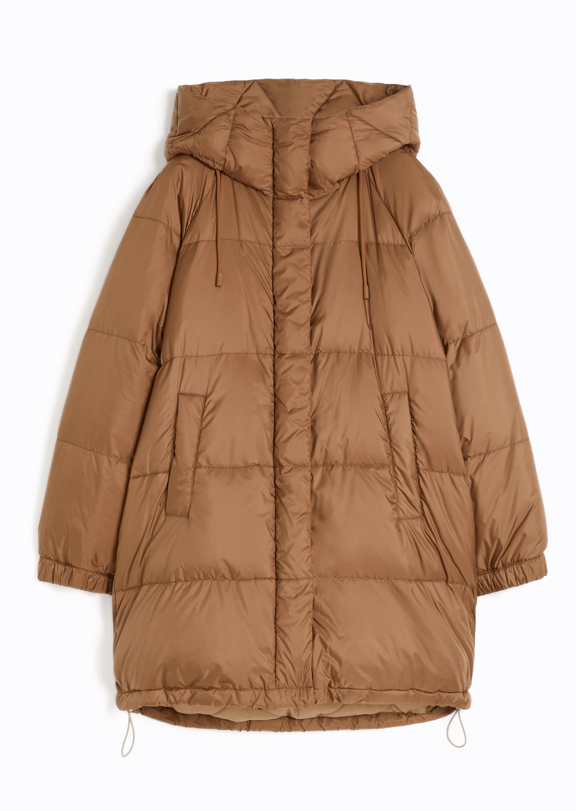 Подовжений пуховик Max Mara Weekend із щільного поліестеру з матовою поверхнею та утеплювачем, що забезпечує тепло й легкість. Модель прямого крою з капюшоном, застібкою-блискавкою та практичними боковими кишенями — поєднання функціональності та стриманої елегантності. Насичений коричневий відтінок підкреслює сучасний характер виробу. Поєднується з трикотажем, брюками вільного крою та міським взуттям — ідеальна база для повсякденних і демісезонних образів.