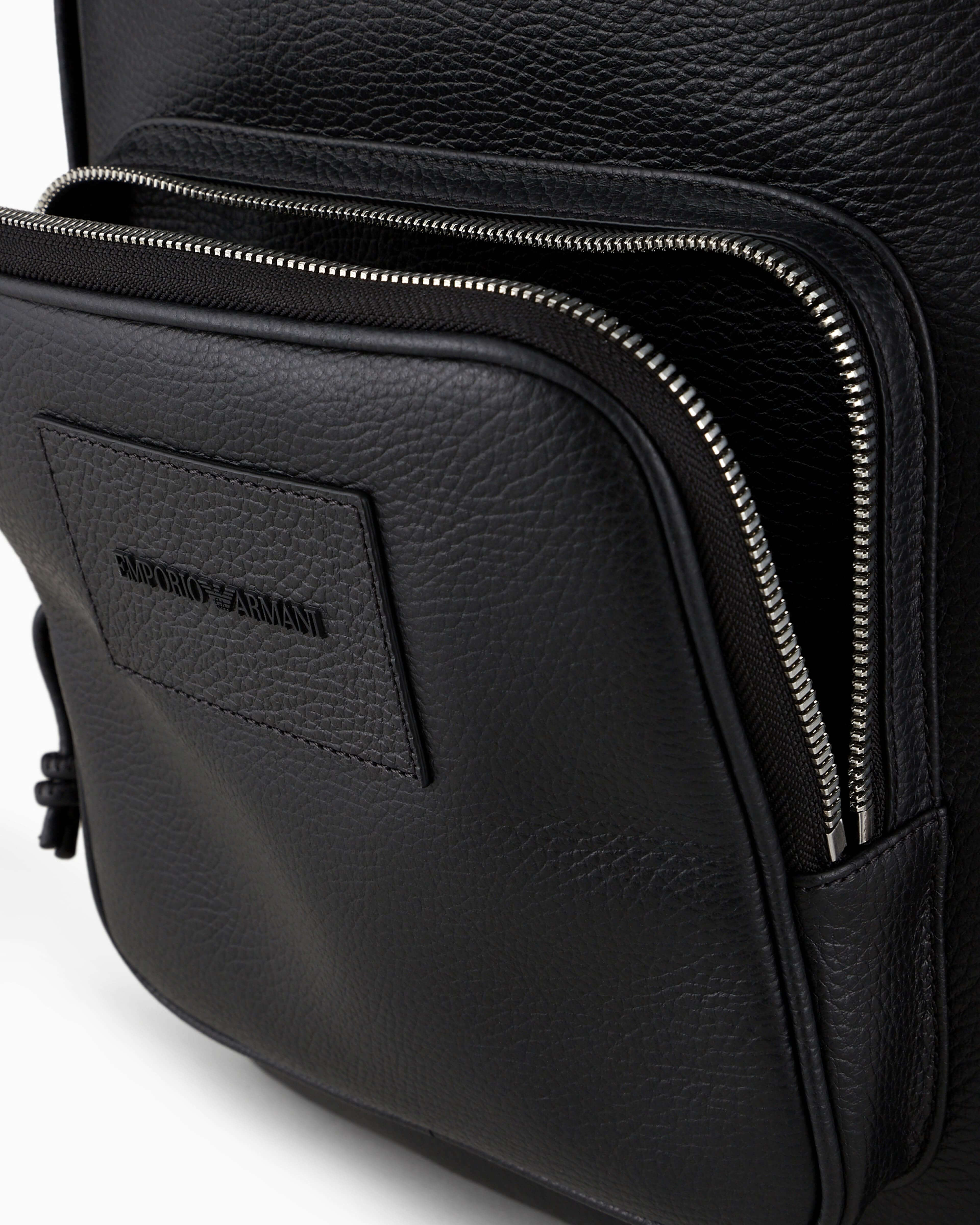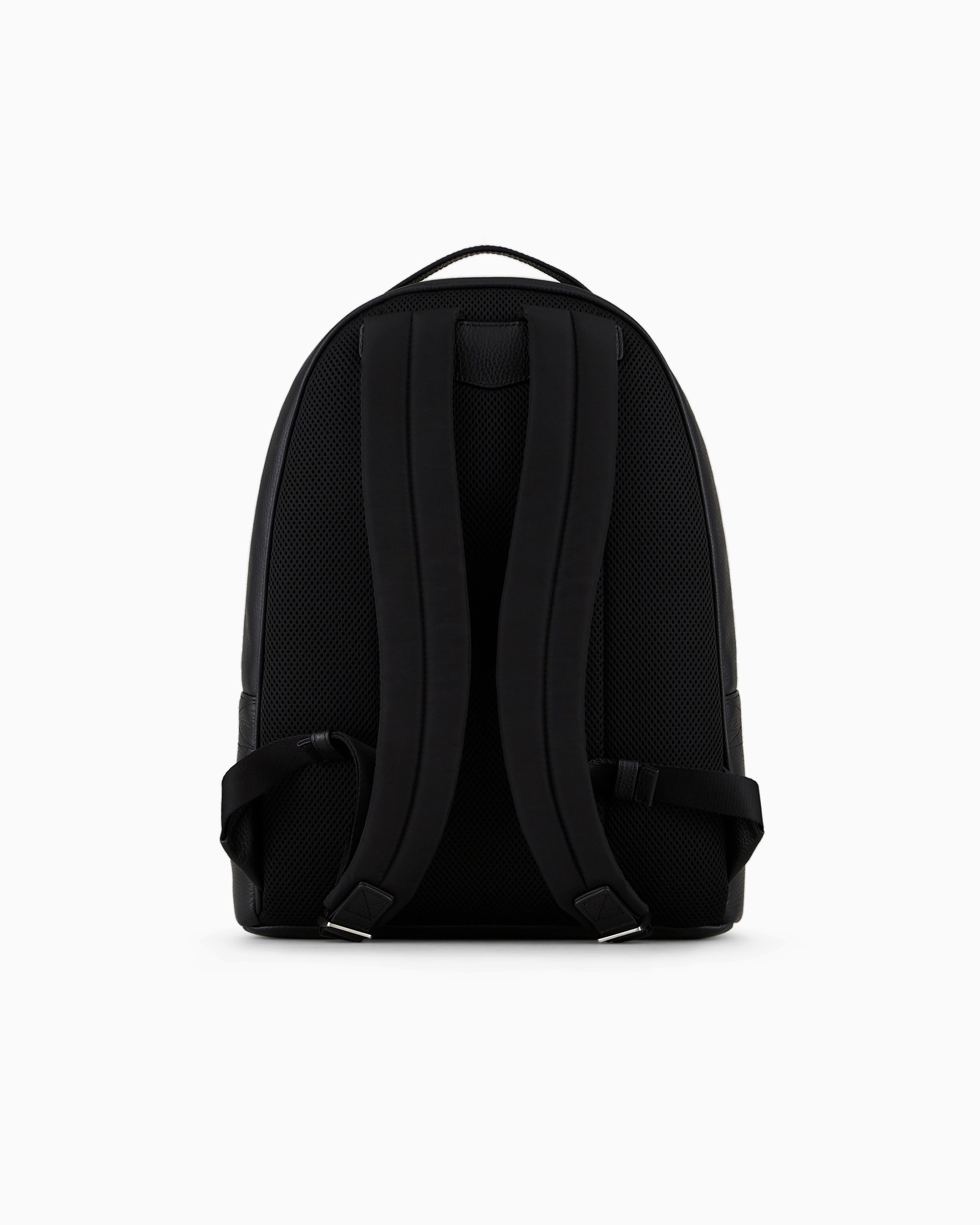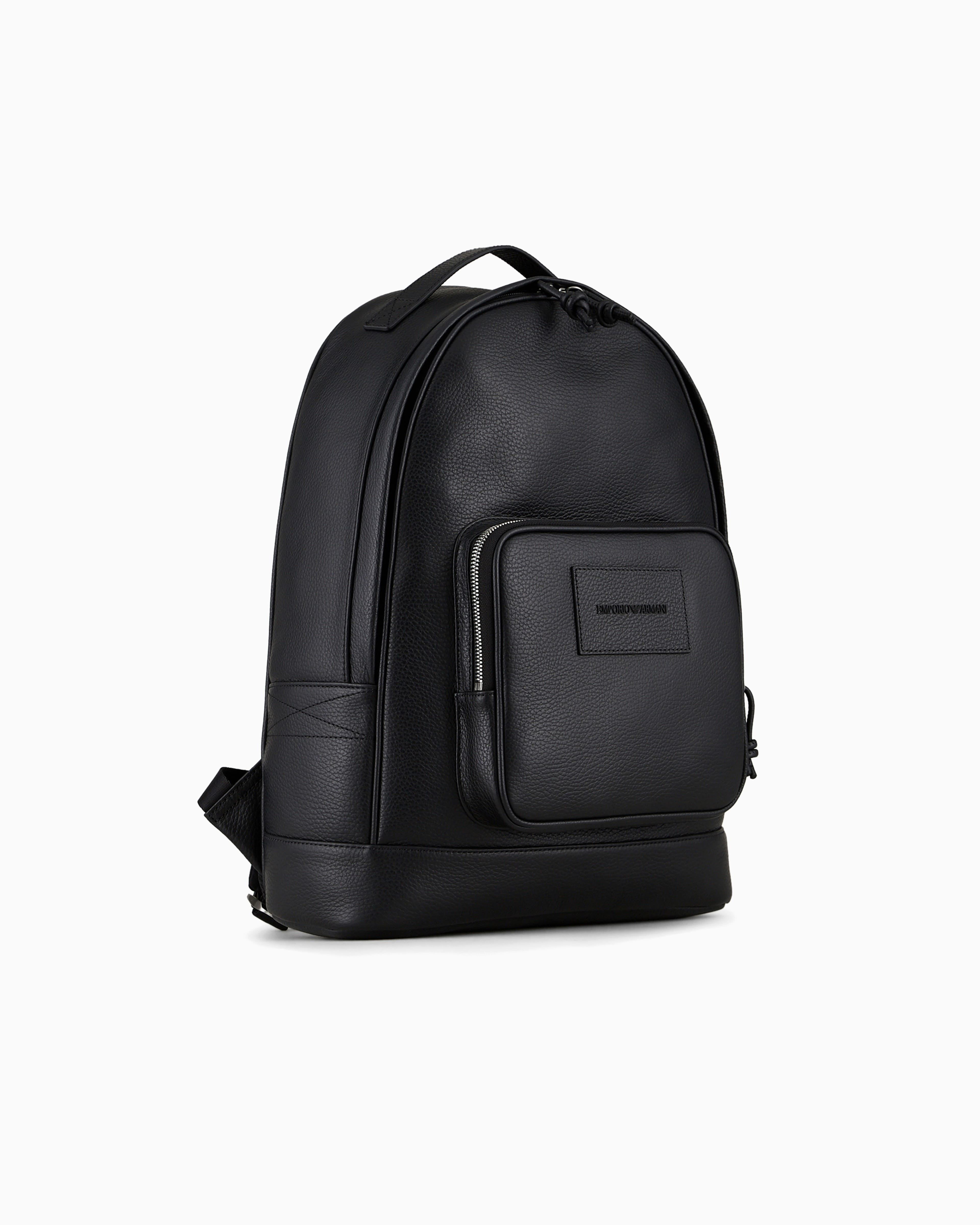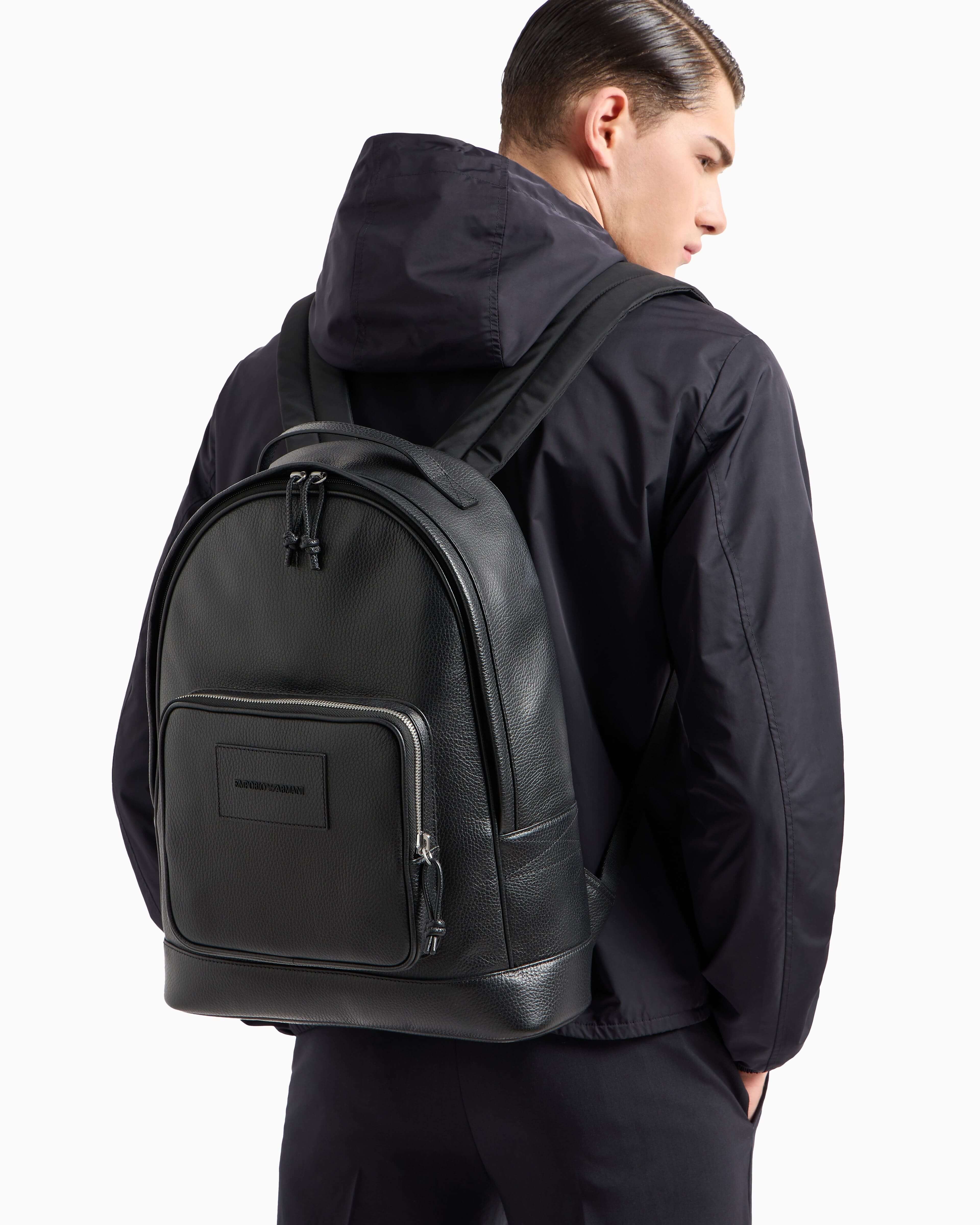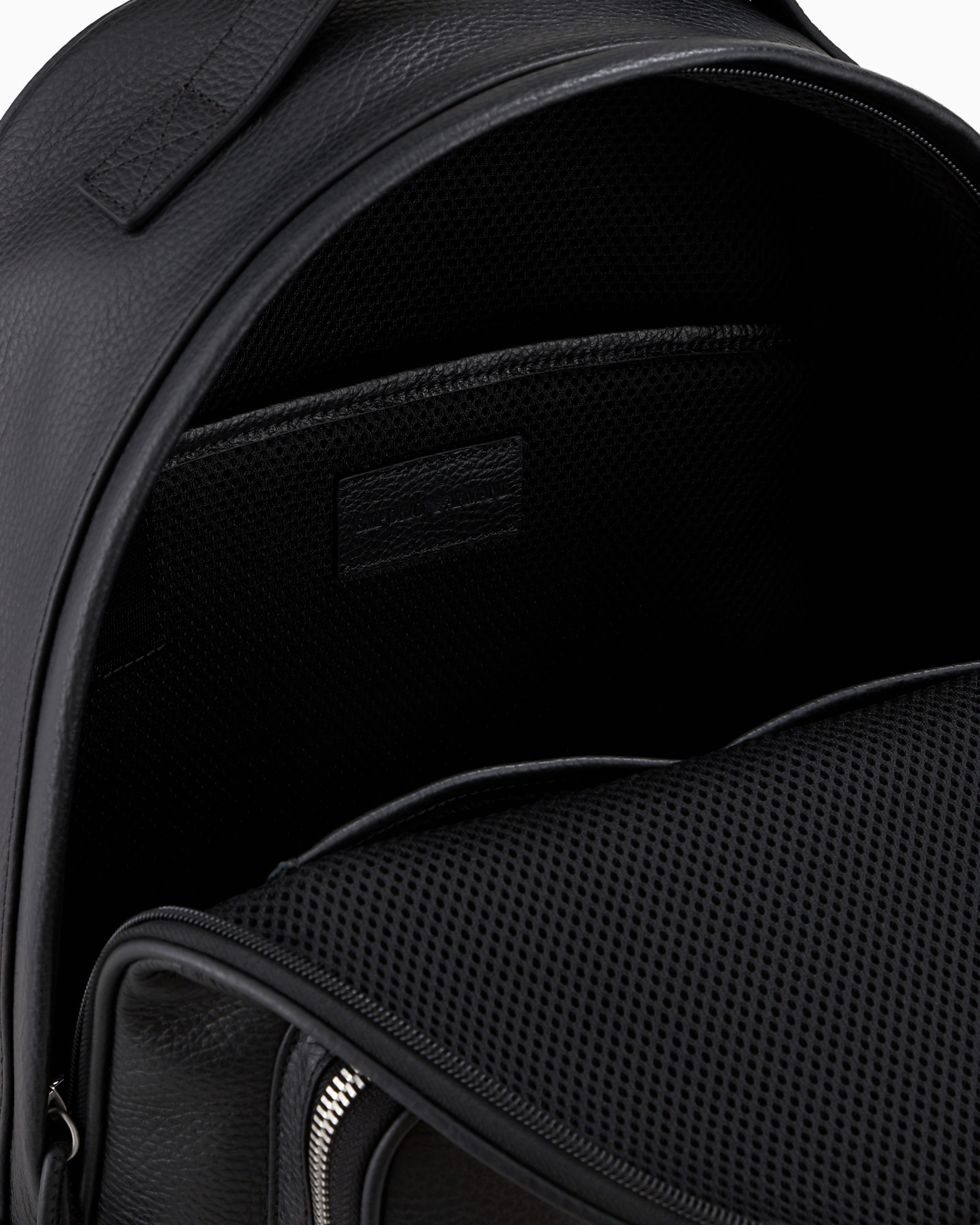 Чорний шкіряний рюкзак округлої форми з верхньою ручкою, зовнішньою кишенею на блискавці та дихаючою сіткою на спинці. Виготовлений із м’якої фактурної шкіри та доповнений об’ємним логотипом на шкіряній нашивці в тон. Чіткі лінії та лаконічний силует надають виробу універсальності та вишуканості. Належить до лінійки Essentials — позачасової капсули Emporio Armani, що поєднує практичність і стиль поза сезонами.