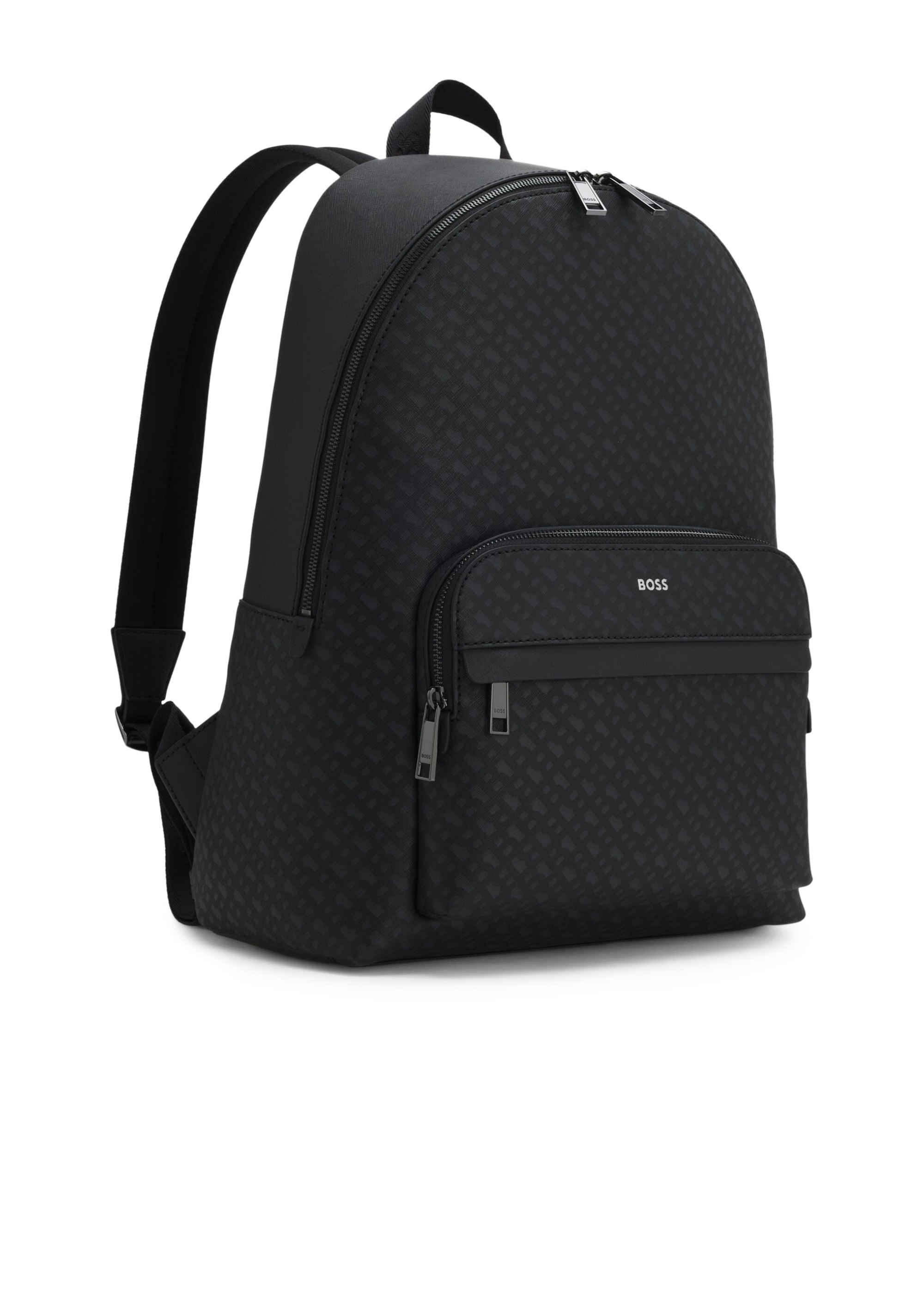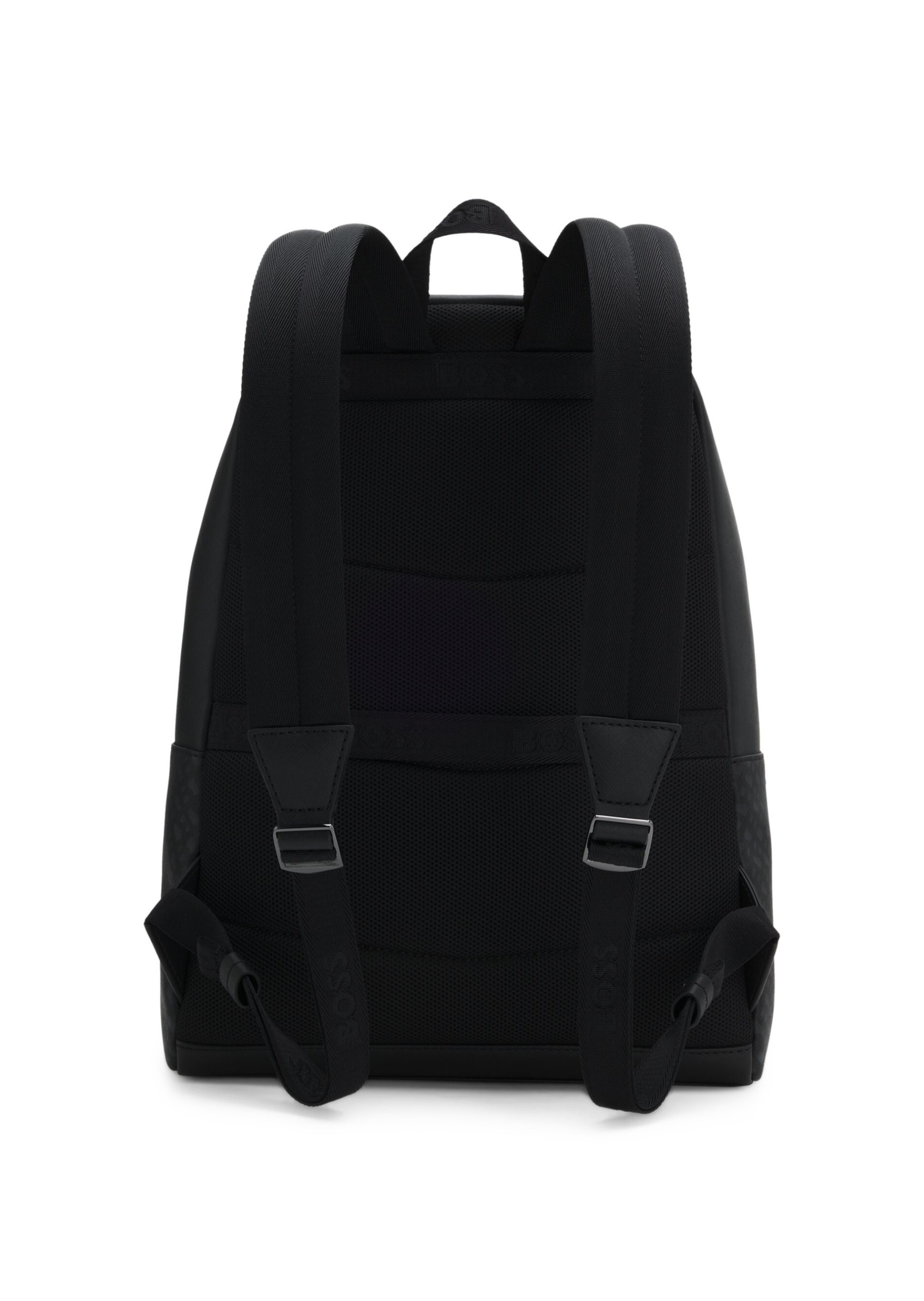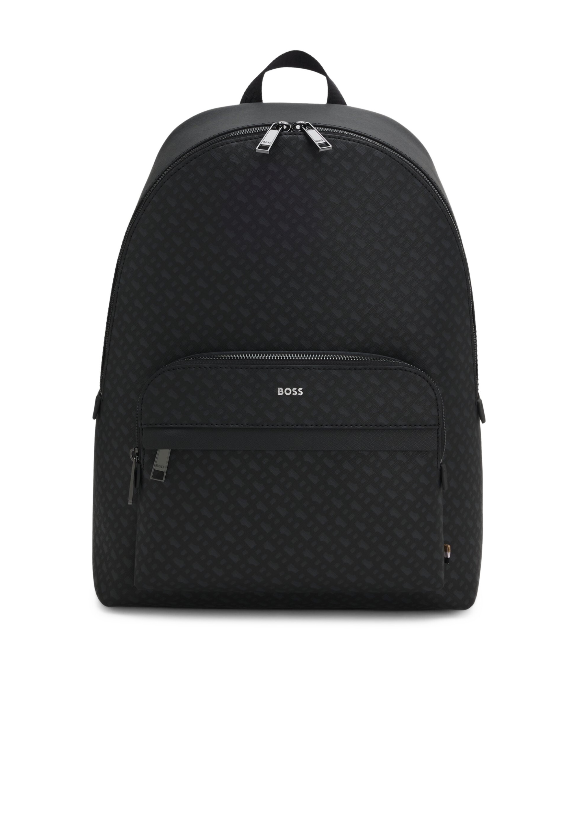 Рюкзак BOSS чорного кольору з тональним візерунком виготовлений із високоякісної тканини з водовідштовхувальним покриттям, що забезпечує захист від вологи й довговічність. Передня кишеня на блискавці додає функціональності, а задній елегантний рукав дозволяє комфортно носити аксесуар. Сріблястий логотип BOSS підкреслює преміальний характер виробу. Легко поєднується з повсякденним і діловим стилем, додаючи образу сучасний акцент. Універсальне рішення для тих, хто цінує стиль і практичність.