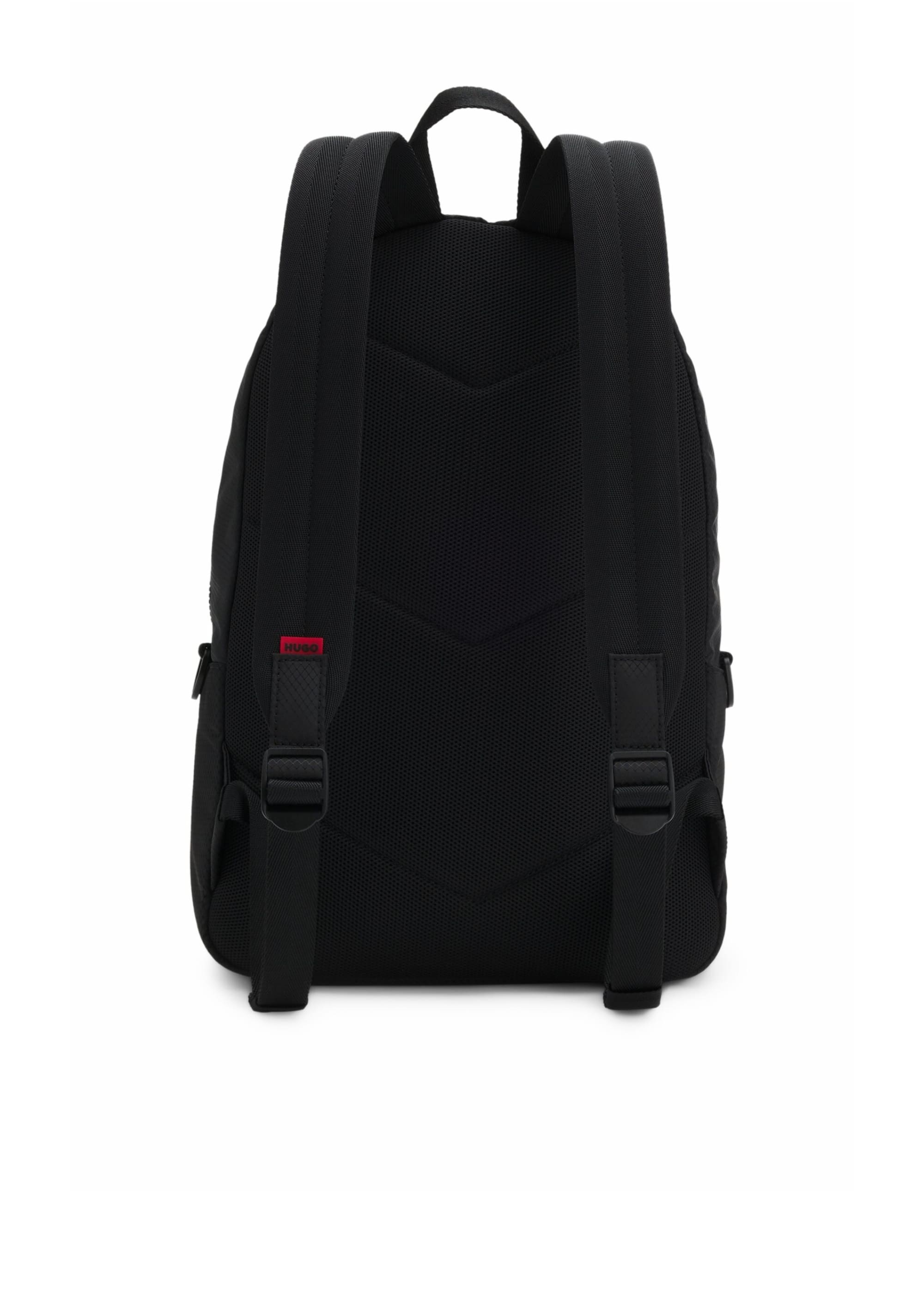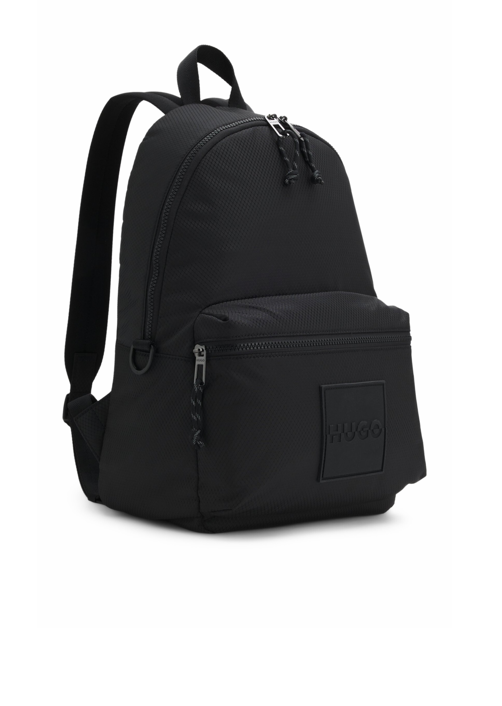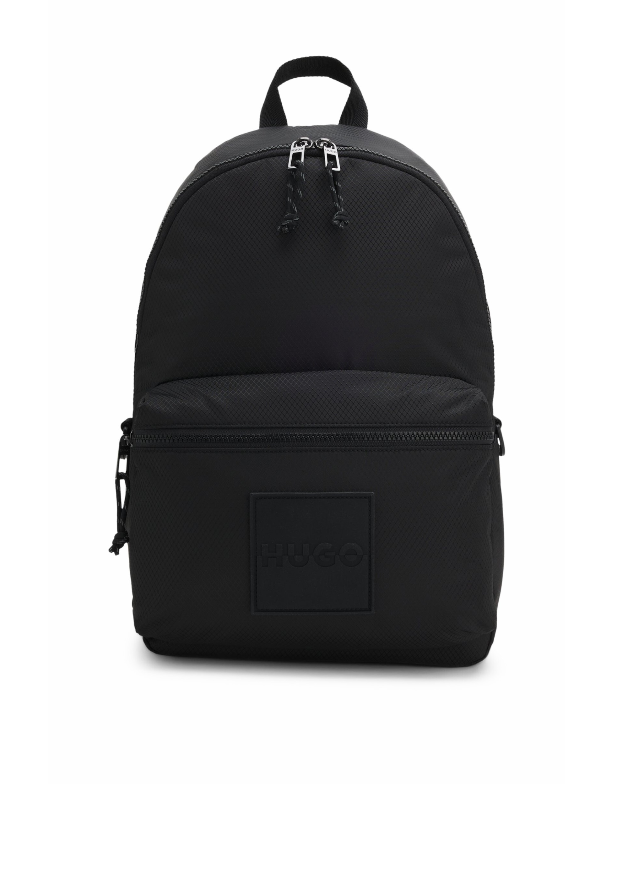 Рюкзак HUGO чорного кольору створений з ріпстопної тканини з ромбовидною фактурою, що забезпечує структуру й зносостійкість. Велика силіконова нашивка з логотипом split‑logo додає виразний фірмовий акцент. Внутрішня кишеня на блискавці, верхня ручка‑вейвілка та фурнітура в теплом gunmetal відтінку підсилюють практичність і шарм. Виготовлений з переробленого поліестеру — рюкзак відображає екологічну свідомість і сучасне мислення. Рюкзак слугує стильною й функціональною базою для повсякденного образу, де мінімалізм гармонійно поєднується з характером.