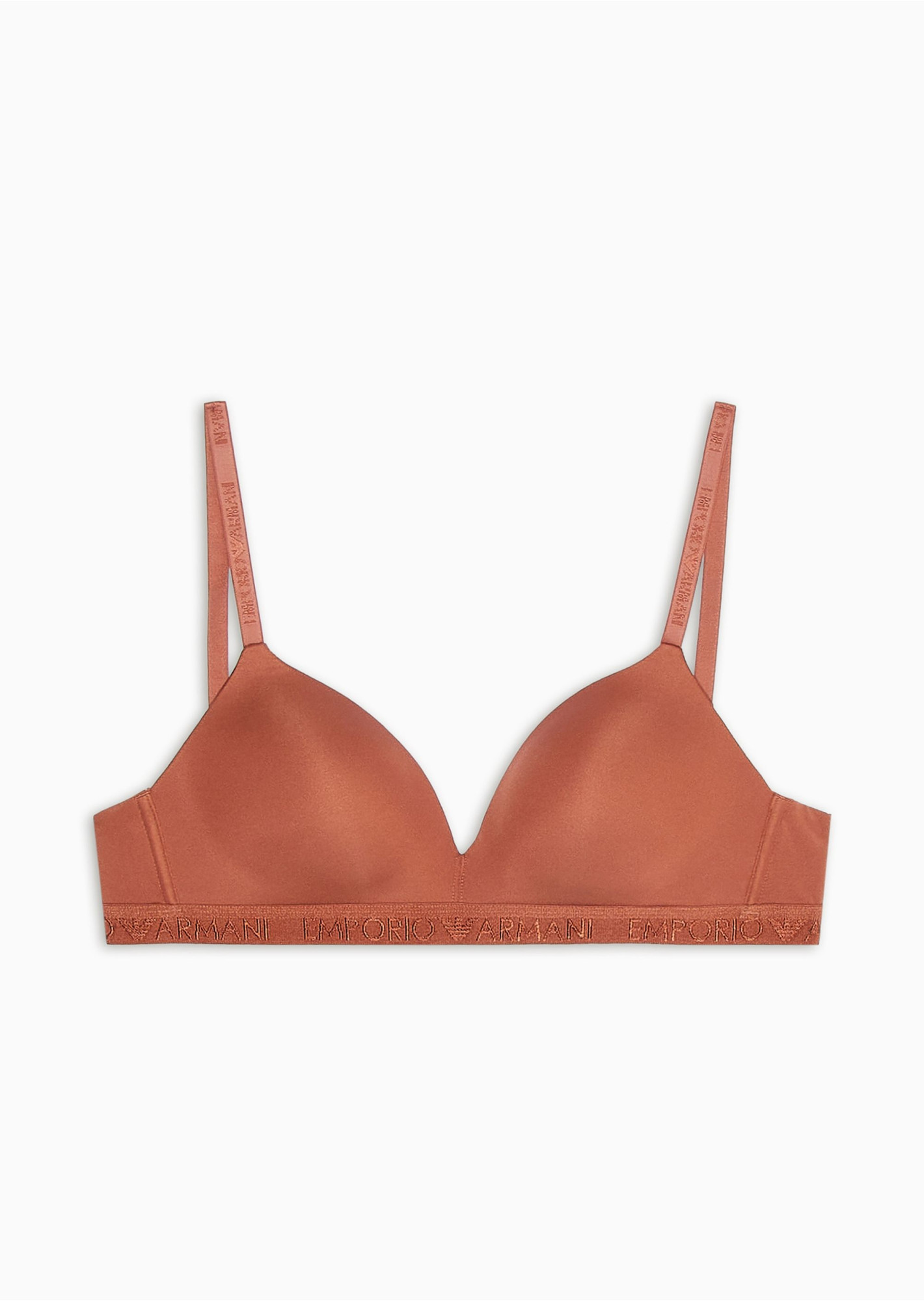 Мягкий треугольный бюстгальтер с регулируемыми бретелями из блестящей ткани из микрофибры и эластичной лентой с логотипом. Изготовлен из сертифицированного переработанного нейлона, поддерживающего циклическое производство с пониженным воздействием на окружающую среду.