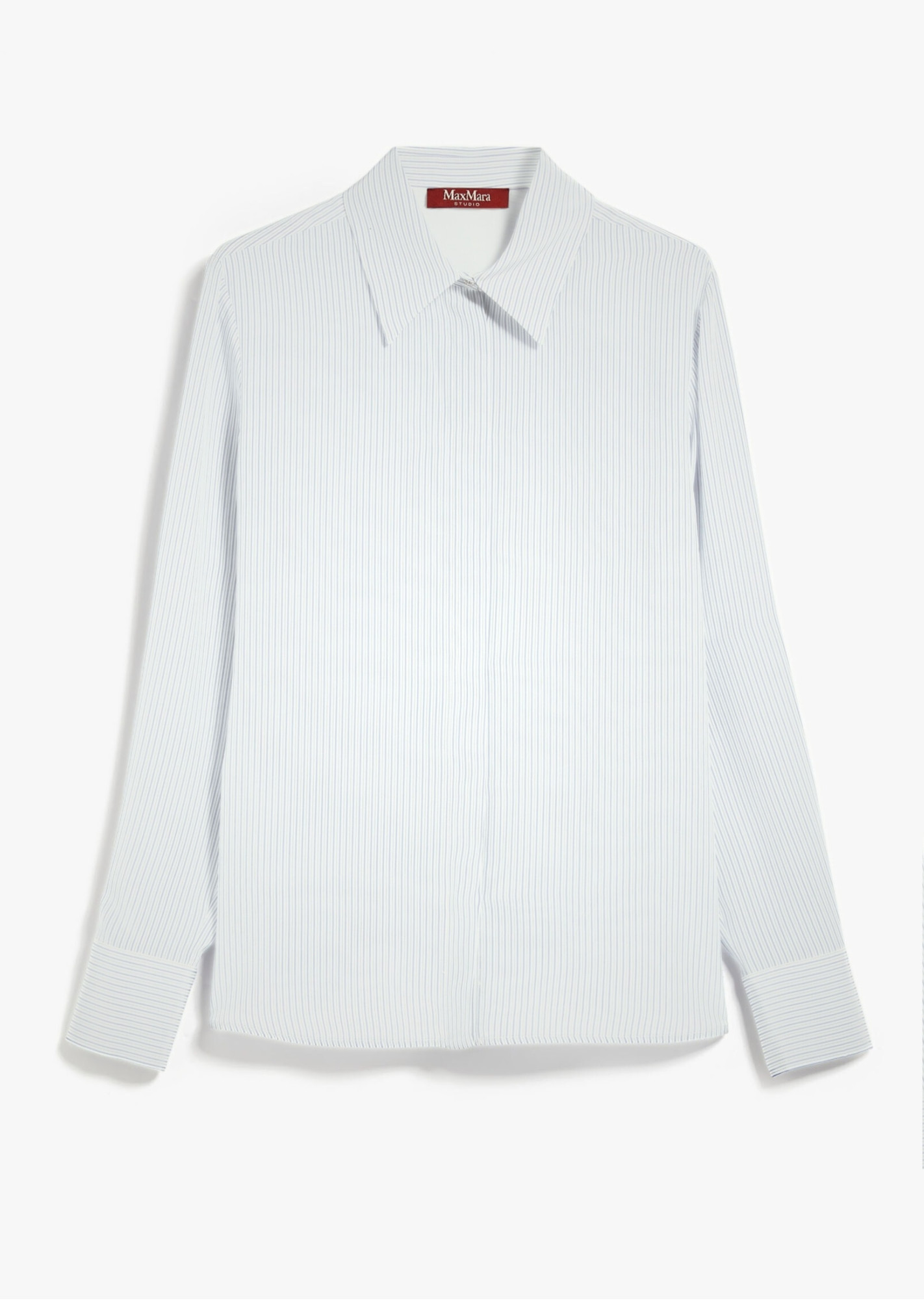 Рубашка мужского стиля из роскошного крепа с полосатым мотивом и небольшими пуговицами на воротнике и манжетах. Изделие имеет классический воротник, длинные прошитые рукава и закругленный низ с разрезами по бокам. Скрытая застежка на пуговицы.