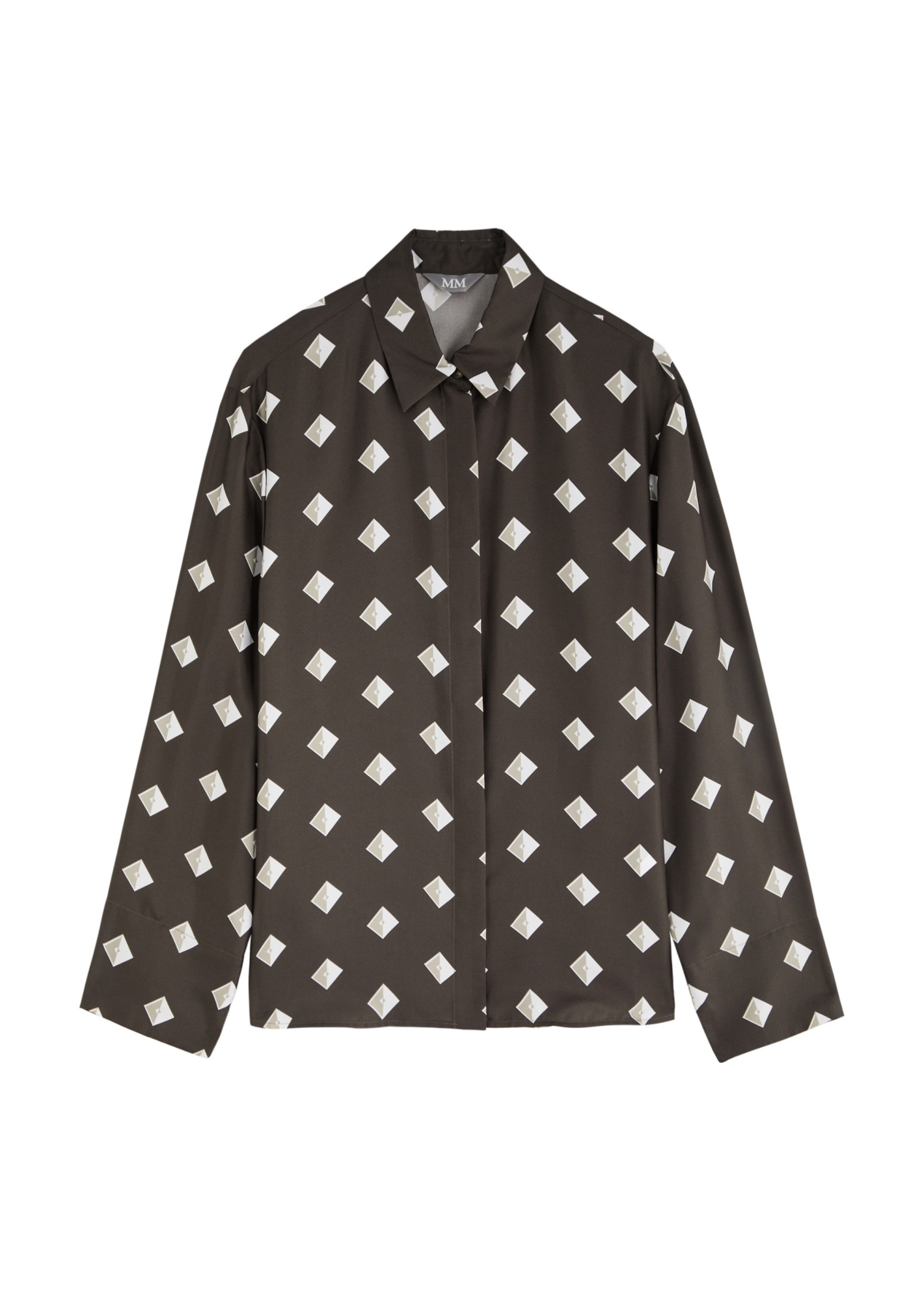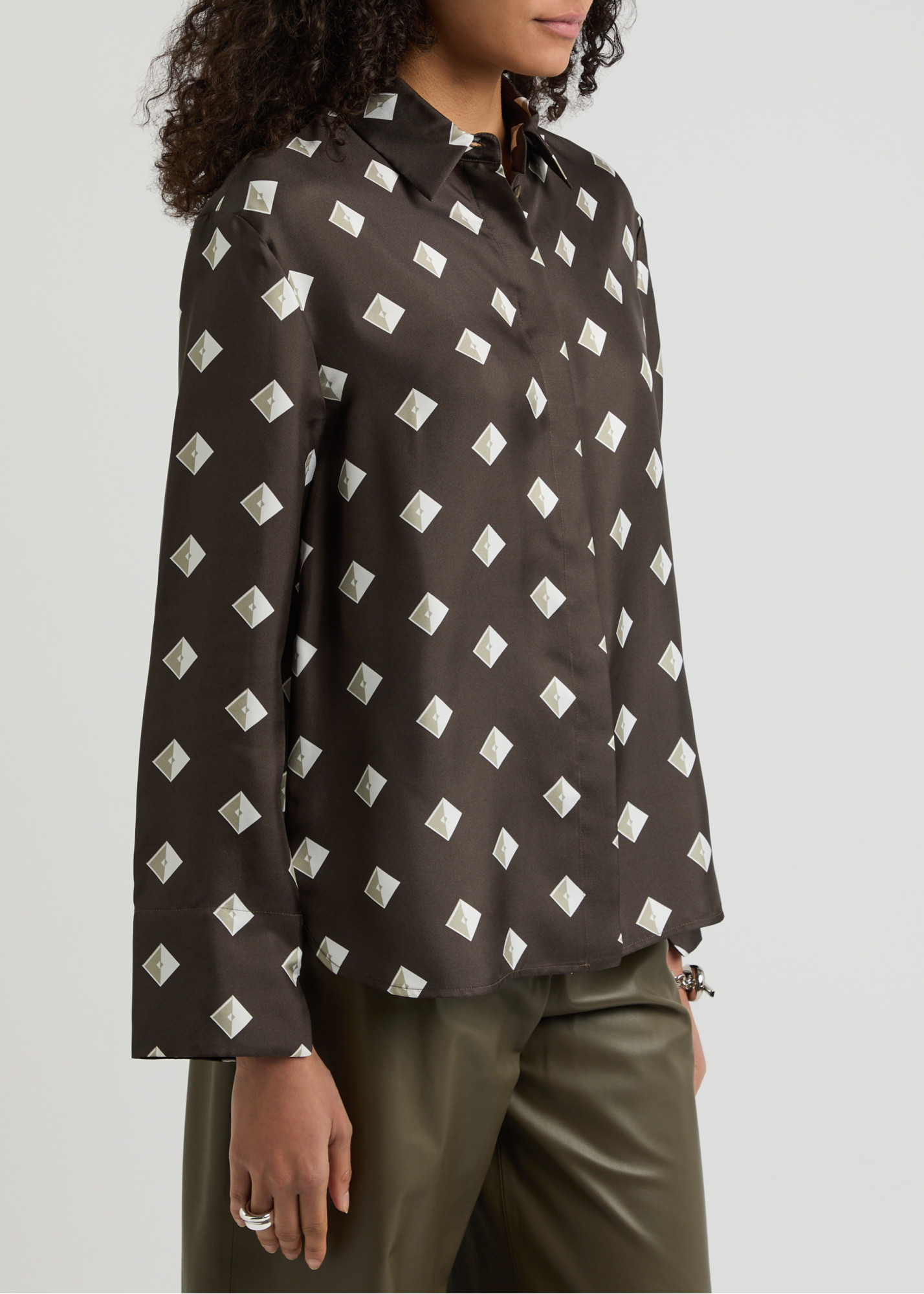 Шелковая блуза свободного кроя изготовлена из шелкового твила шоколадного цвета с жаккардовым рисунком в виде ромбов. Модель с острым рубашечным воротником, длинными рукавами и застежкой на пуговицы.