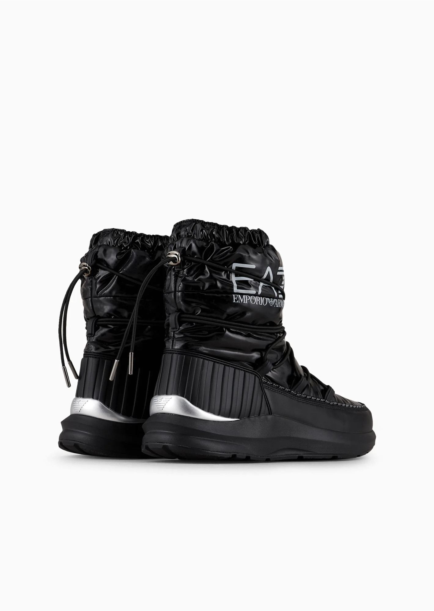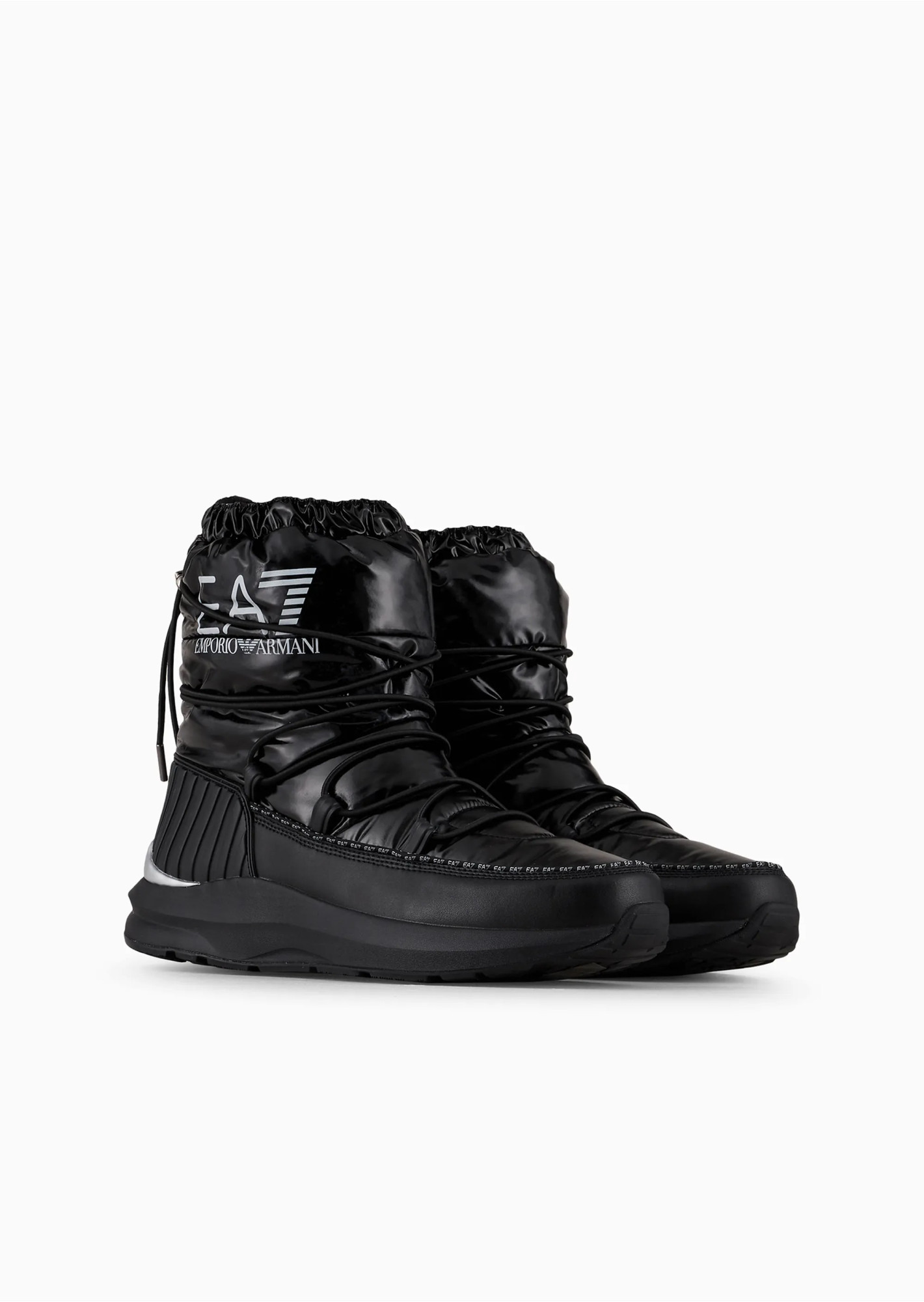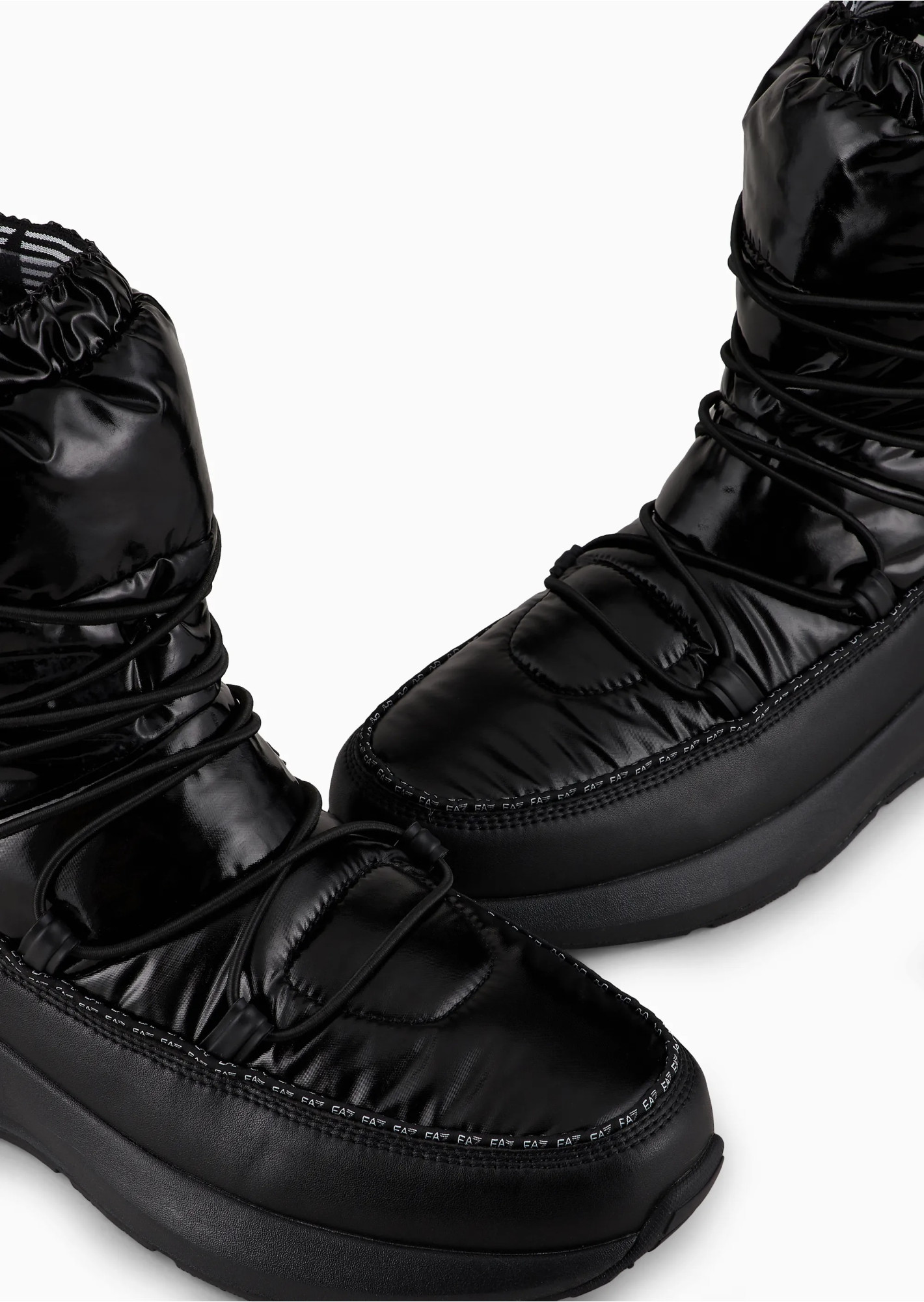 Ботинки для лыжного спорта из технической ткани с контрастным логотипом большого размера и обволакивающим округлым фасоном. Этот стиль имеет крест-накрест шнуровку спереди и резиновую подошву на платформе для идеального сцепления.