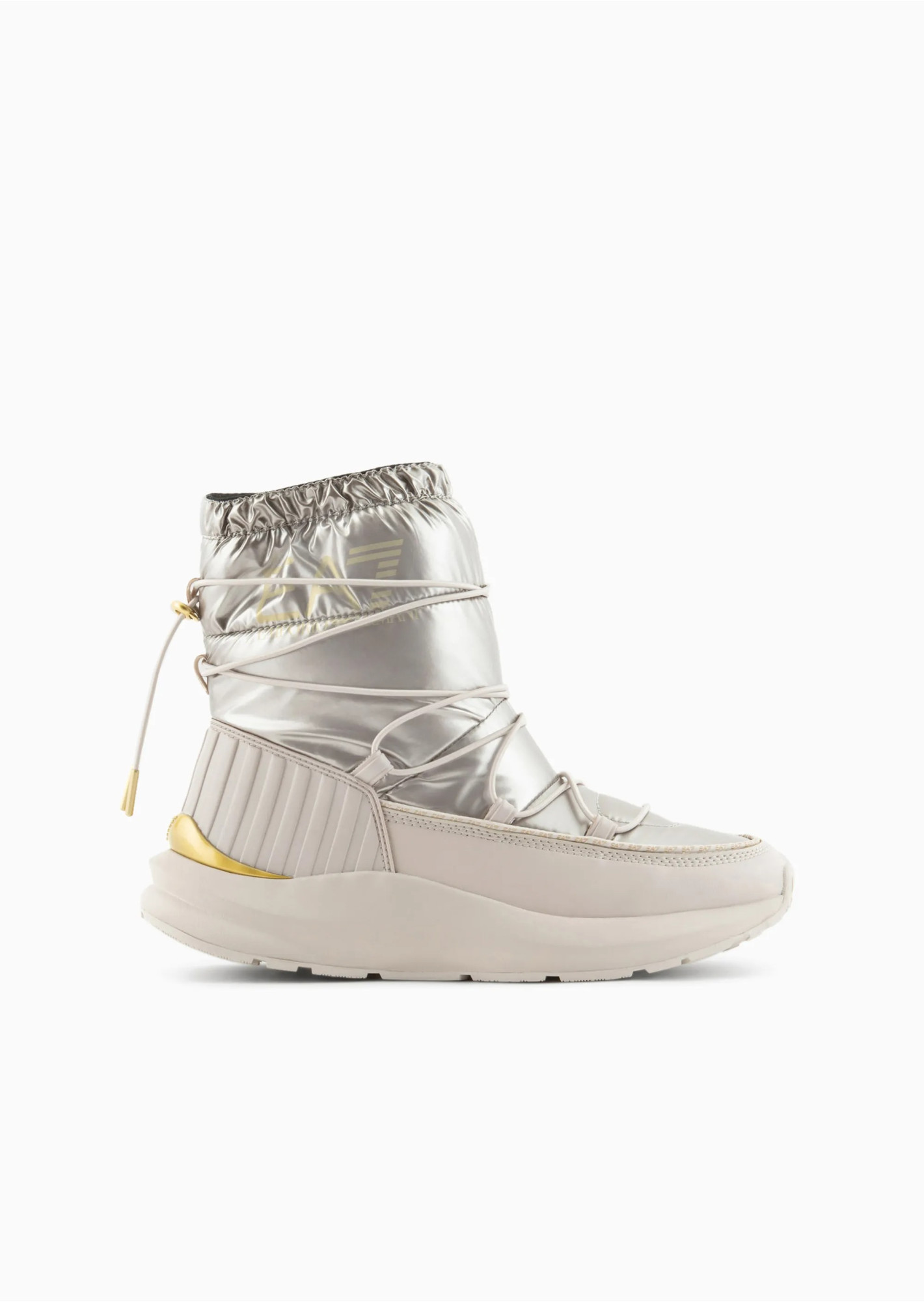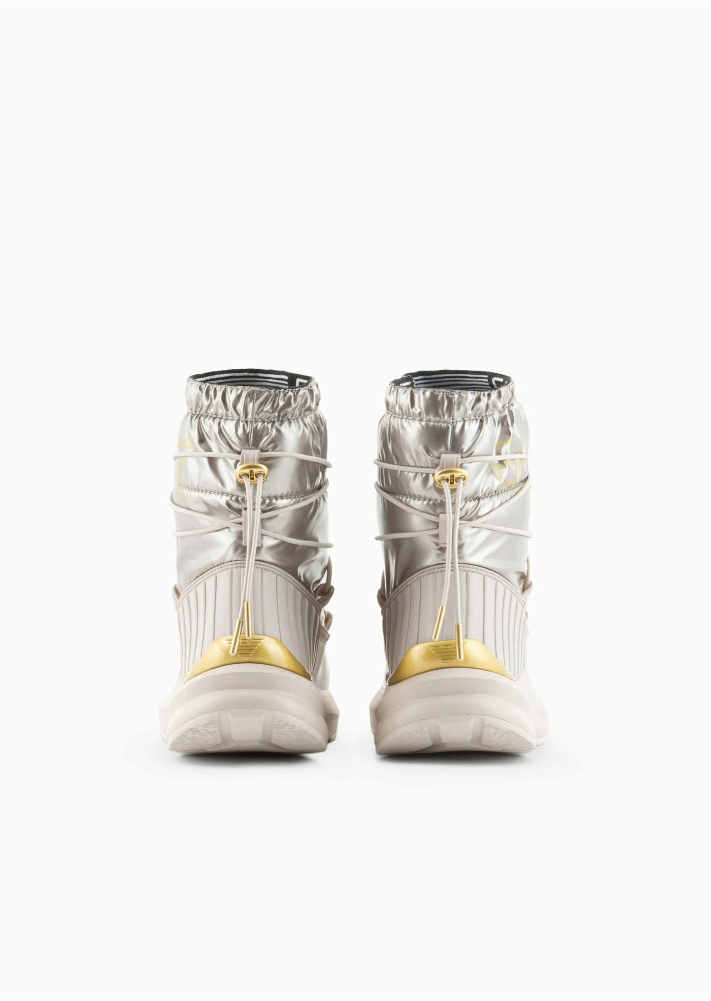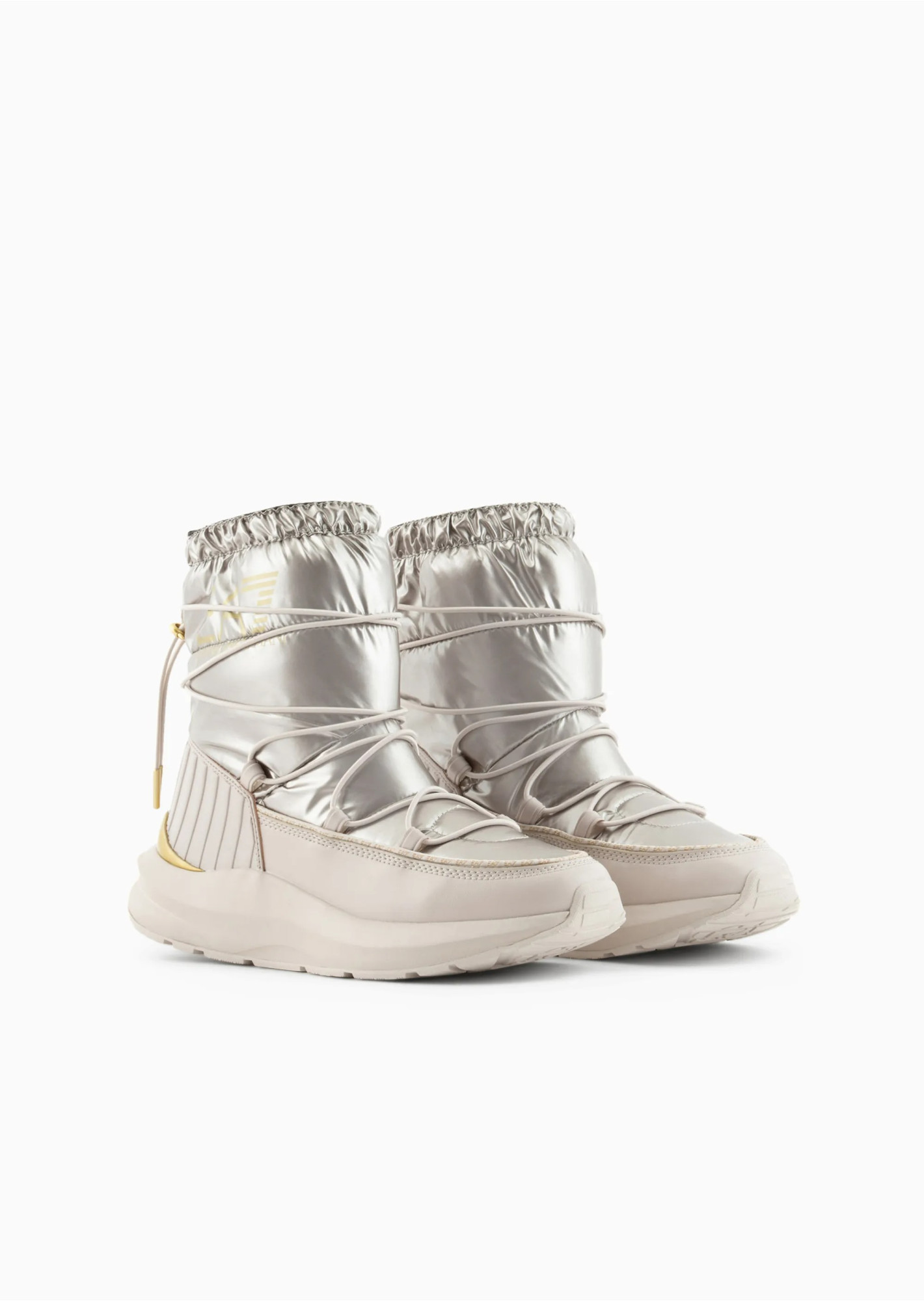 Ботинки для лыжного спорта из технической ткани с контрастным логотипом большого размера и обволакивающим округлым фасоном. Этот стиль имеет крест-накрест шнуровку спереди и резиновую подошву на платформе для идеального сцепления.