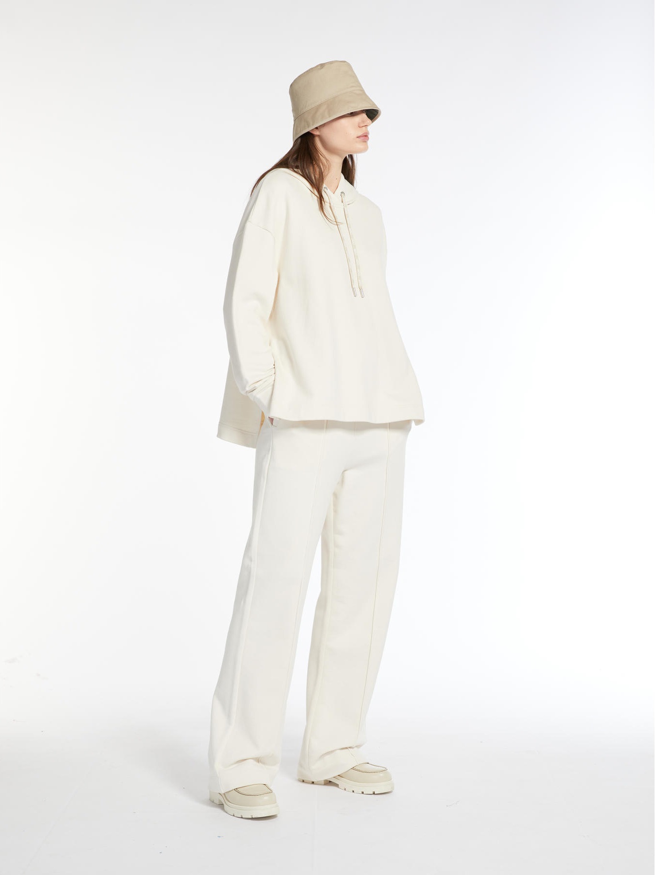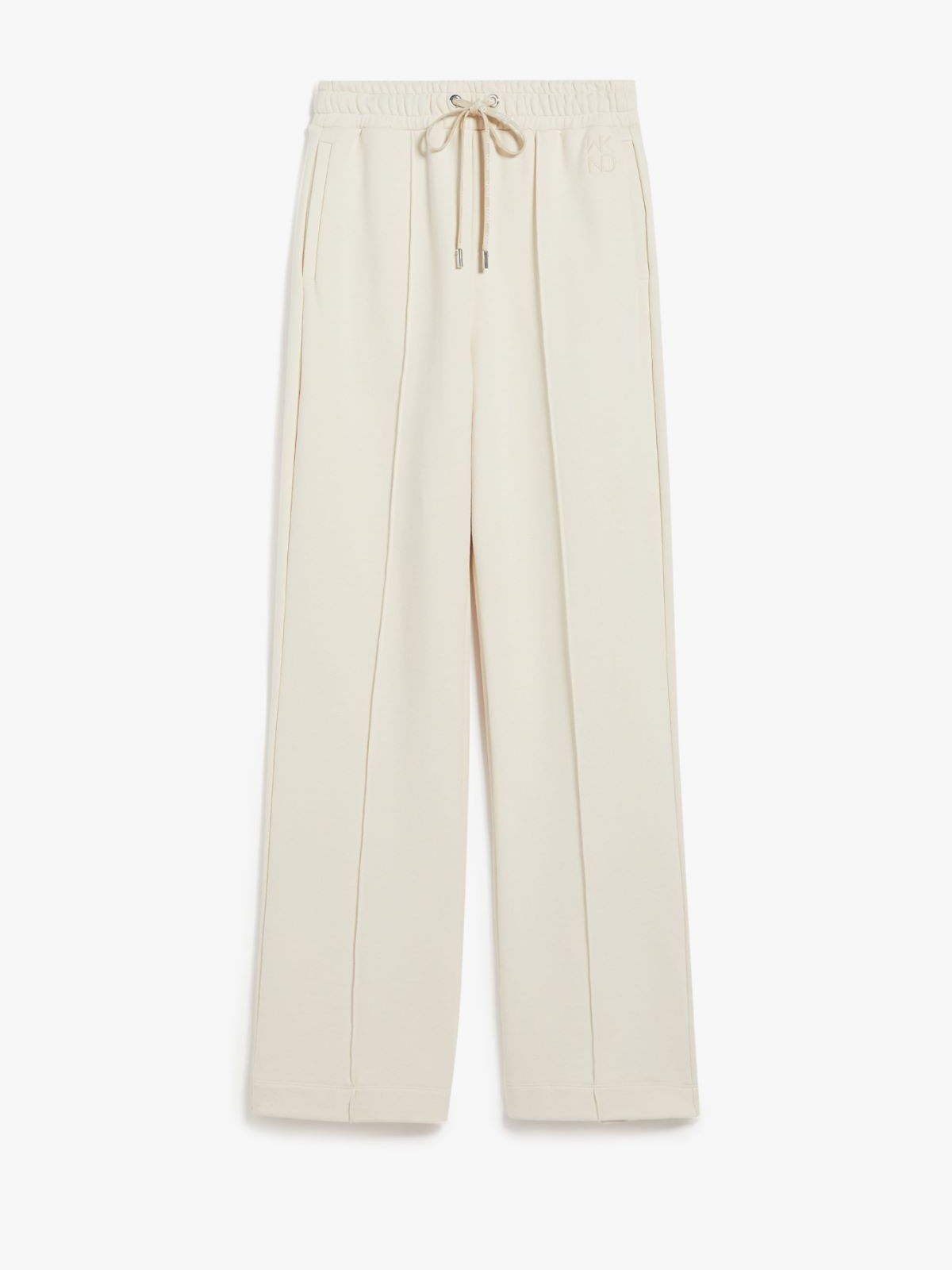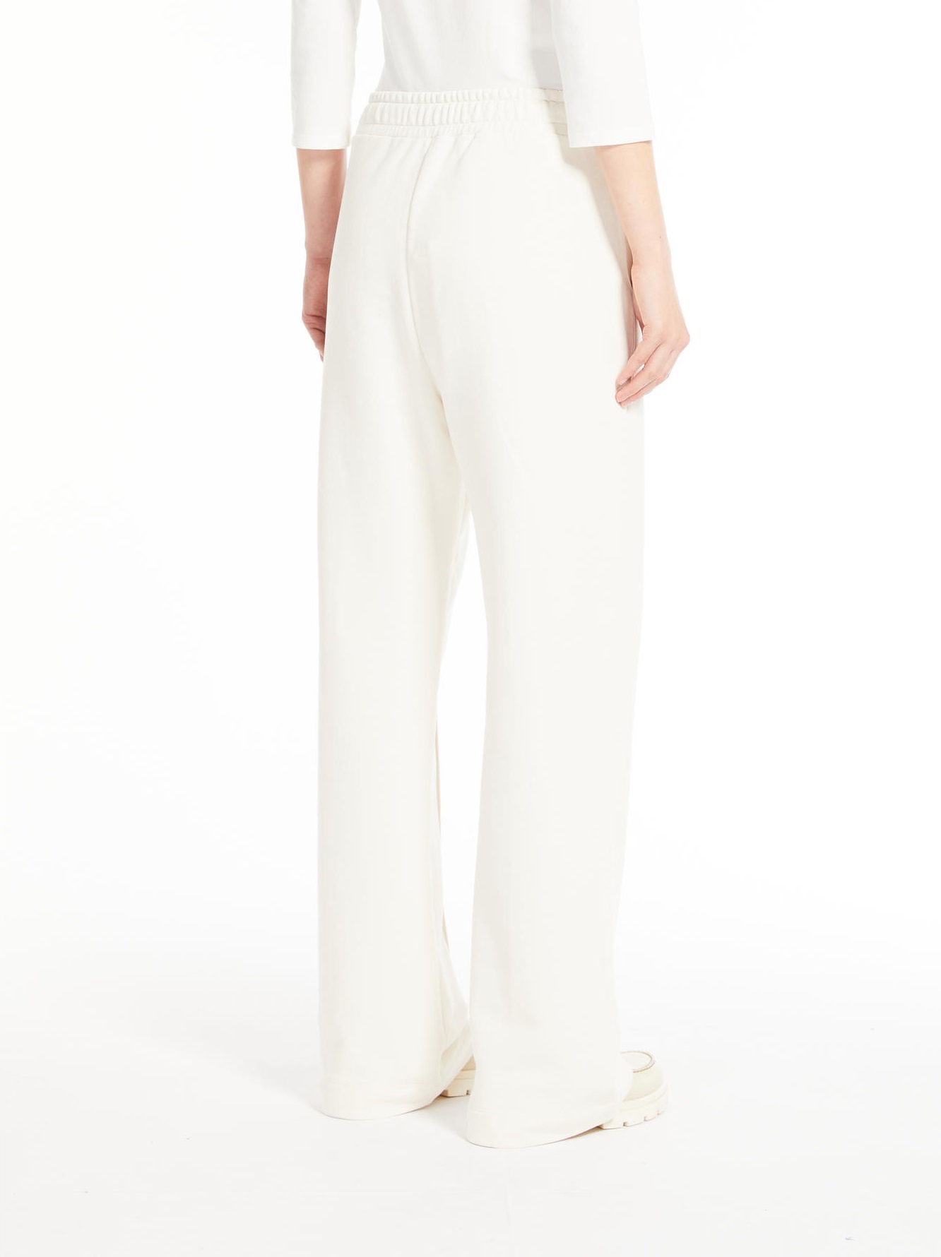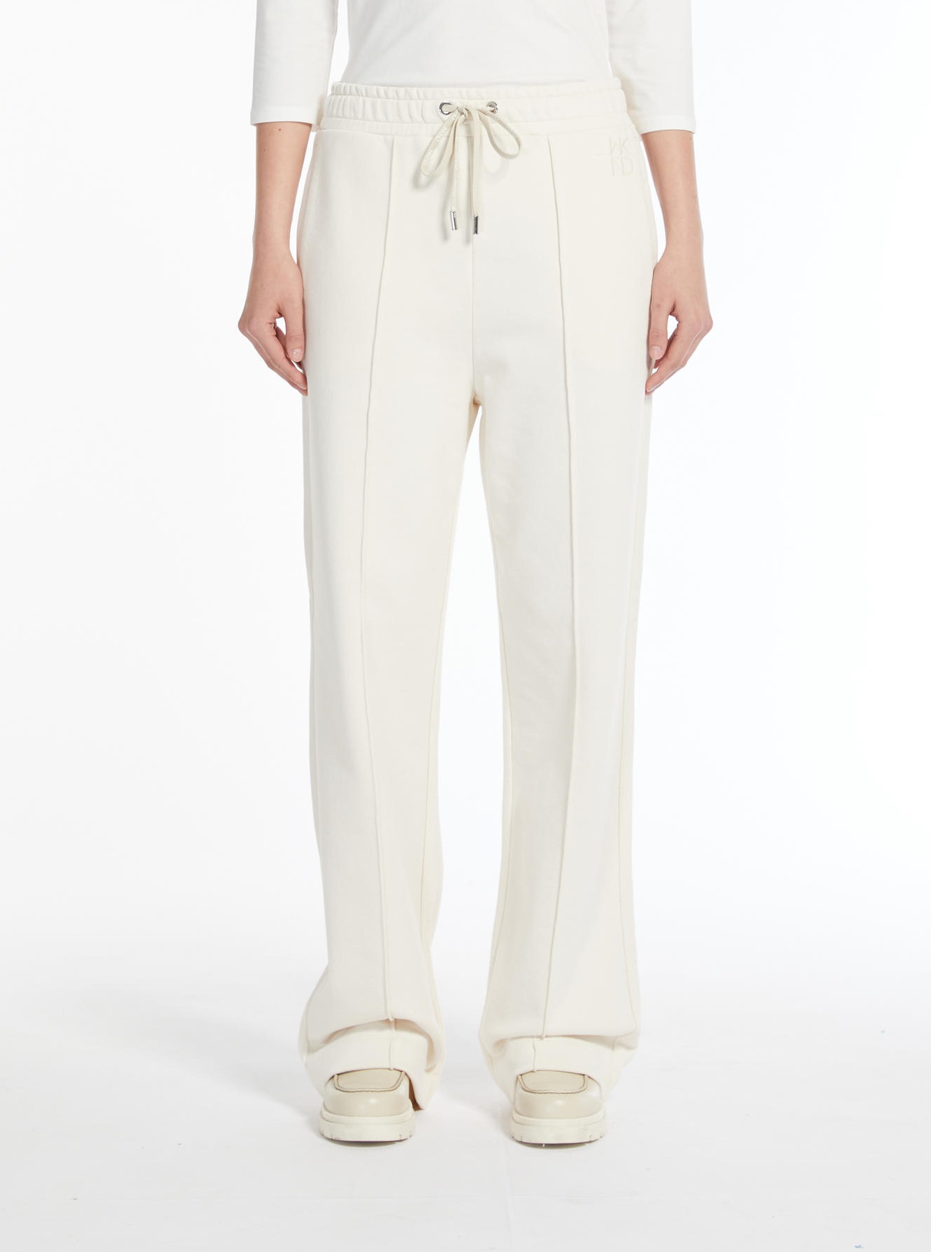 Брюки из мягкого флиса из органического хлопка имеют прямые штанины и регулируемый эластичный пояс на шнурке. Модель имеет косые боковые карманы, штампованную складку и логотип Weekend Max Mara сбоку.