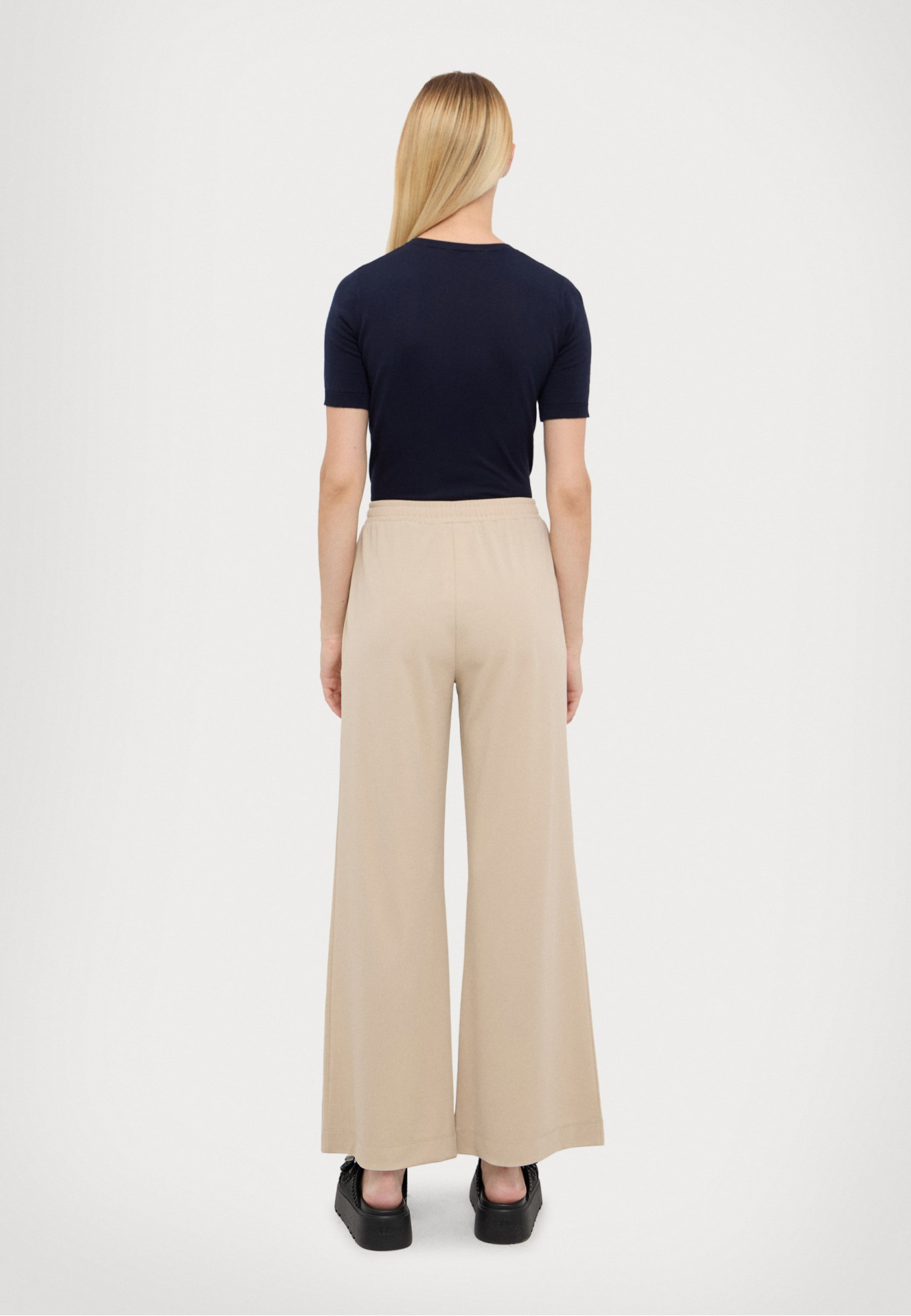 Брюки из коллекции Max Mara Leisure – комфортная и стильная одежда. Модель имеет серебристые вискозные полосы по бокам, накладной карман сзади с логотипом бренда, эластичную талию с регулируемыми шнурками и манжеты. Брюки приятны на ощупь, прекрасно комбинируются с другой одеждой от Max Mara Leisure.
