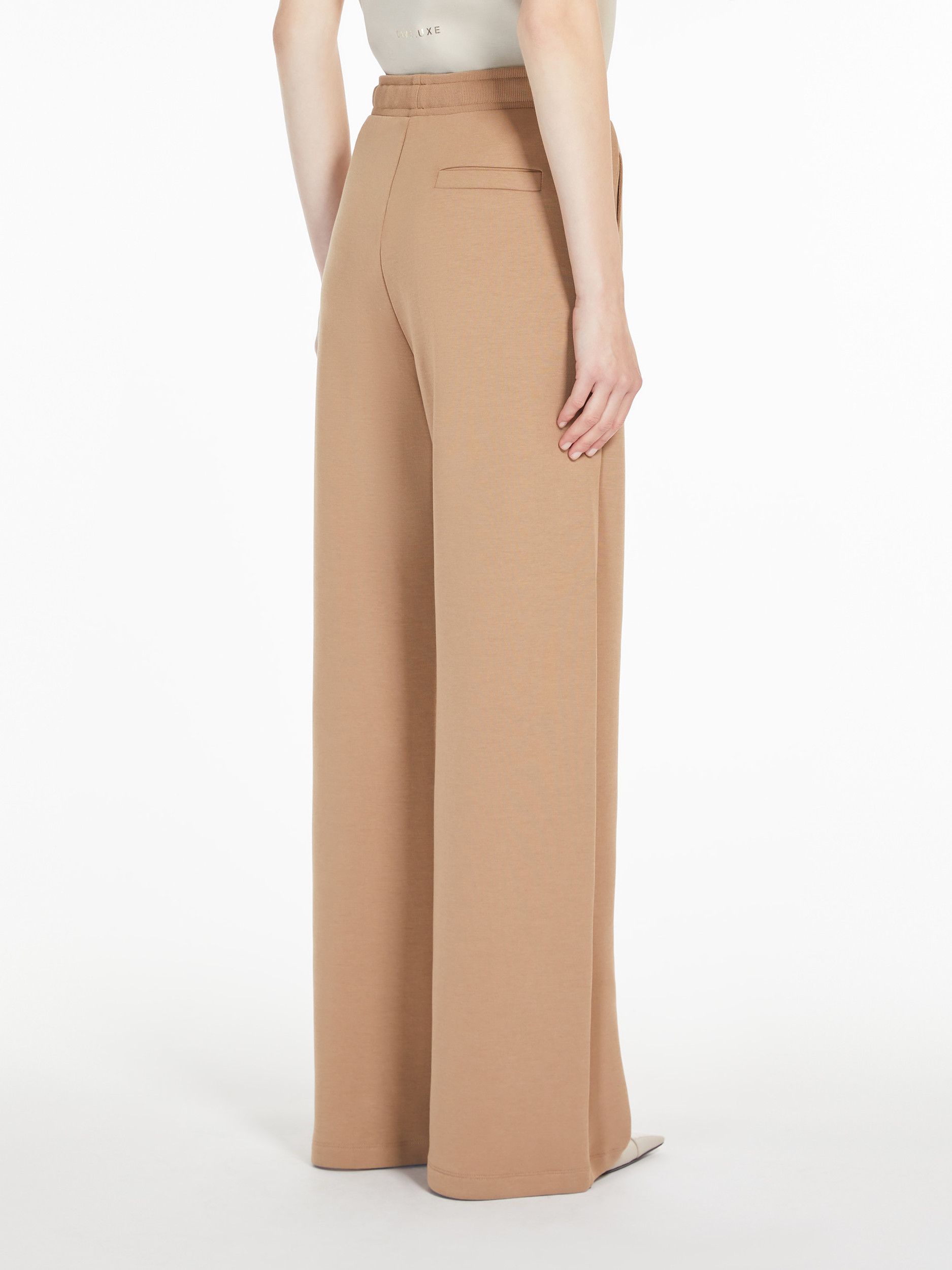 Широкие брюки из мягкого хлопкового трикотажа. Модель с резинкой на талии с кулиской из жаккардовой ленты с логотипом, врезные карманы по бокам и небольшой прорезной карман сзади.