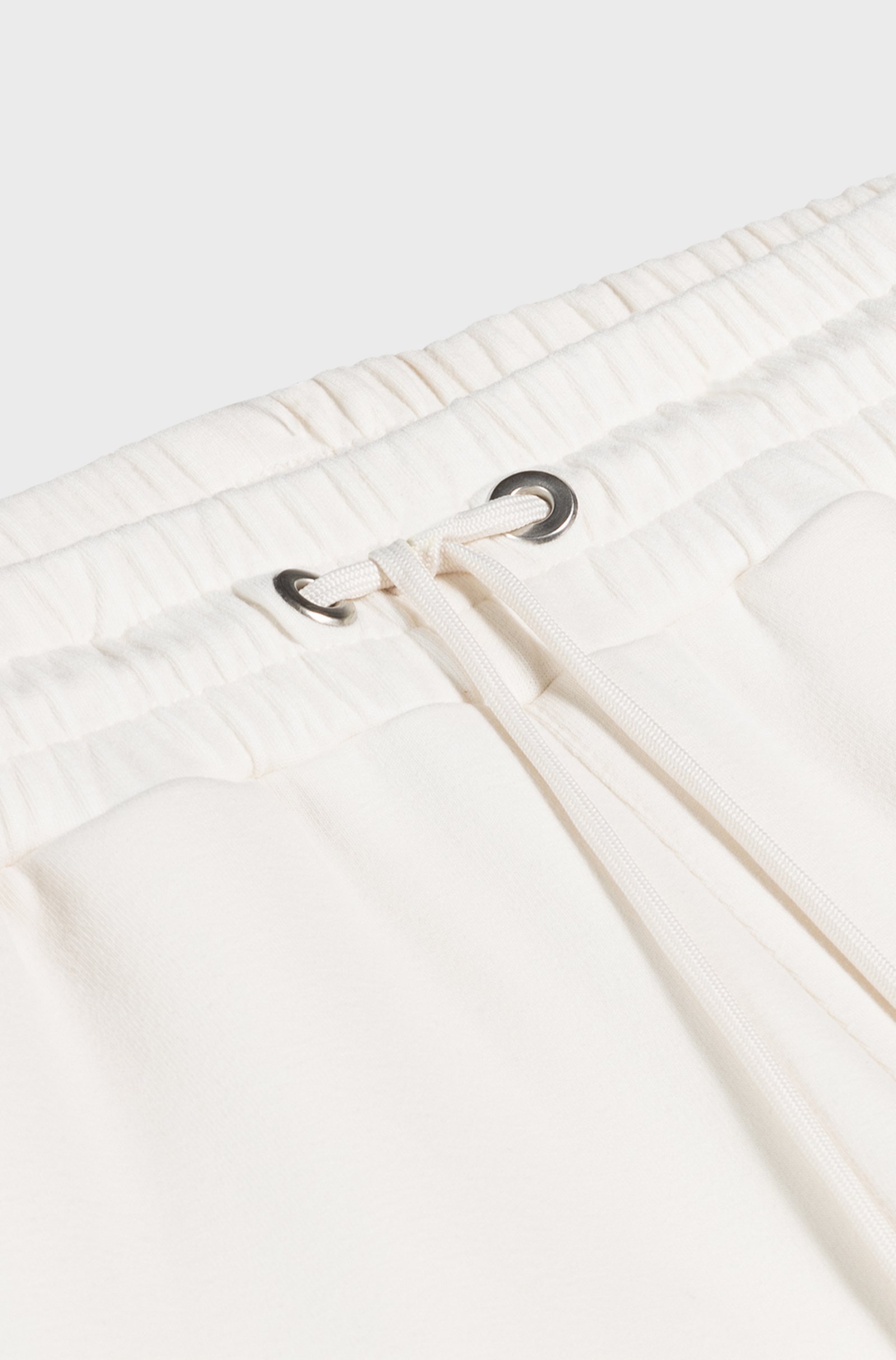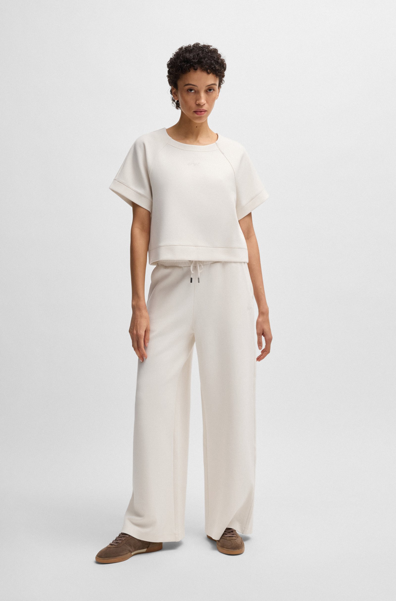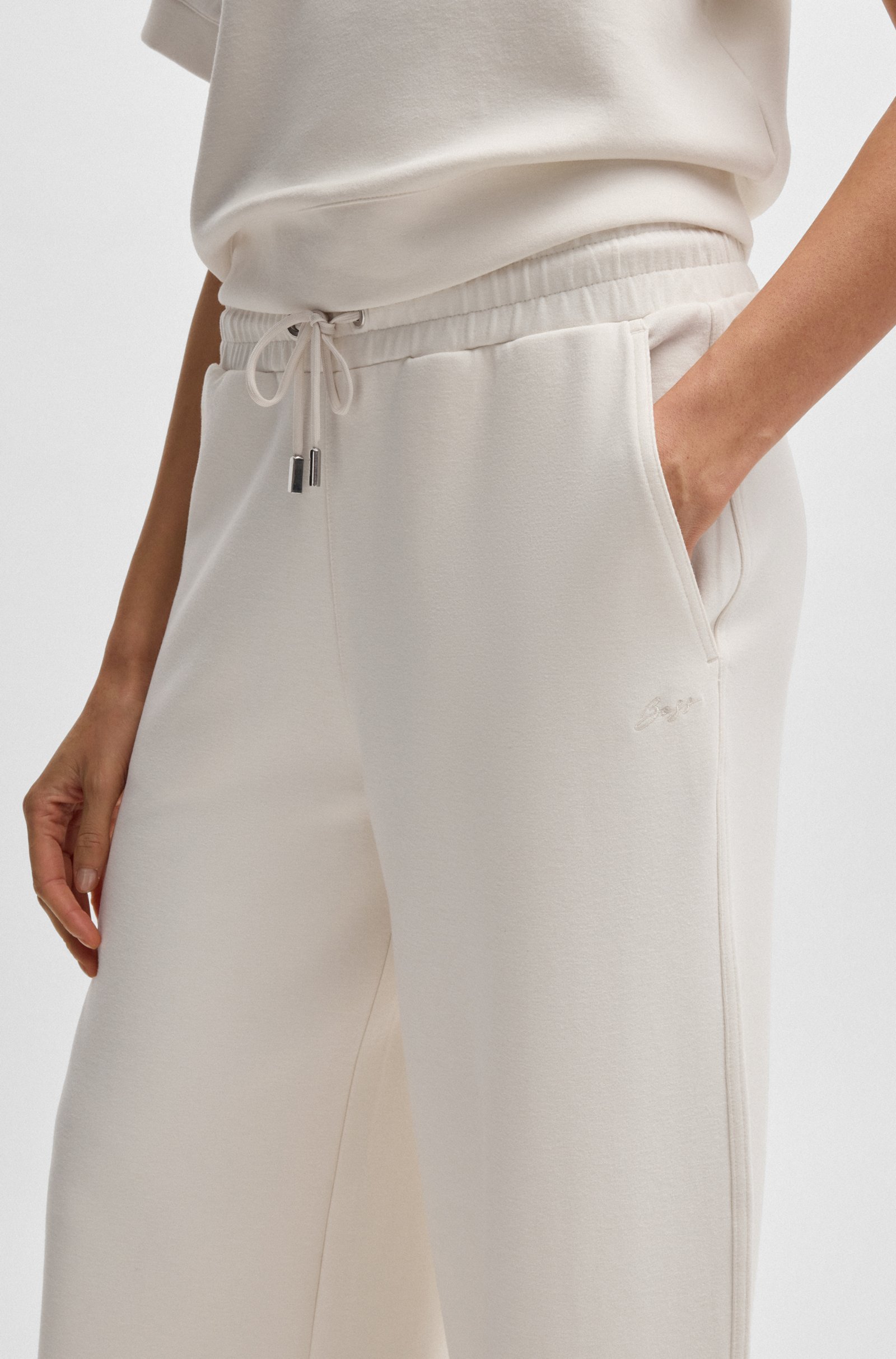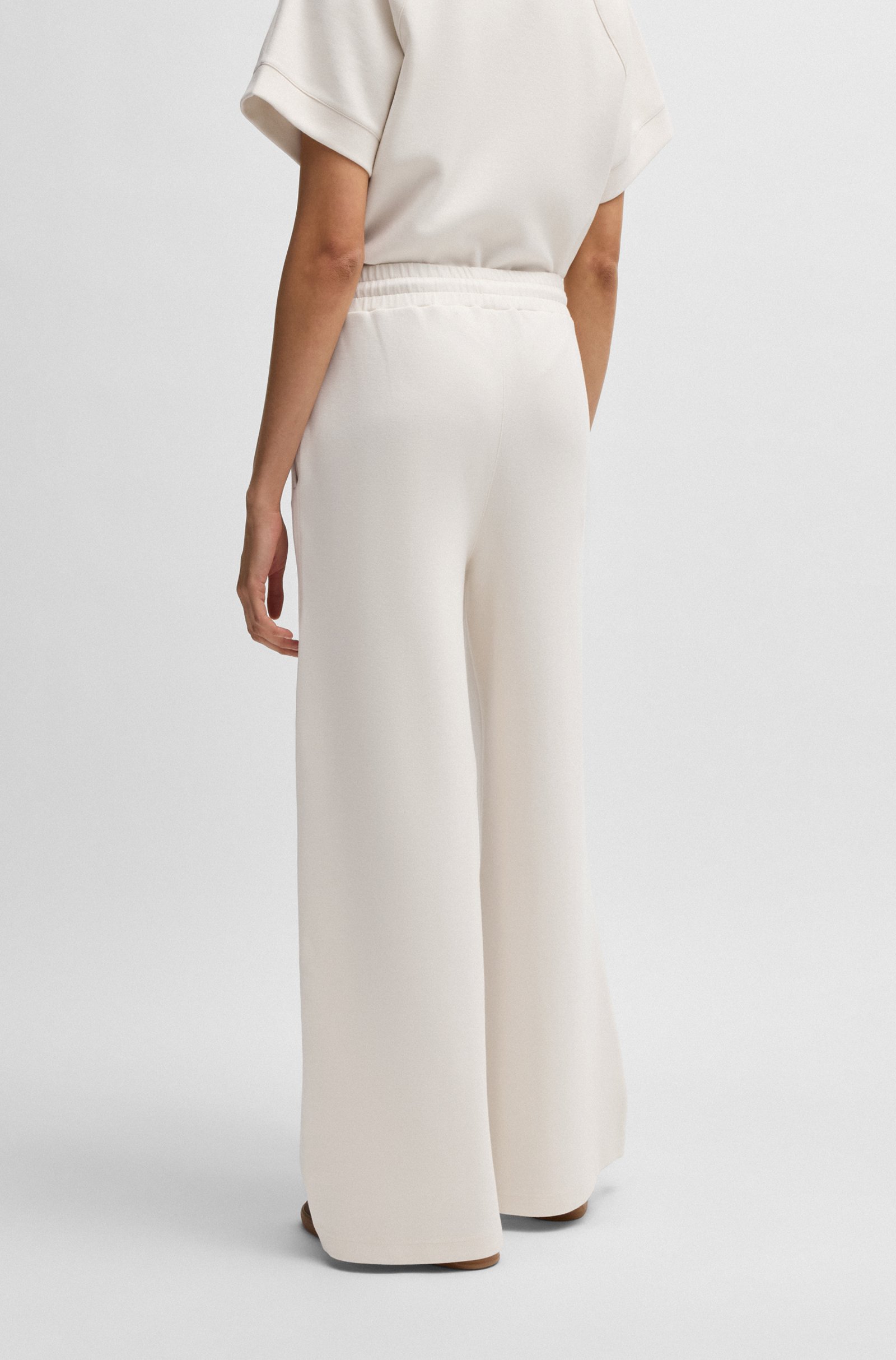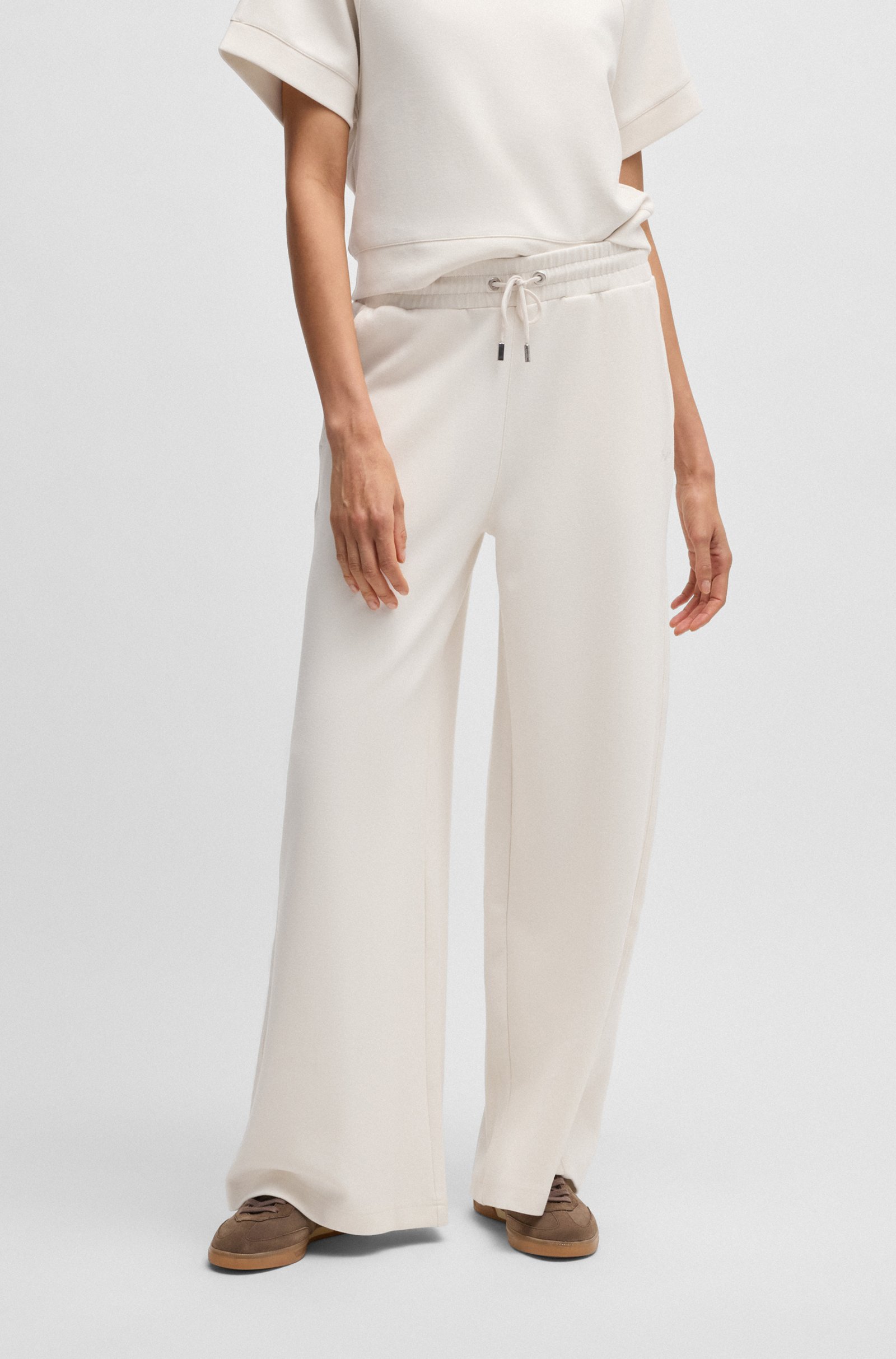 Спортивные брюки BOSS Womenswear станут стильной основой для расслабленных повседневных образов. Модель выполнена из мягкого эластичного джерси с добавлением хлопка, обеспечивая комфорт и свободу движений. Широкий крой и высокая посадка подчёркивают современный силуэт, а эластичный пояс с регулируемым шнурком позволяет индивидуально настроить посадку. Небольшой логотип добавляет изысканный акцент. Сочетаются с укороченными топами, свободными футболками и кроссовками, создавая непринуждённый спортивный стиль для прогулок или отдыха. Идеальный баланс между модой и функциональностью для тех, кто ценит комфорт и актуальный дизайн в повседневной жизни.