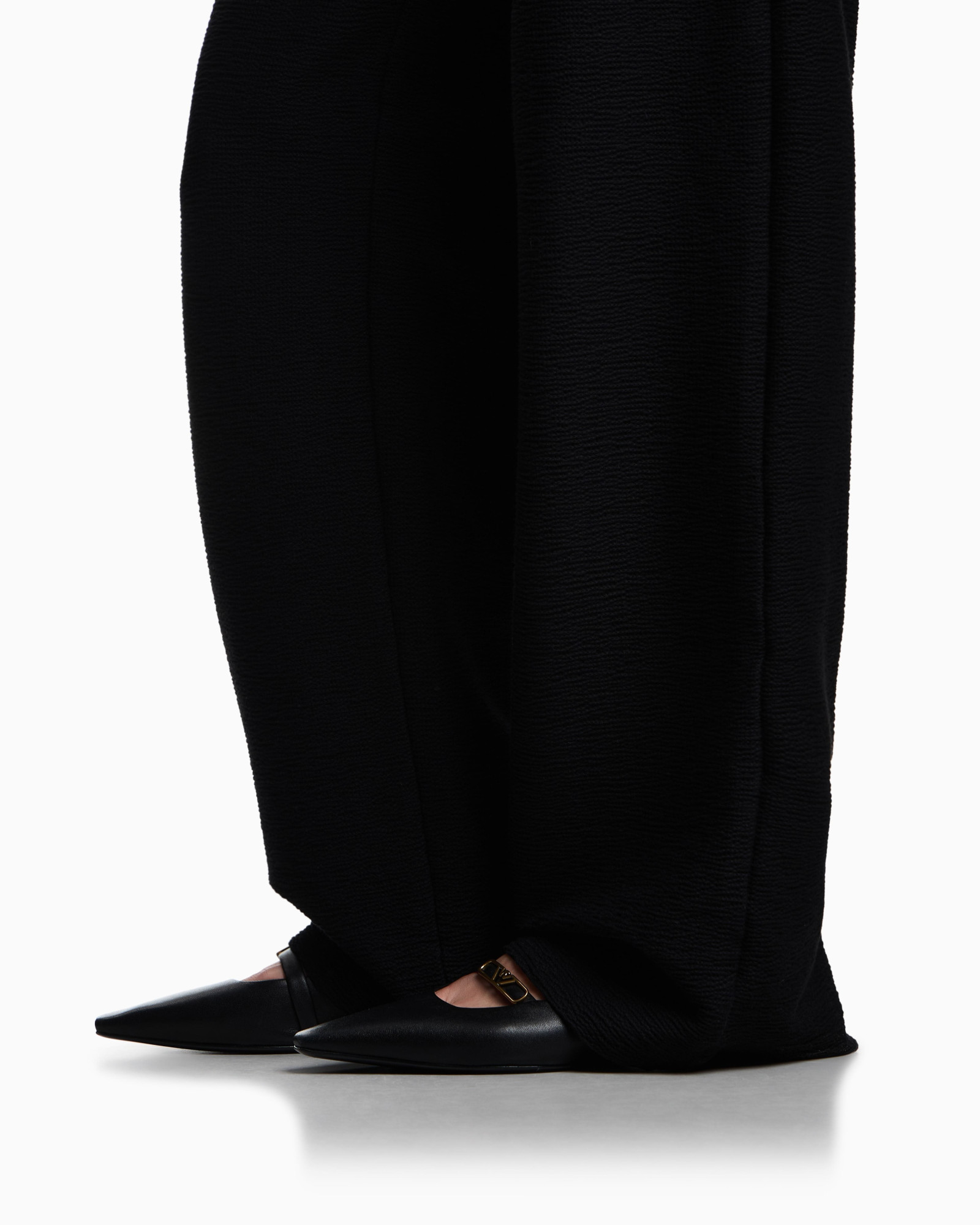 Чёрные брюки Emporio Armani в стиле палаццо выполнены из текстурированного джерси с рельефной трёхмерной структурой, которая придаёт образу изысканность и глубину. Сочетание хлопка, полиамида и эластана (73%/17%/10%) обеспечивает комфорт и эластичность. Застёжка сбоку на молнию и крючок, функциональные боковые карманы и внутренний пояс с добавлением вискозы и полиэстера гарантируют удобство и идеальную посадку. Сочетаются с облегающими топами, блузами из шёлка или структурированными жакетами. Эти брюки подчёркивают элегантность и современную утончённость, характерные для стиля Emporio Armani.