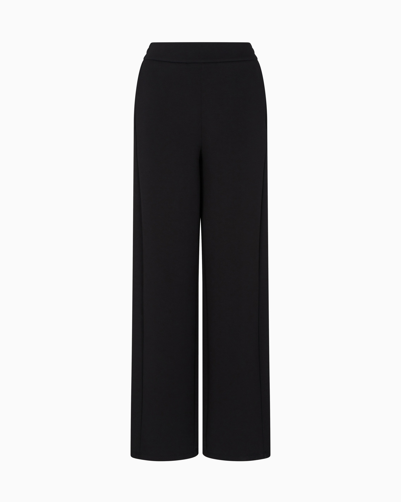 Чёрные брюки Emporio Armani из мягкого двойного джерси сочетают комфорт и функциональность. Ткань обеспечивает приятную мягкость и хорошую растяжимость. Практичный эластичный пояс и боковые карманы добавляют удобства. На спинке вышит фирменный орёл — лаконичный и узнаваемый акцент. Идеально подходят для сочетания с футболками, свитшотами и лёгкими куртками. Эти брюки создают современный образ, объединяя уют и стиль.