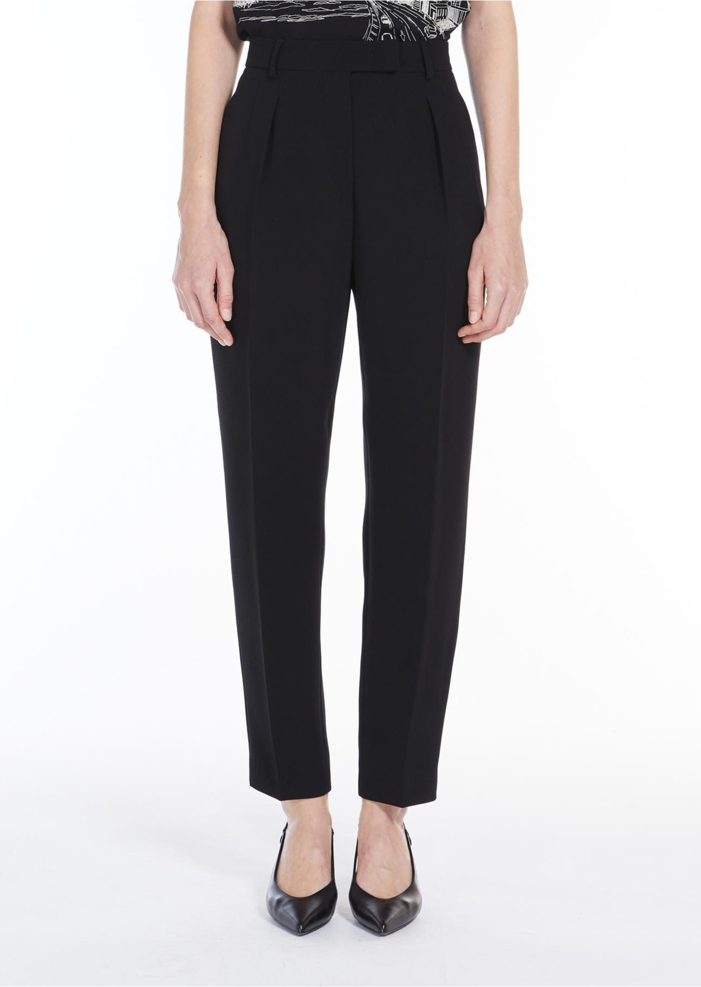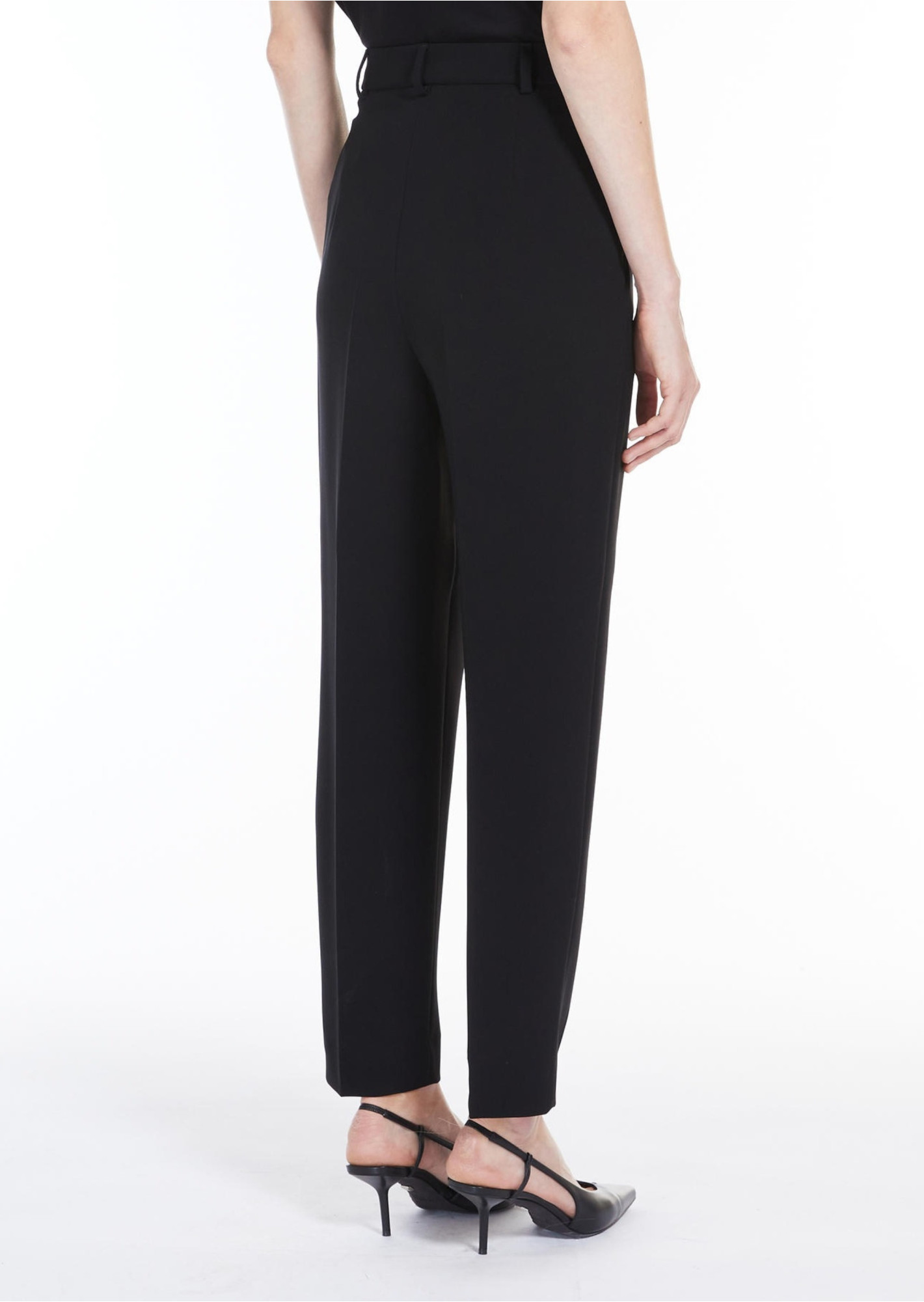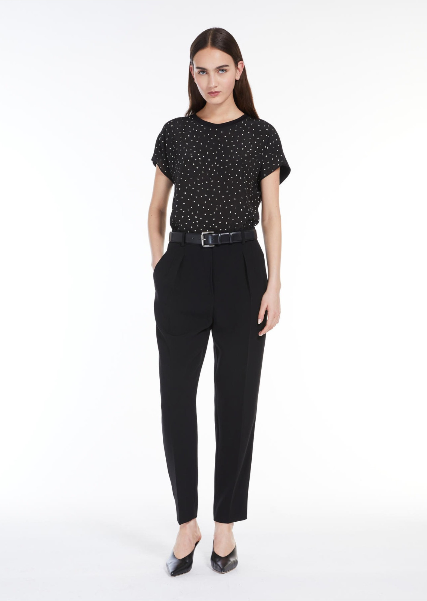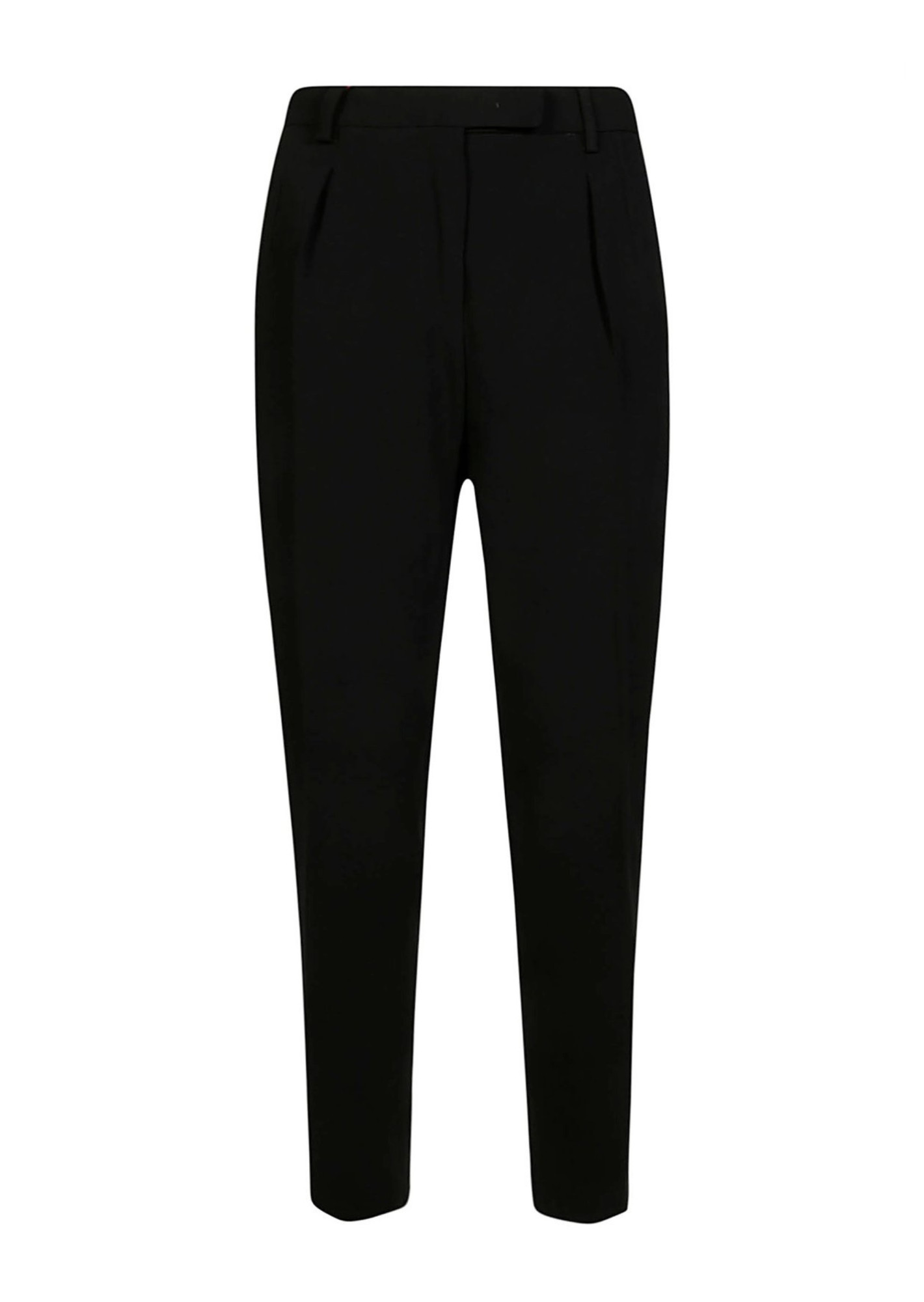 Брюки, выполнены из кади, широкого кроя-морковки, слегка суженные к низу. Украшенны передними вытачками, косыми боковыми карманами и петлями для ремня. Высокий пояс, застежка на молнию и застежку на крючки.