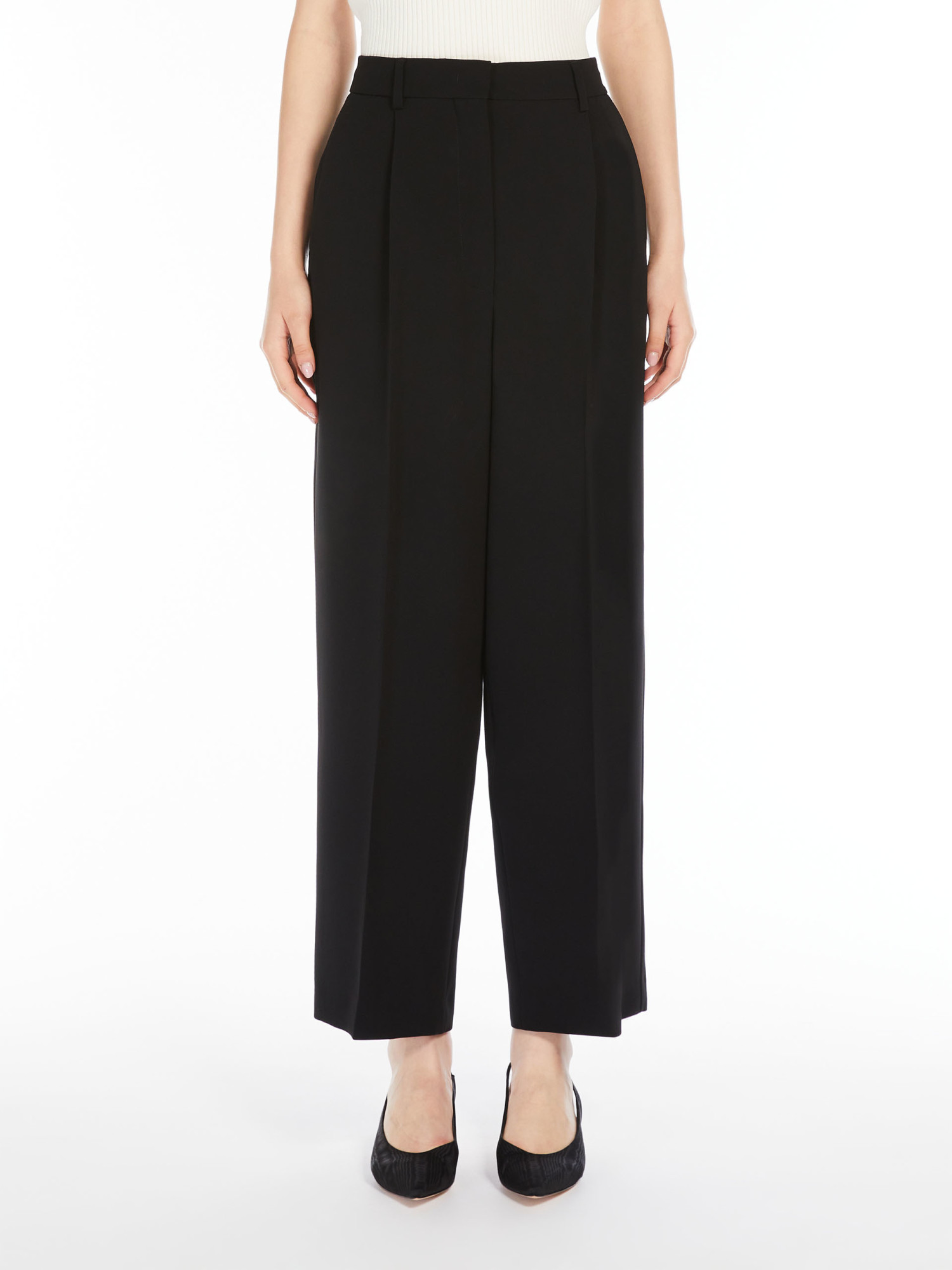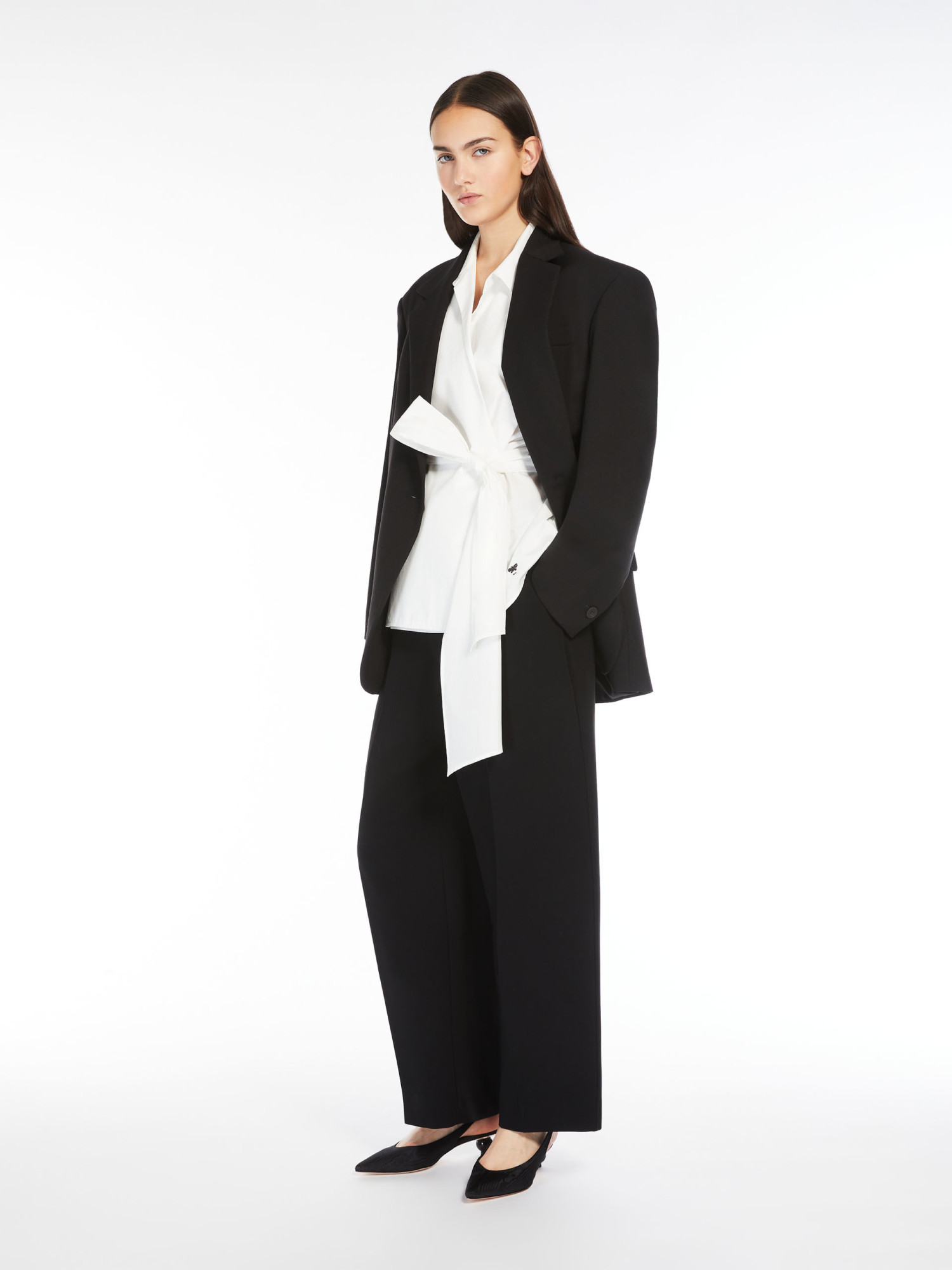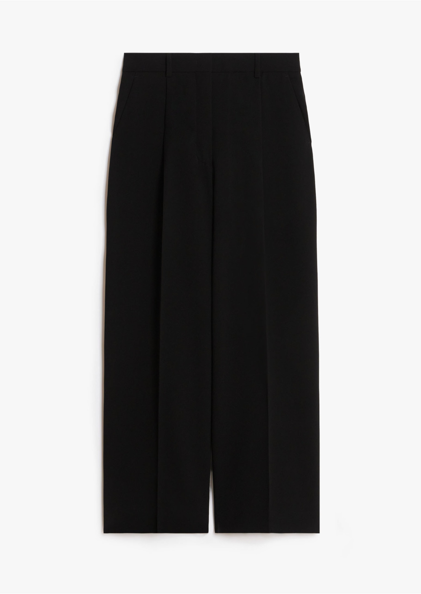 Брюки прямого кроя, выполенеы из кади, с вытачками и петлями для ремня на талии. Модель имеет косые боковые карманы и прорезные задние карманы на пуговицах. Высокий пояс, застежка на молнию и застежка на крючки.