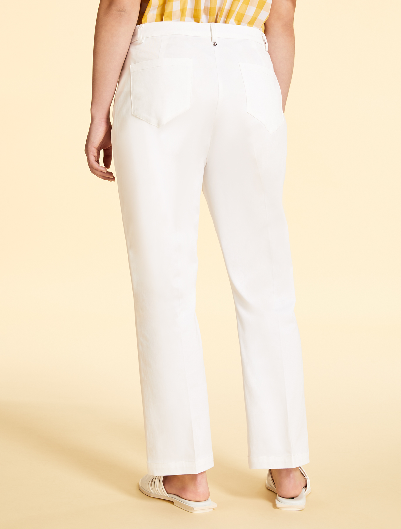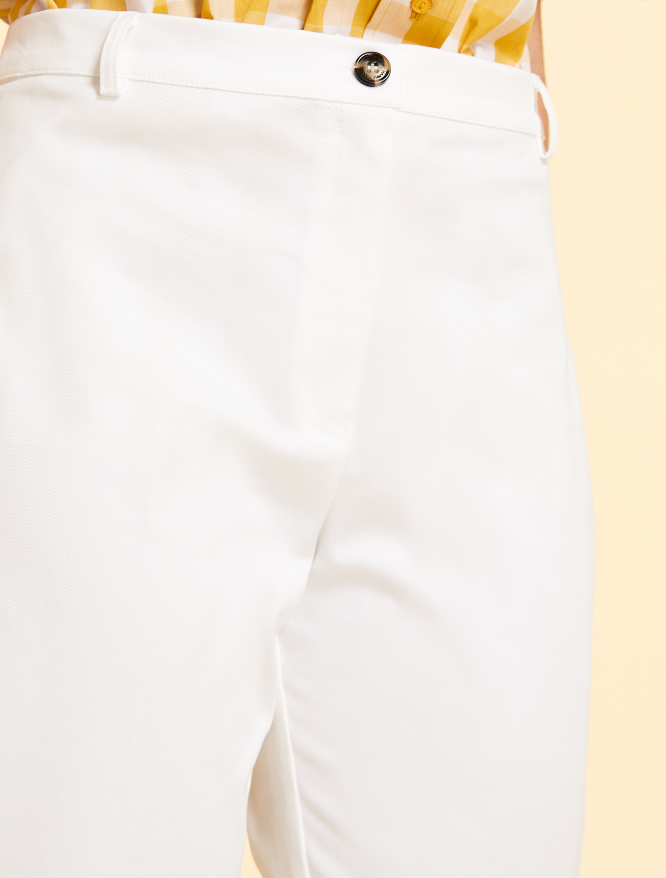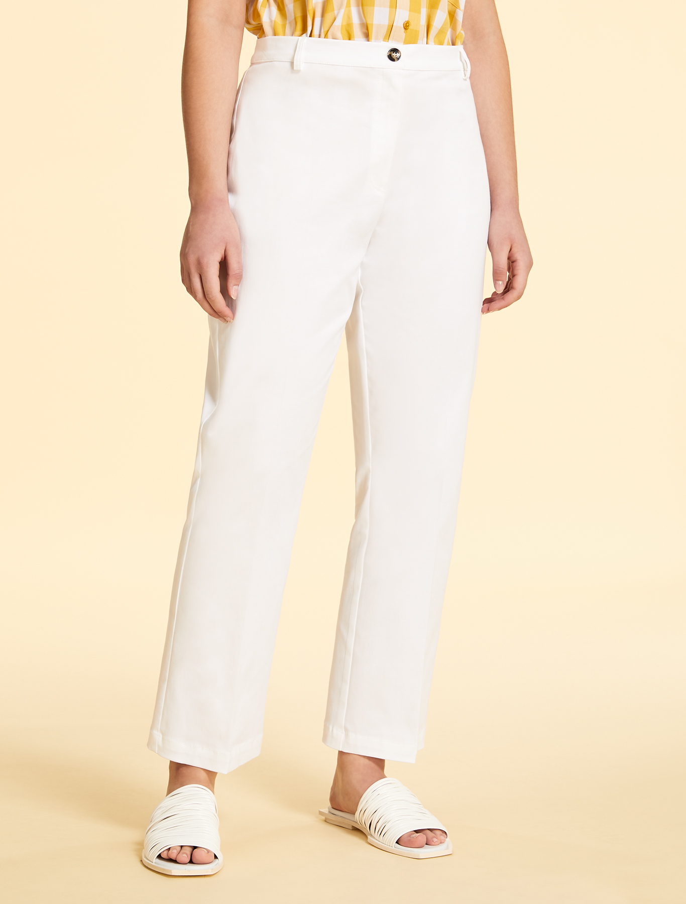 Однотонные повседневные брюки со средней посадкой. Модель изготовлена из эластичного хлопка. Брюки прямые со стрелкой, застегиваются на молнию и пуговицу.
