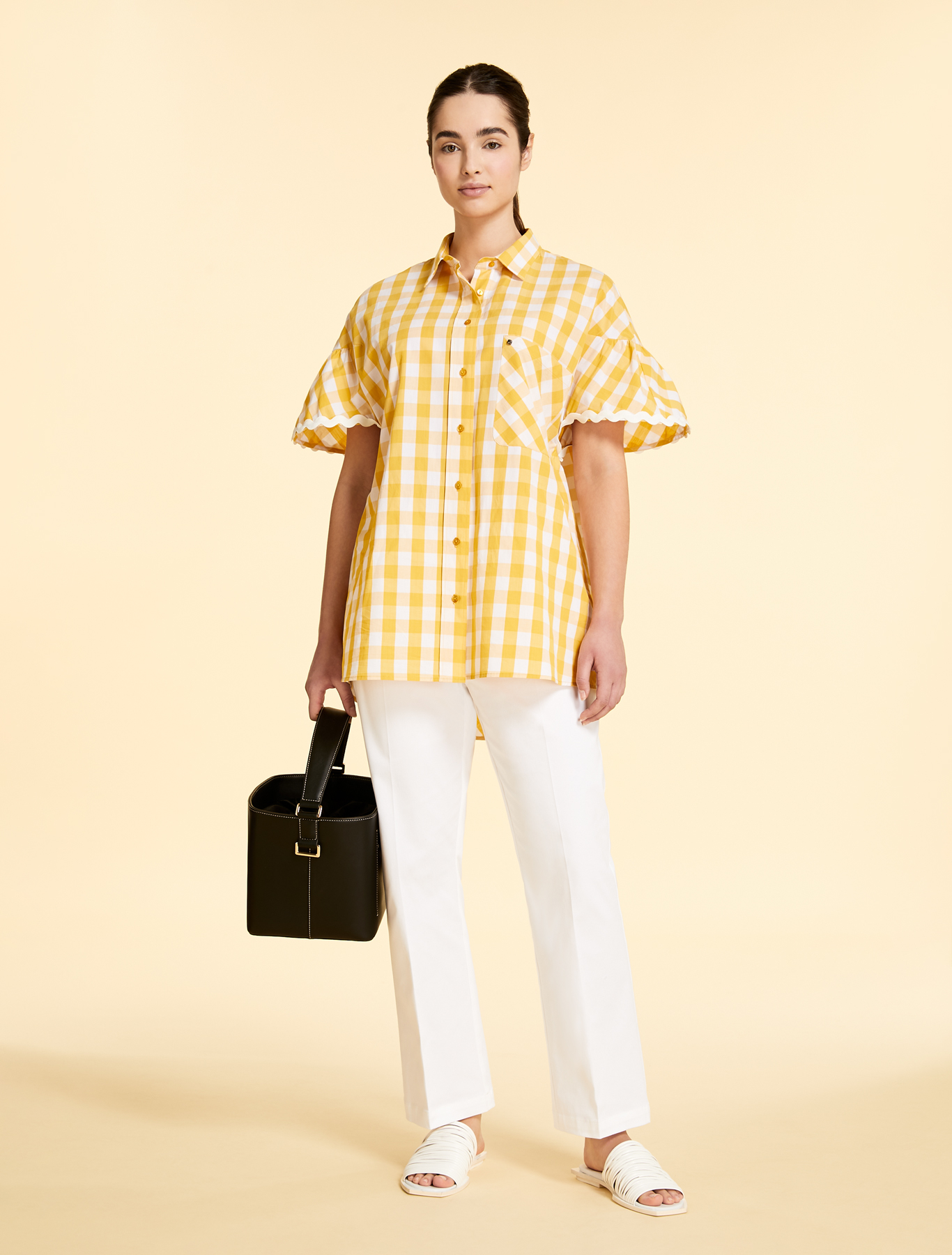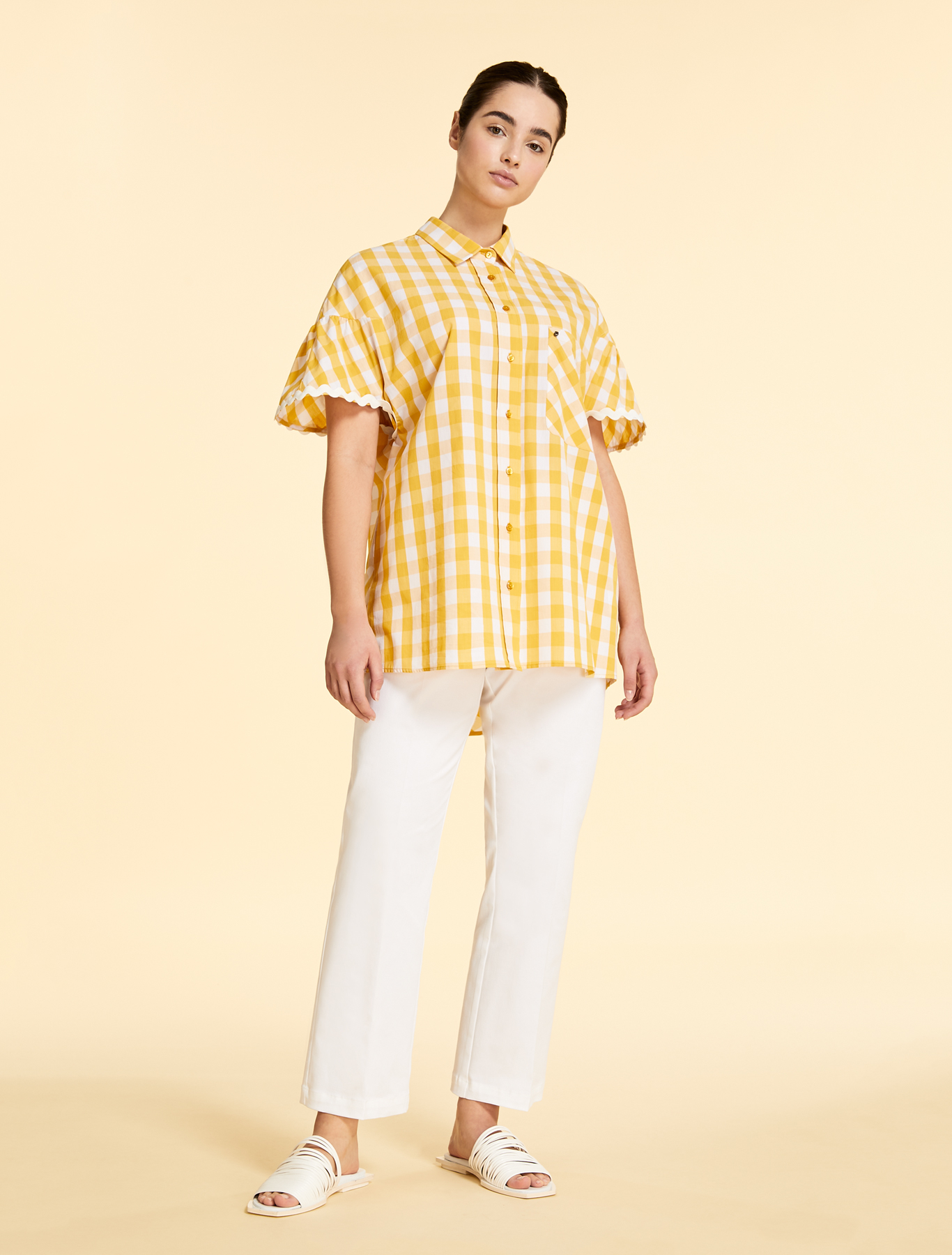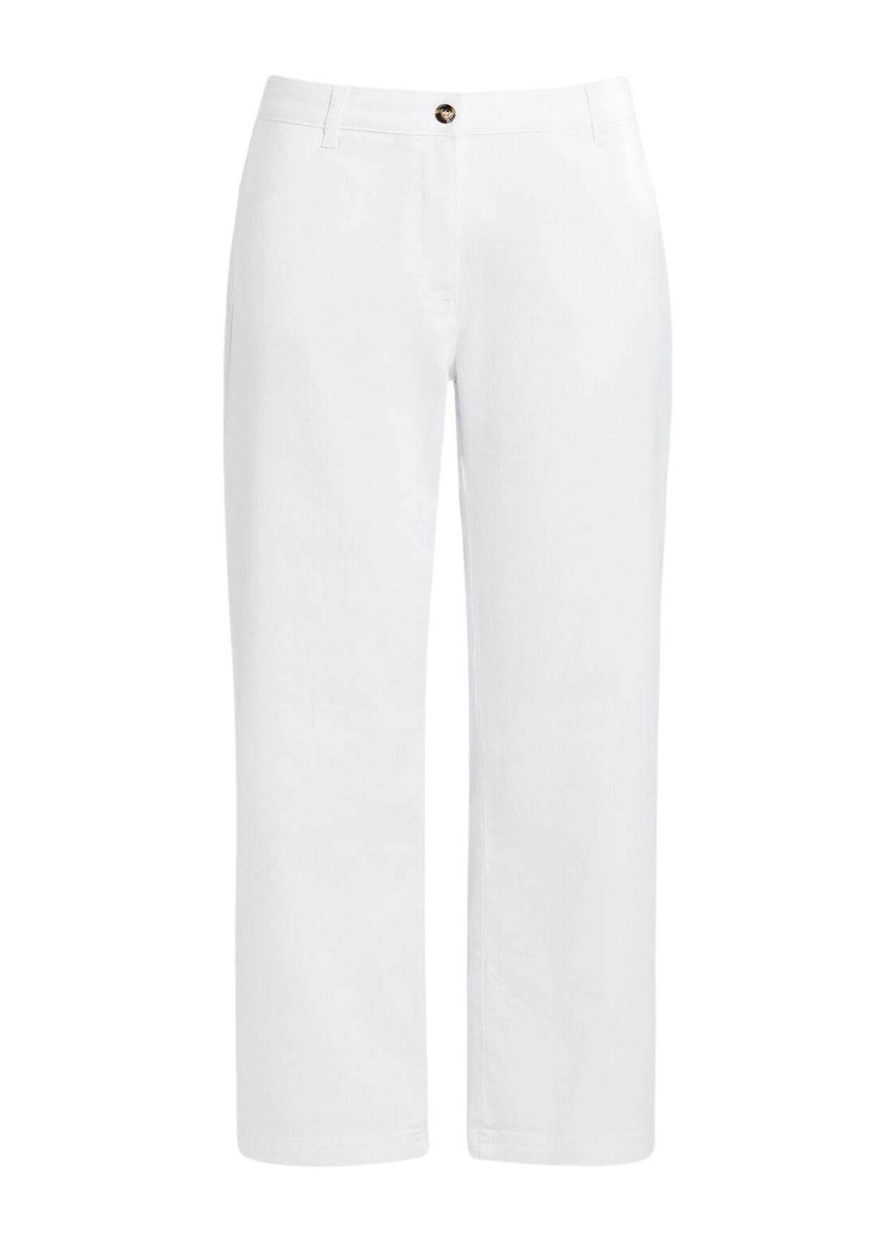 Однотонные повседневные брюки со средней посадкой. Модель изготовлена из эластичного хлопка. Брюки прямые со стрелкой, застегиваются на молнию и пуговицу.