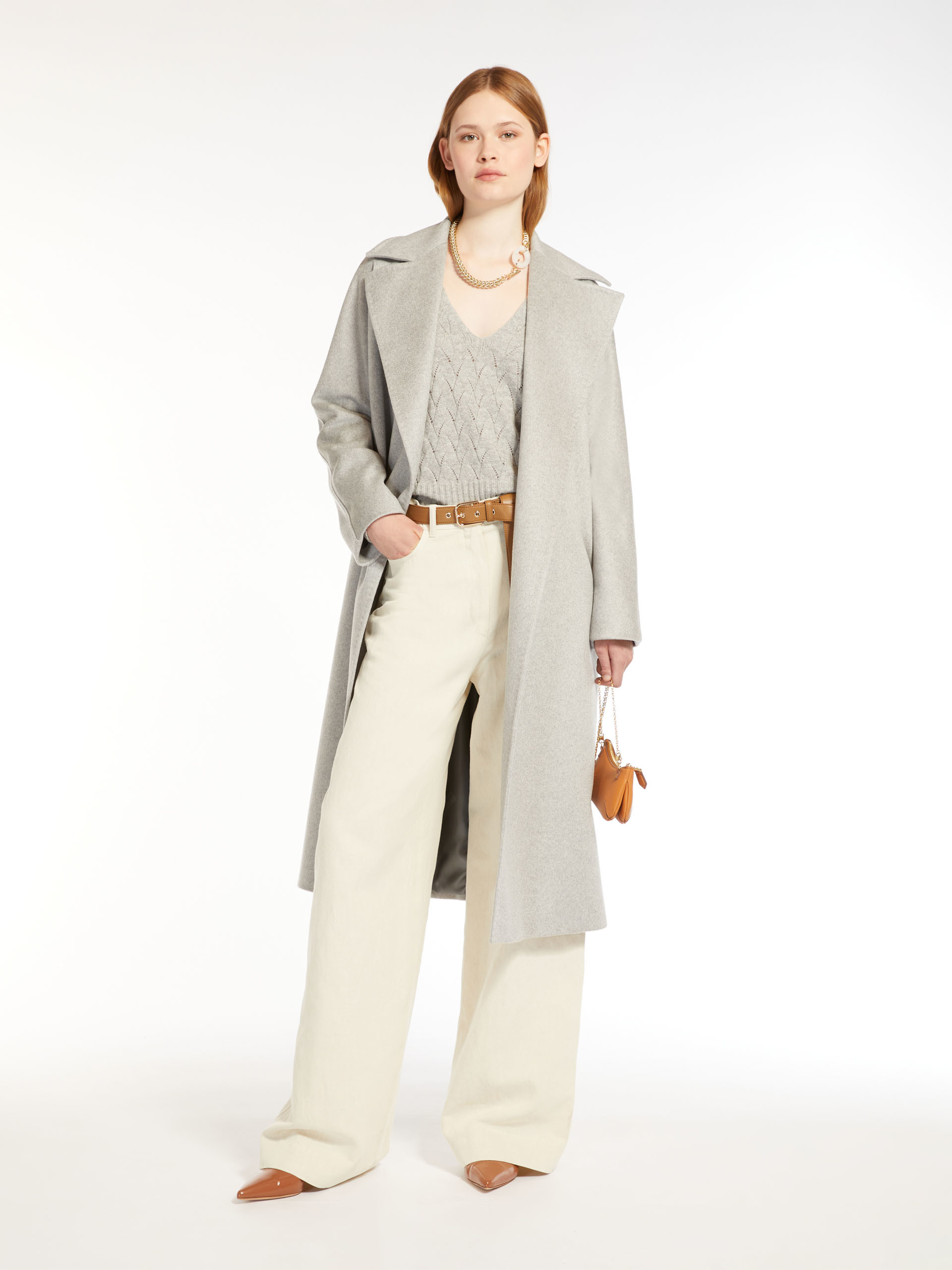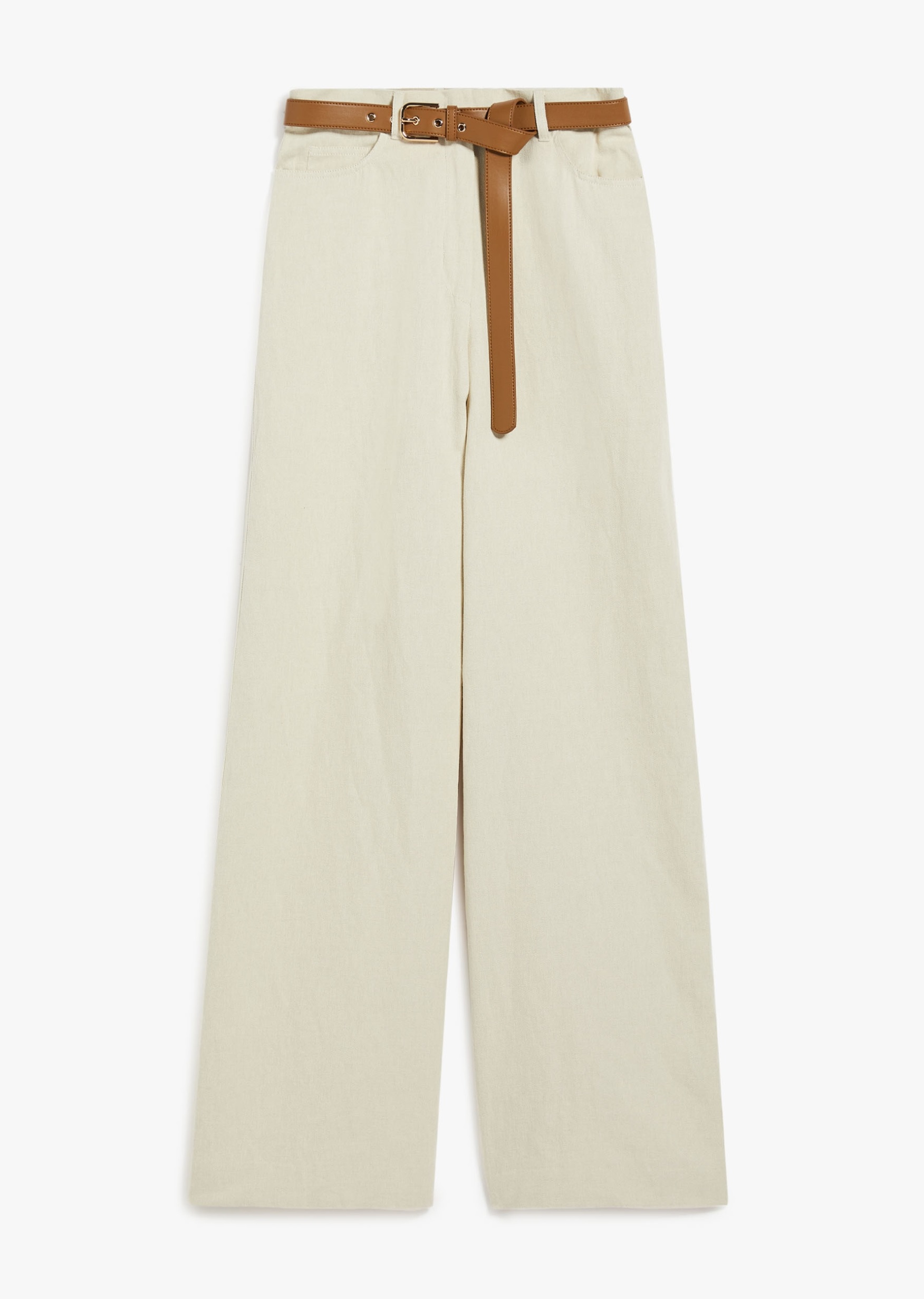 Брюки с пятью карманами из хлопка и льна. Фасон имеет широкий силуэт и накладные карманы сзади. Мягкий пояс из кожи наппа в тон подчеркнет талию. Потайная молния с крючком и пуговицей.