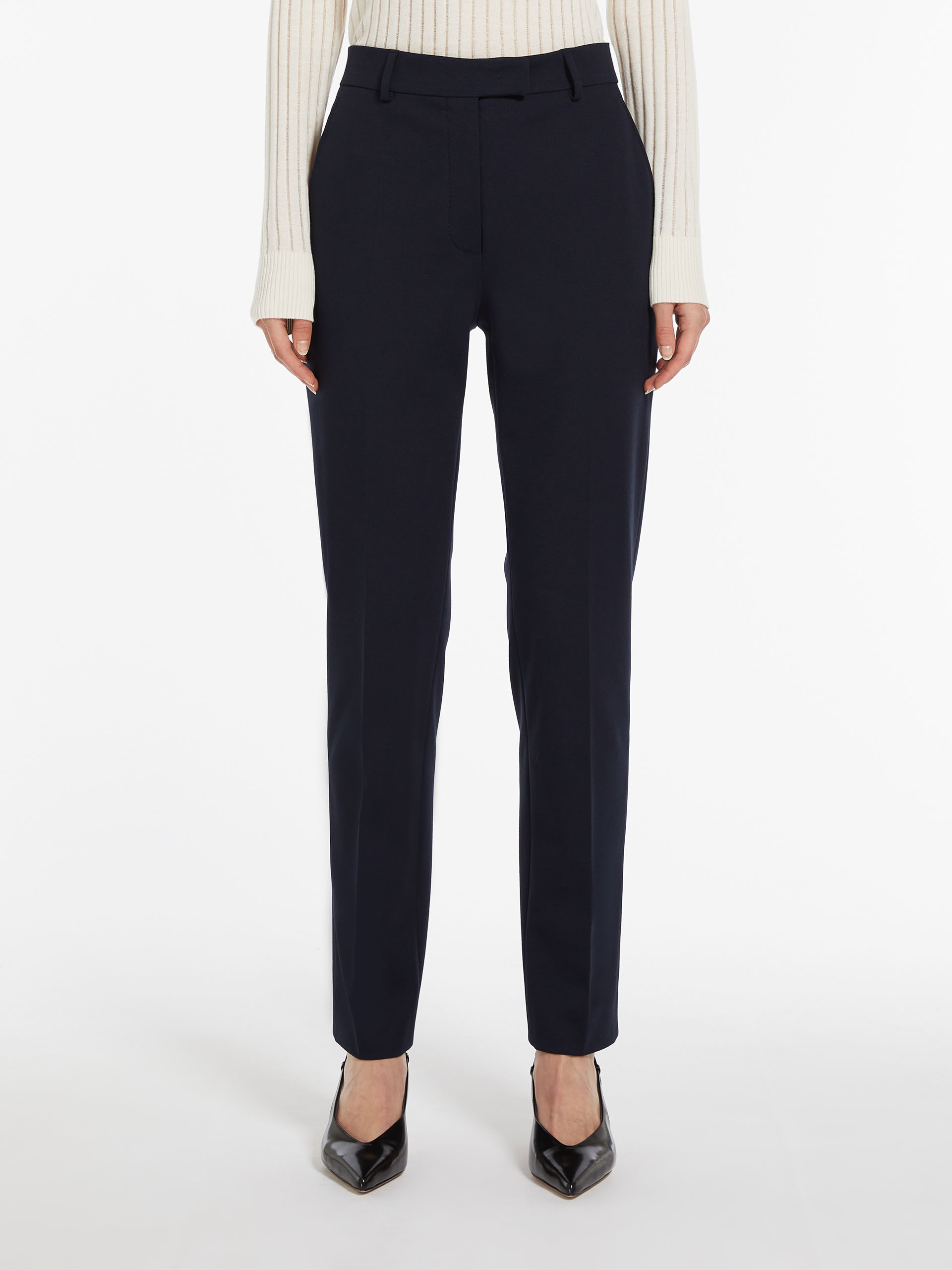 Брюки из мягкого стрейчевого трикотажа прямого силуэта, складкой на брюках и скошенными карманами по бокам. Застежка на завышенную талию, застежку-молнию и небольшой крючок.