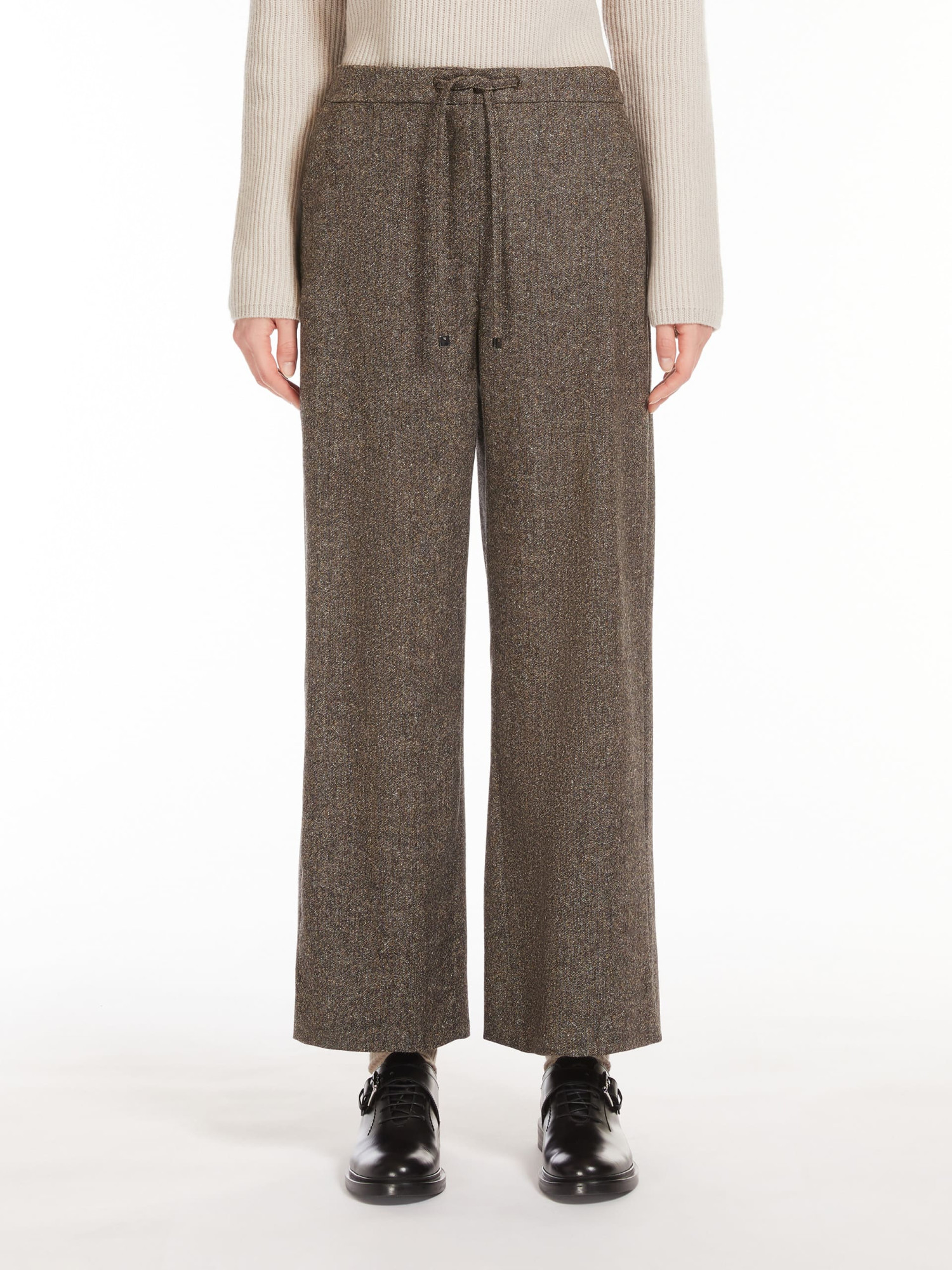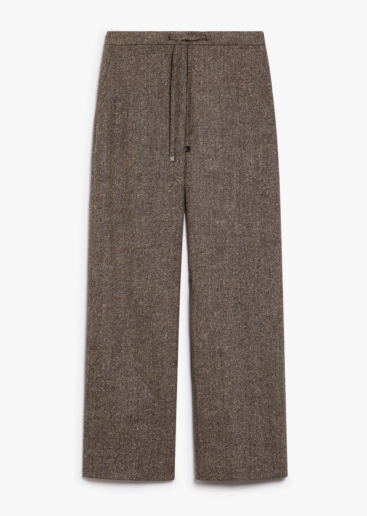 Брюки, выполнены из эластичной шерстяной ткани, на пуговицах, свободного кроя, с эластичной талией и регулируемой кулиской спереди. Дополнено косыми карманами по бокам. Застежка на крючок спереди и потайная молния.