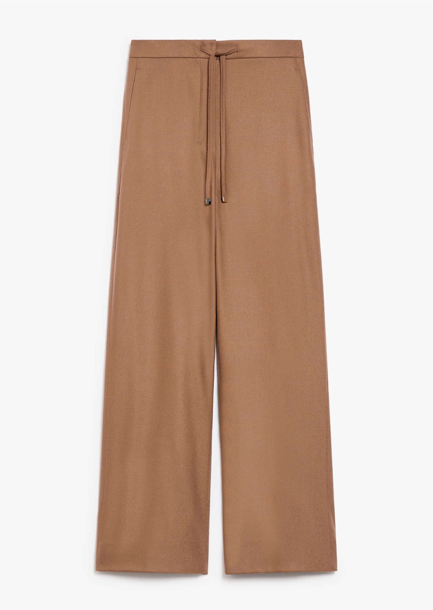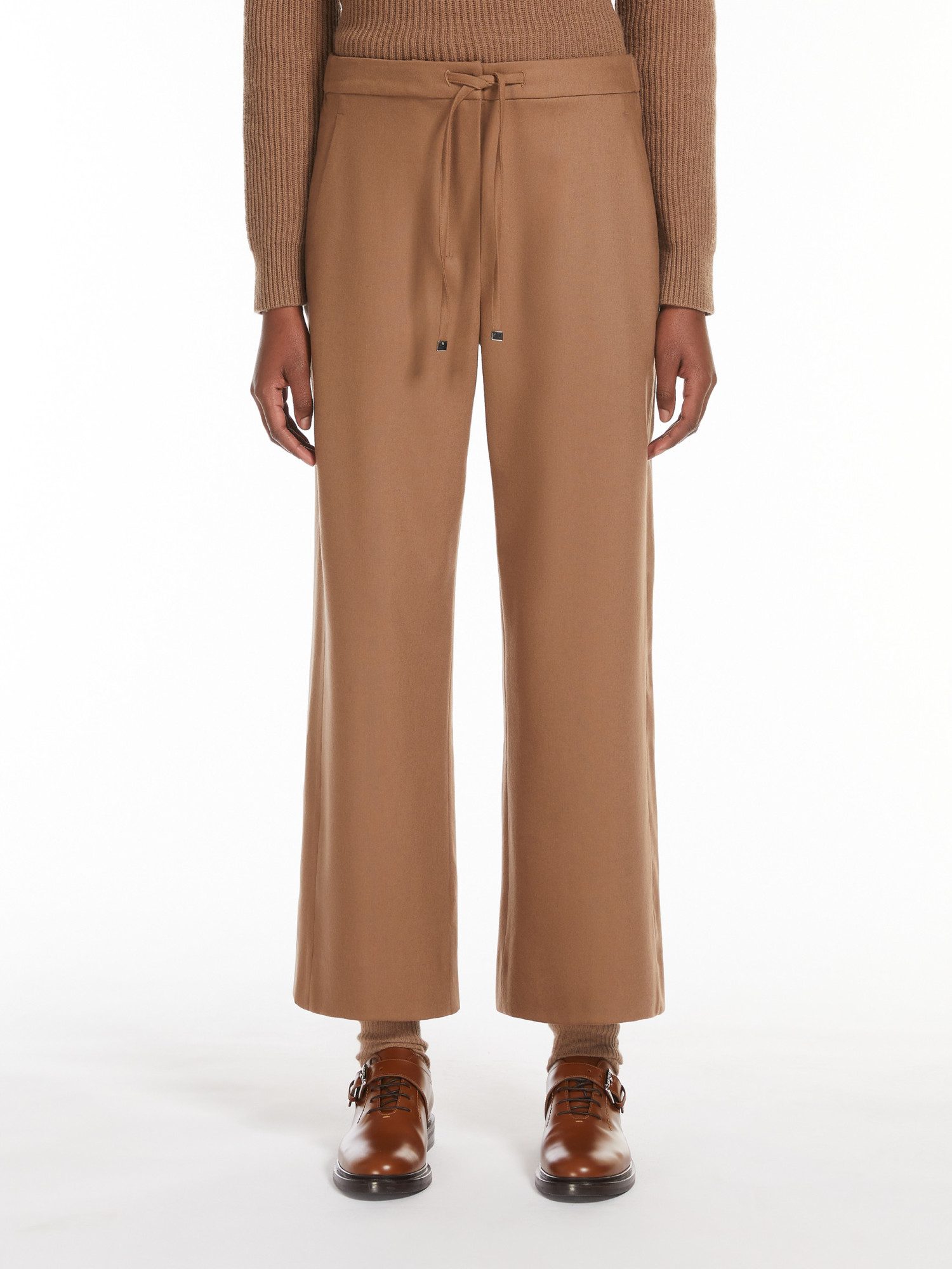 Брюки свободного кроя, выполнены из мягкой шерстяной фланели-стрейч. Модель имеет эластичную талию, косые карманы по бокам и регулируемую кулиску спереди.