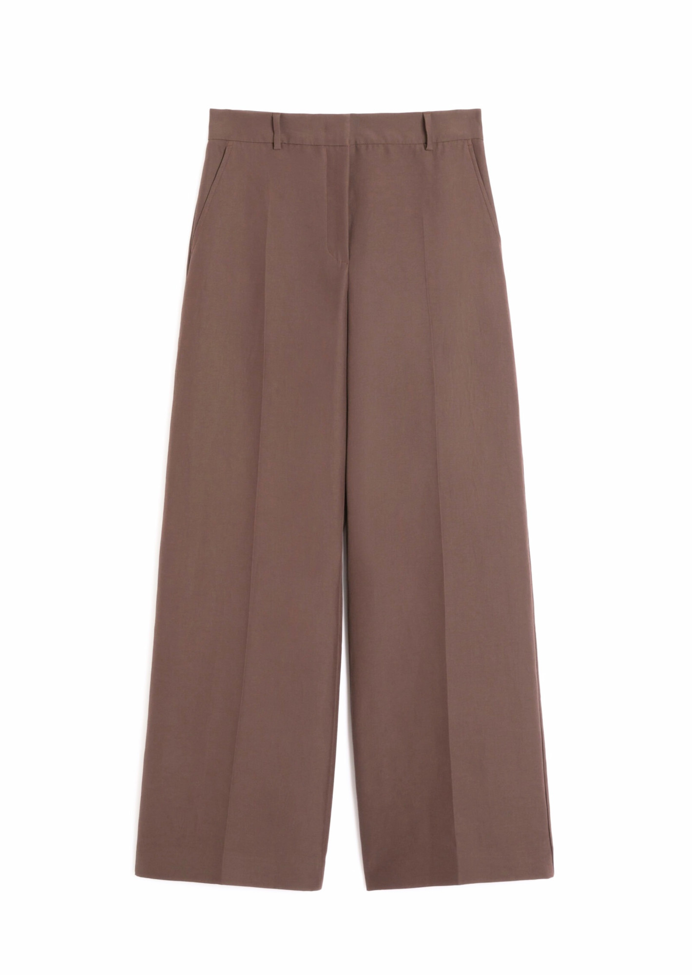Брюки Max Mara Weekend с выразительным широким кроем в коричневом оттенке. Высокая посадка, удлинённый силуэт и заутюженные стрелки формируют элегантный образ. Брюки выполнены из двухслойной ткани на основе хлопка и ацетата. Оснащены косыми боковыми карманами, прорезными задними карманами с пуговицами, застёжкой на молнию с потайным крючком и шлёвками под ремень. Эффектная основа для делового или повседневного гардероба — сочетается с топами, лаконичными рубашками и жакетами.