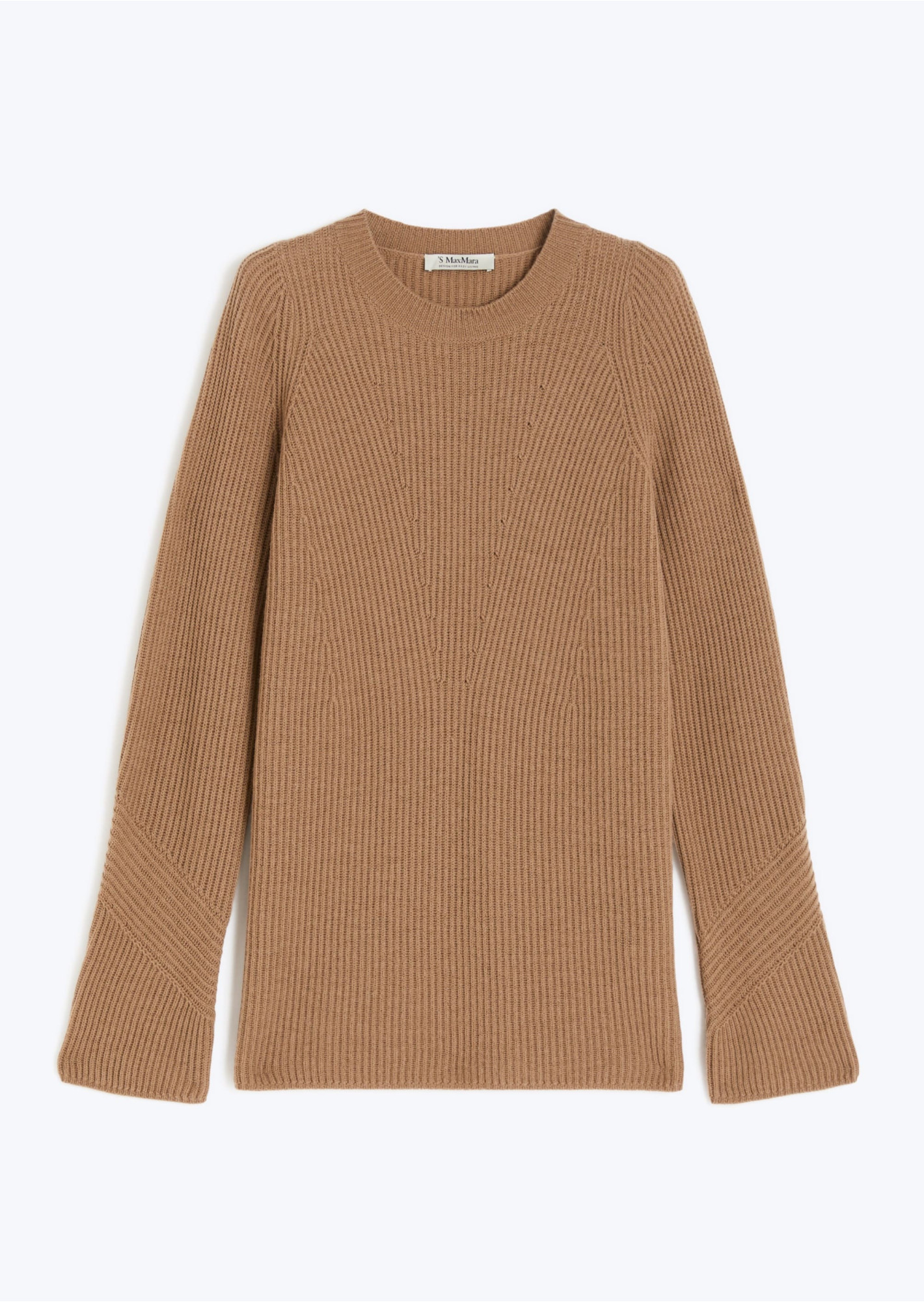Джемпер Max Mara S из чистой шерсти с фактурной вязкой в стиле fisherman’s rib в коричневом оттенке. Свободный слегка расклешённый крой, круглый вырез и рукава-реглан создают мягкий объём. Сочетается с шерстяными юбками, прямыми брюками, денимом и пальто свободного силуэта. Базовый вариант на холодный сезон — тёплый, тактильно выразительный и универсальный в повседневных образах.