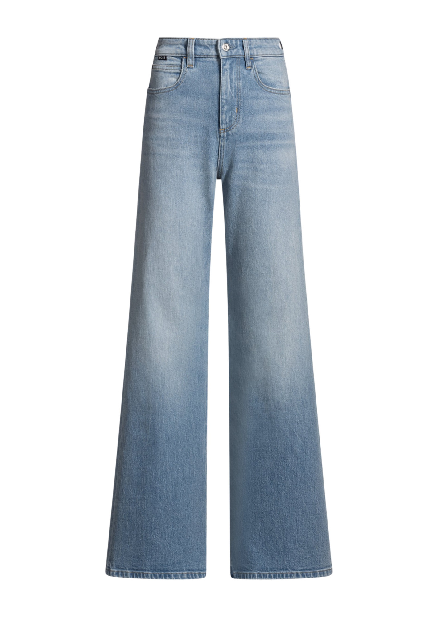 Женские джинсы-клеш от BOSS изготовлены из высококачественного синего денима. Современности изделию придают потертости. Модель с застежкой на молнию и пуговицу, украшенная логотипом. Минималистичная модель – идеальная основа для повседневного гардероба.
