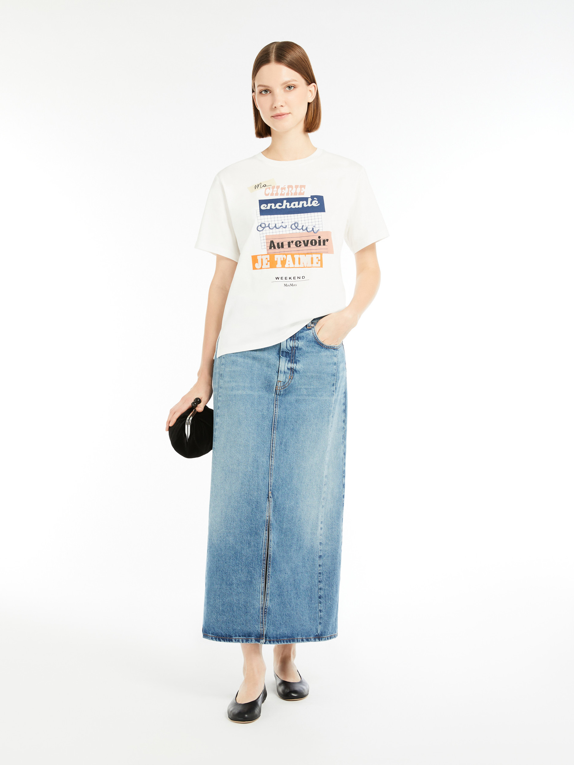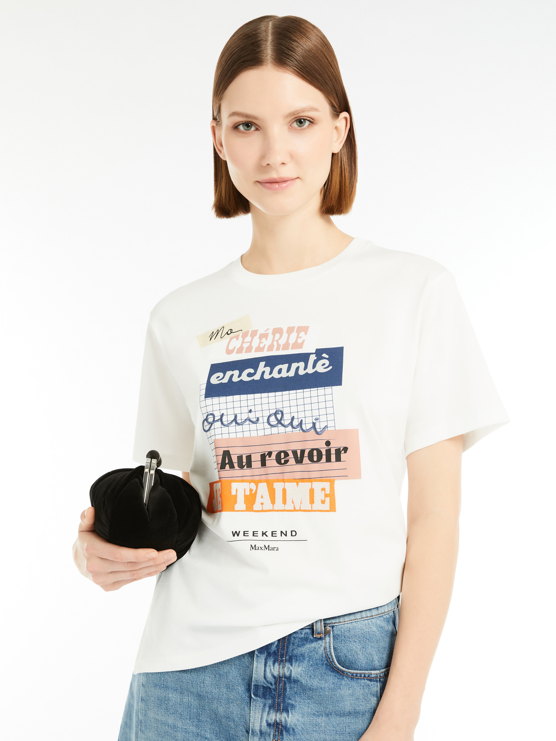 Футболка, выполнена из хлопкового джерси, с графическим рисунком спереди. Модель прямого силуэта, отличается круглым вырезом в рубчик, короткими рукавами, разрезами по низу и принтом с логотипом на спине.