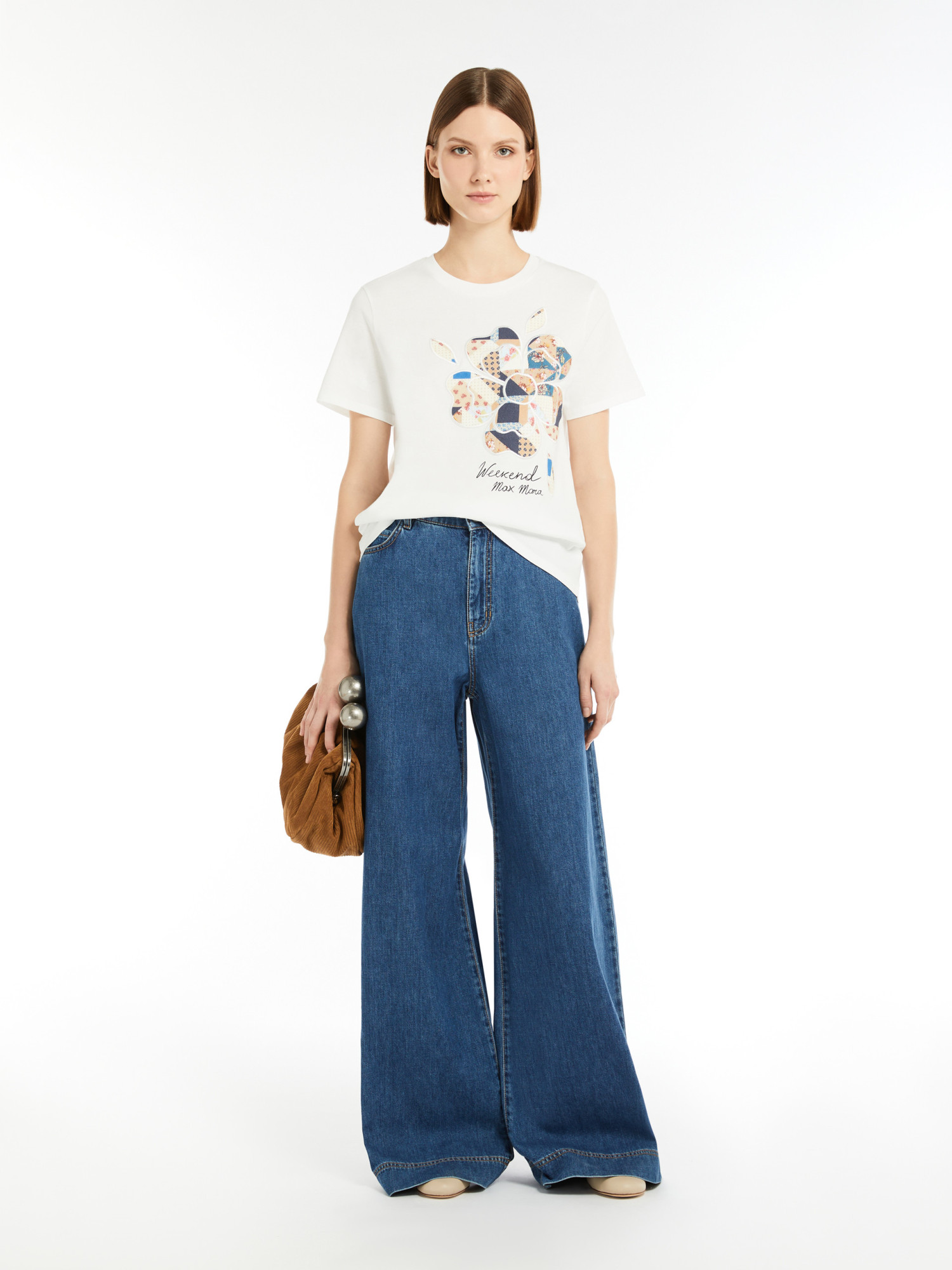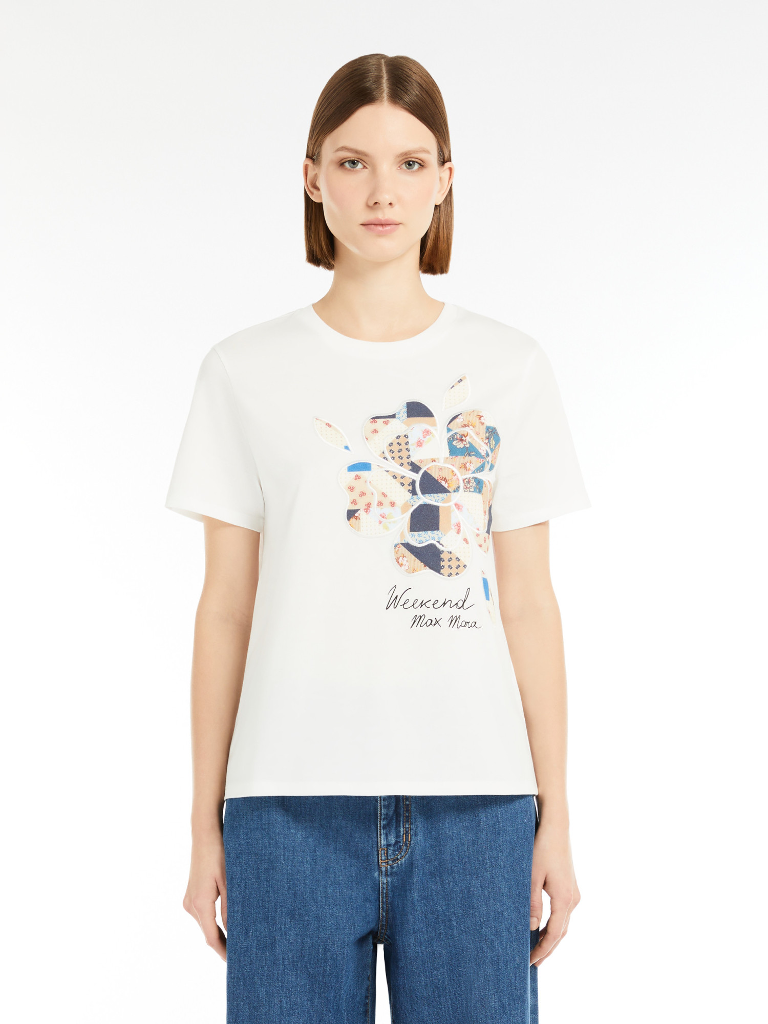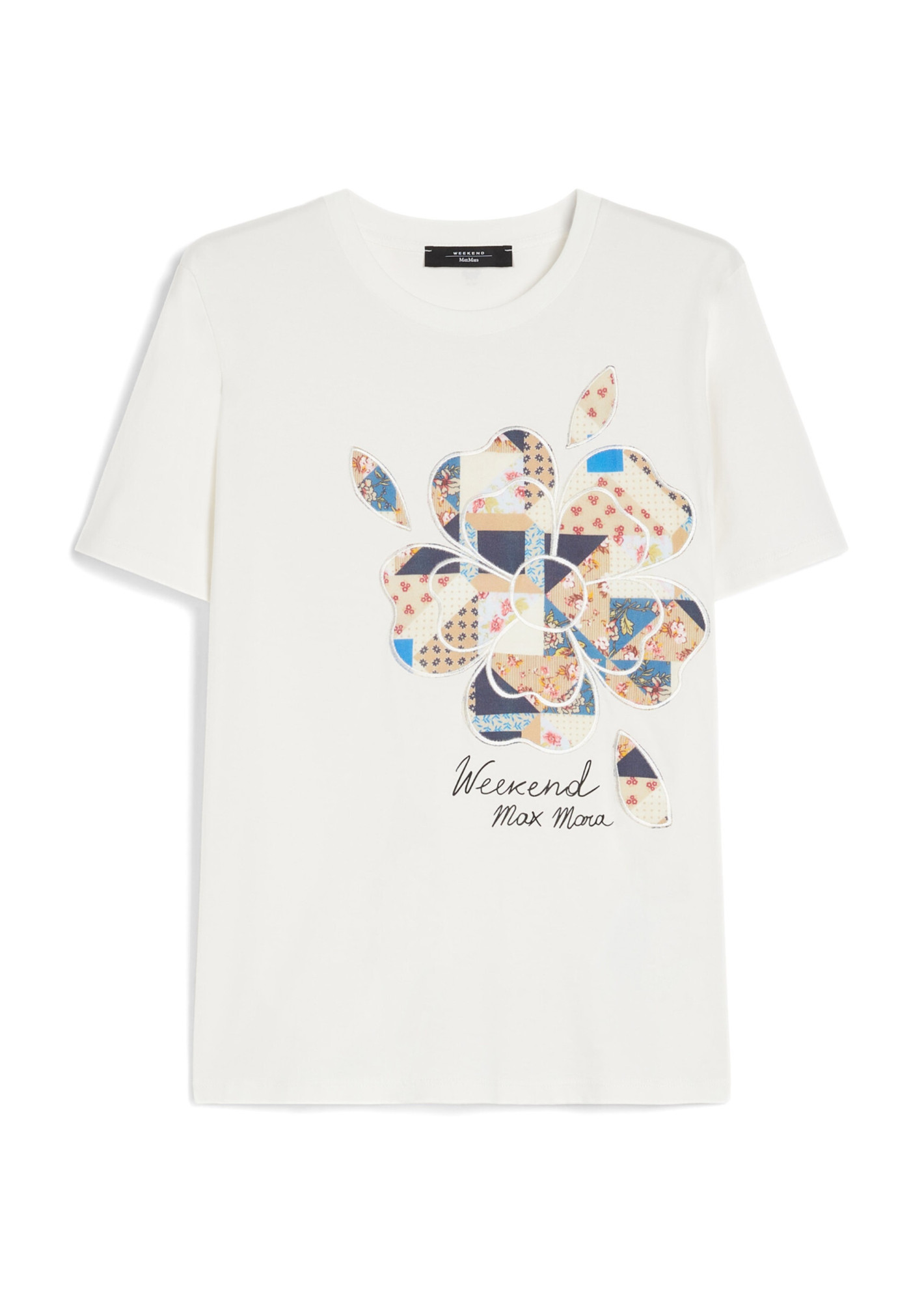 Футболка с короткими рукавами из мягкого хлопкового трикотажа. Модель с круглым вырезом, прямой линией, вышитым принтом спереди и логотипом-бабочкой сзади.