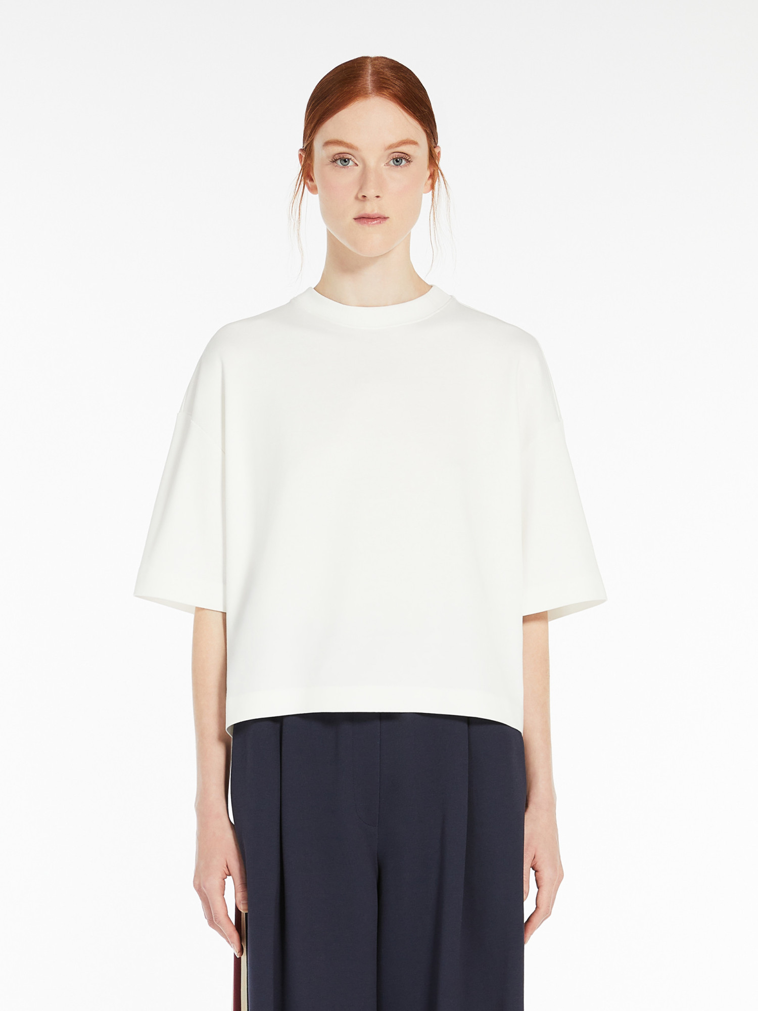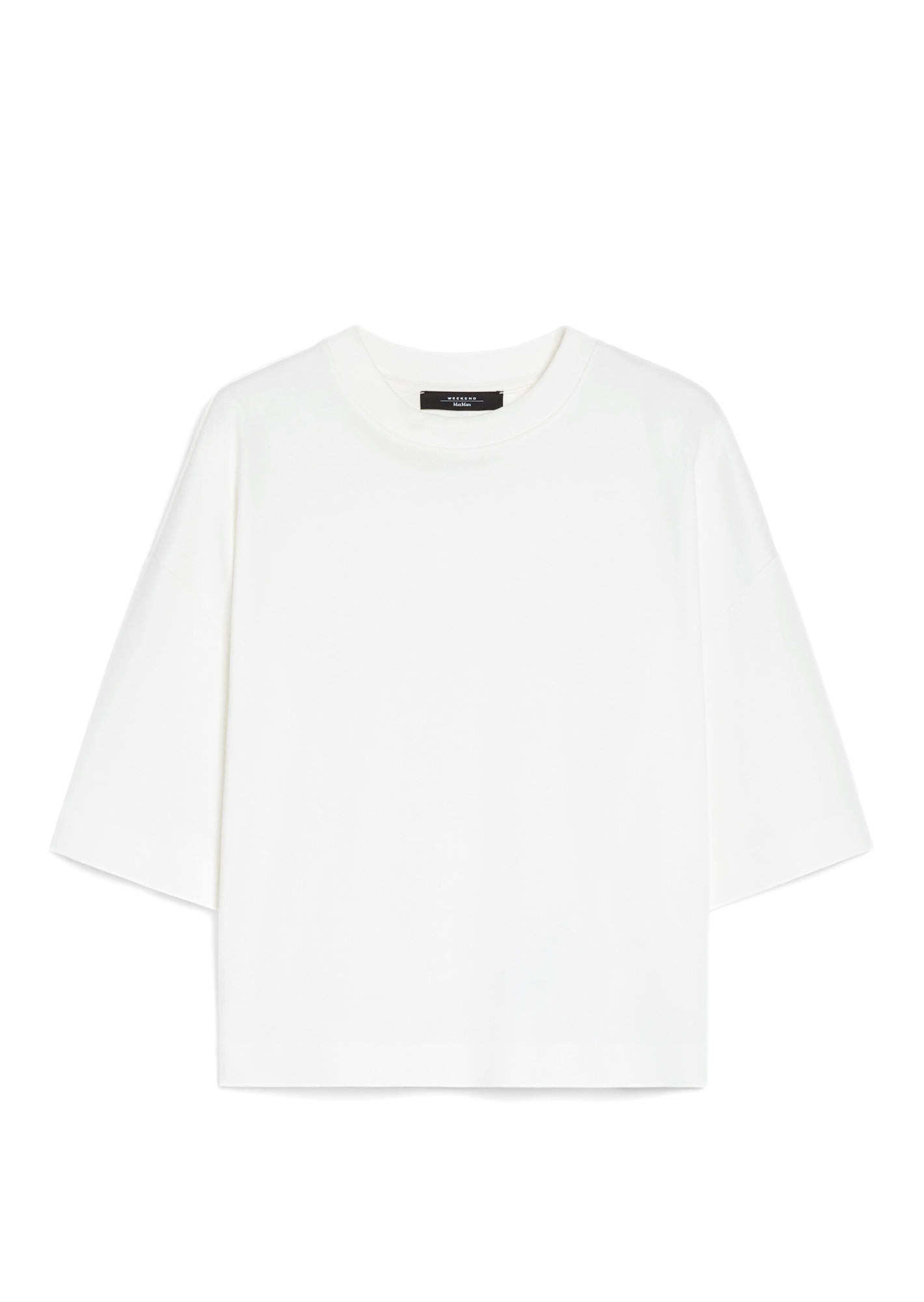 Футболка свободного кроя из мягкого органического хлопка и вискозного трикотажа. Модель имеет ребристый круглый вырез и короткие, слегка заниженные рукава.