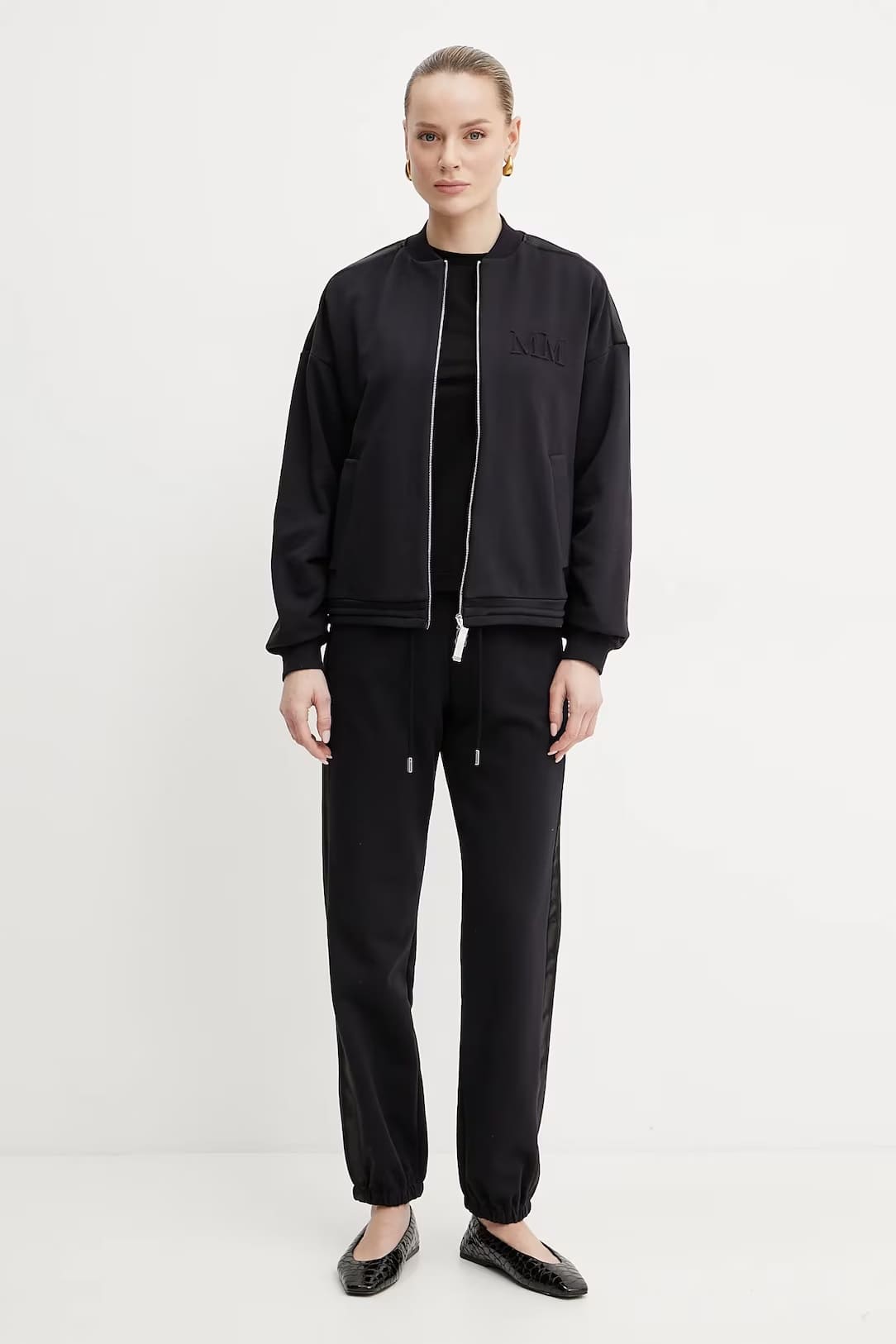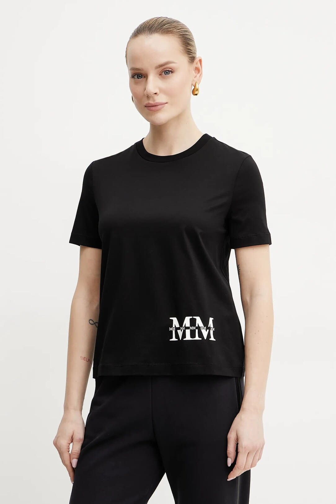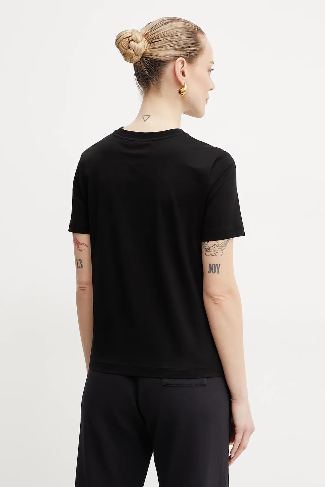 Черная футболка из хлопкового джерси прямого кроя с классическим круглым вырезом. Небольшой металлический логотип на груди подчёркивает сдержанный характер изделия. Сочетается с джинсами, шортами, юбками и жакетами в многослойных образах. Базовый элемент повседневного гардероба в современном минималистичном стиле.