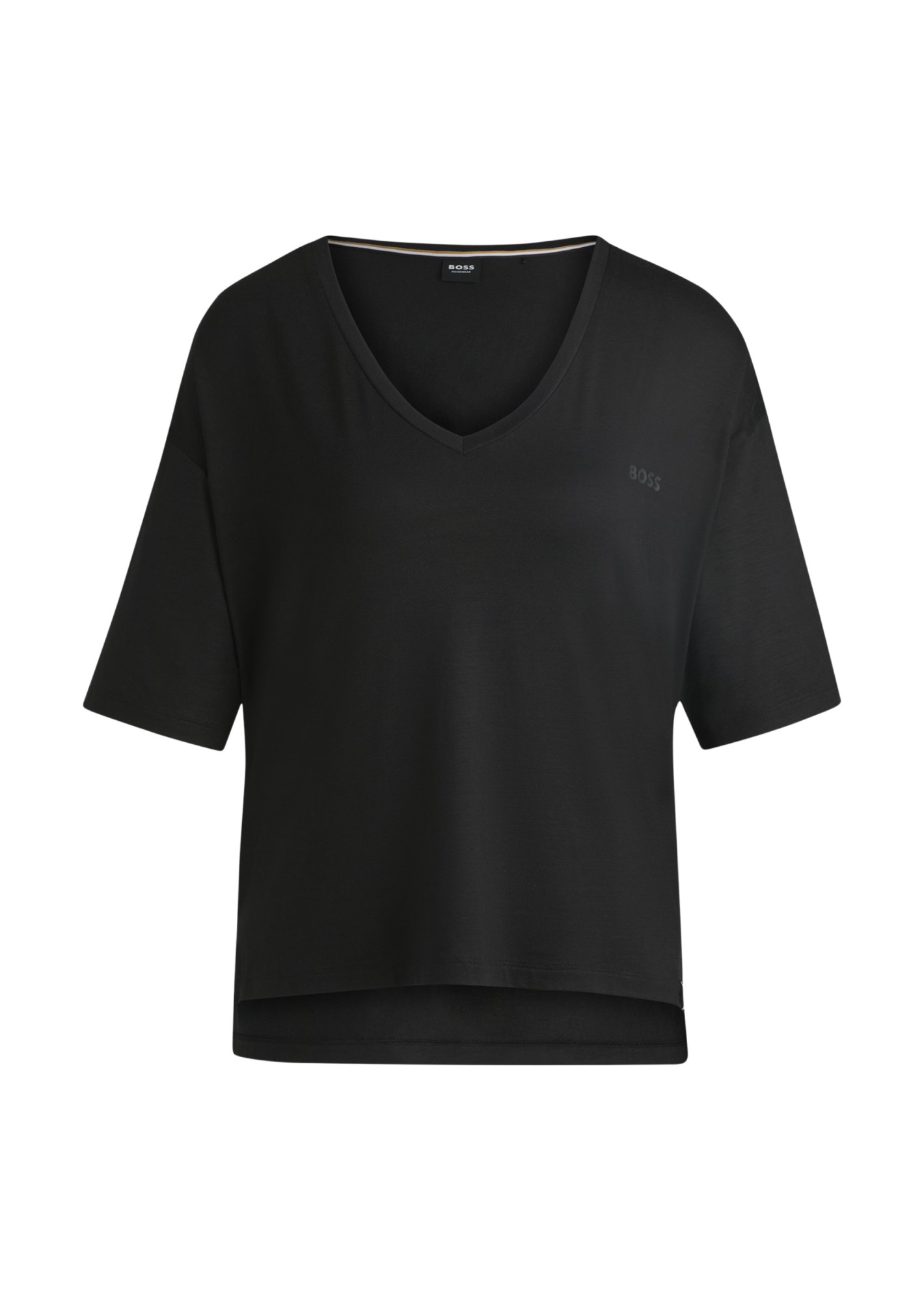 Женская футболка из коллекции BOSS изготовлена из мягкого, эластичного трикотажа. Стильная модель с V-образным вырезом, свободного кроя, украшена логотипом на груди. Комфортная футболка, не ограничивающая движения.