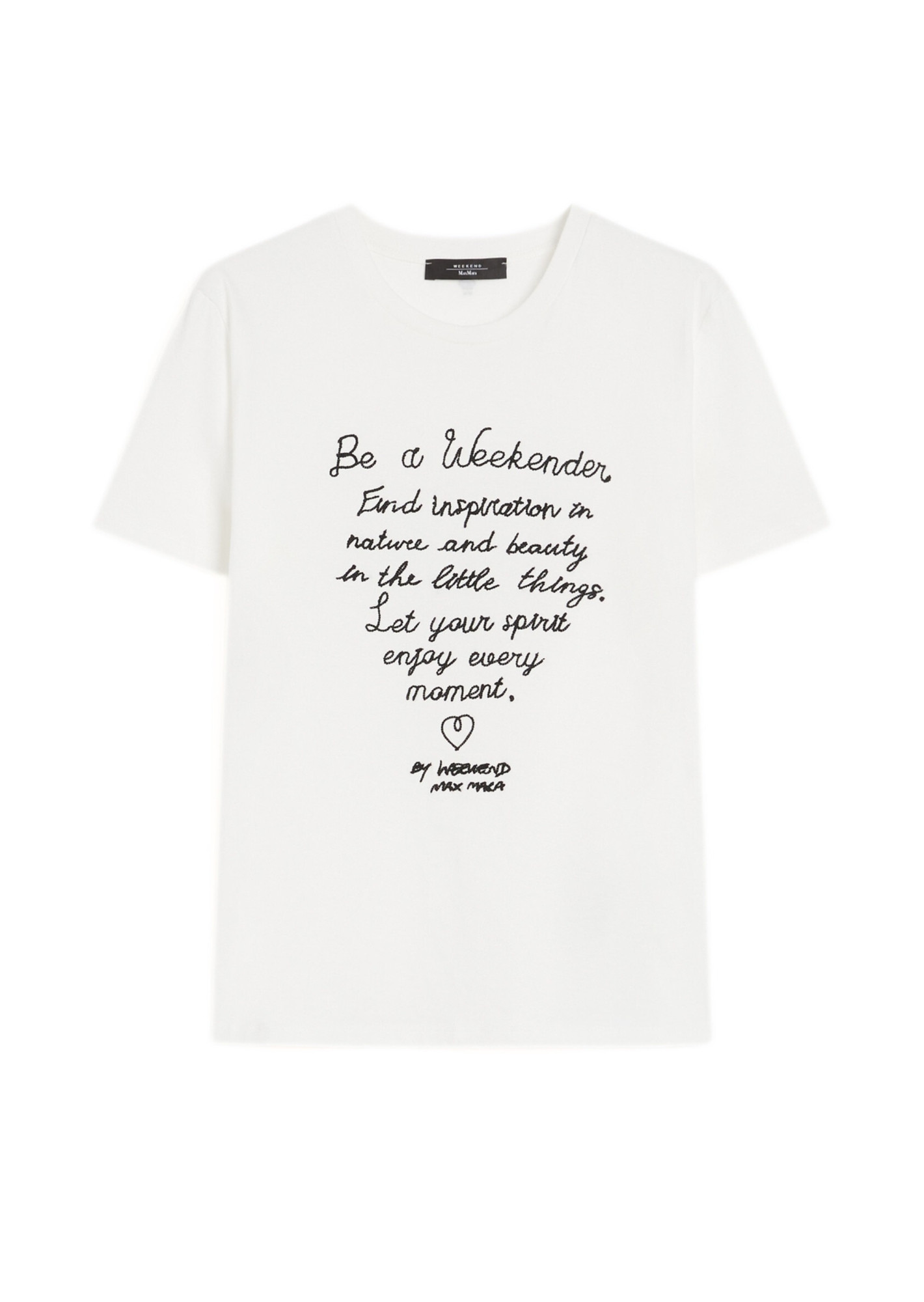 Футболка Weekend Max Mara в белом цвете из 100% хлопка. Модель прямого кроя с короткими рукавами и округлым вырезом. Минималистичный дизайн подчёркивает универсальность и комфорт. Сочетается с джинсами, шортами, юбками и жакетами. Идеальная база для повседневных образов — дышащая, мягкая и легко комбинируется с разными стилями.