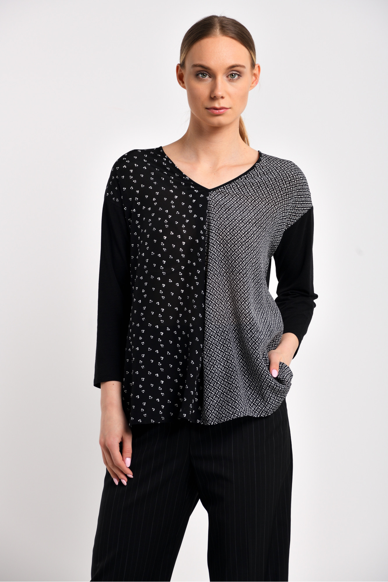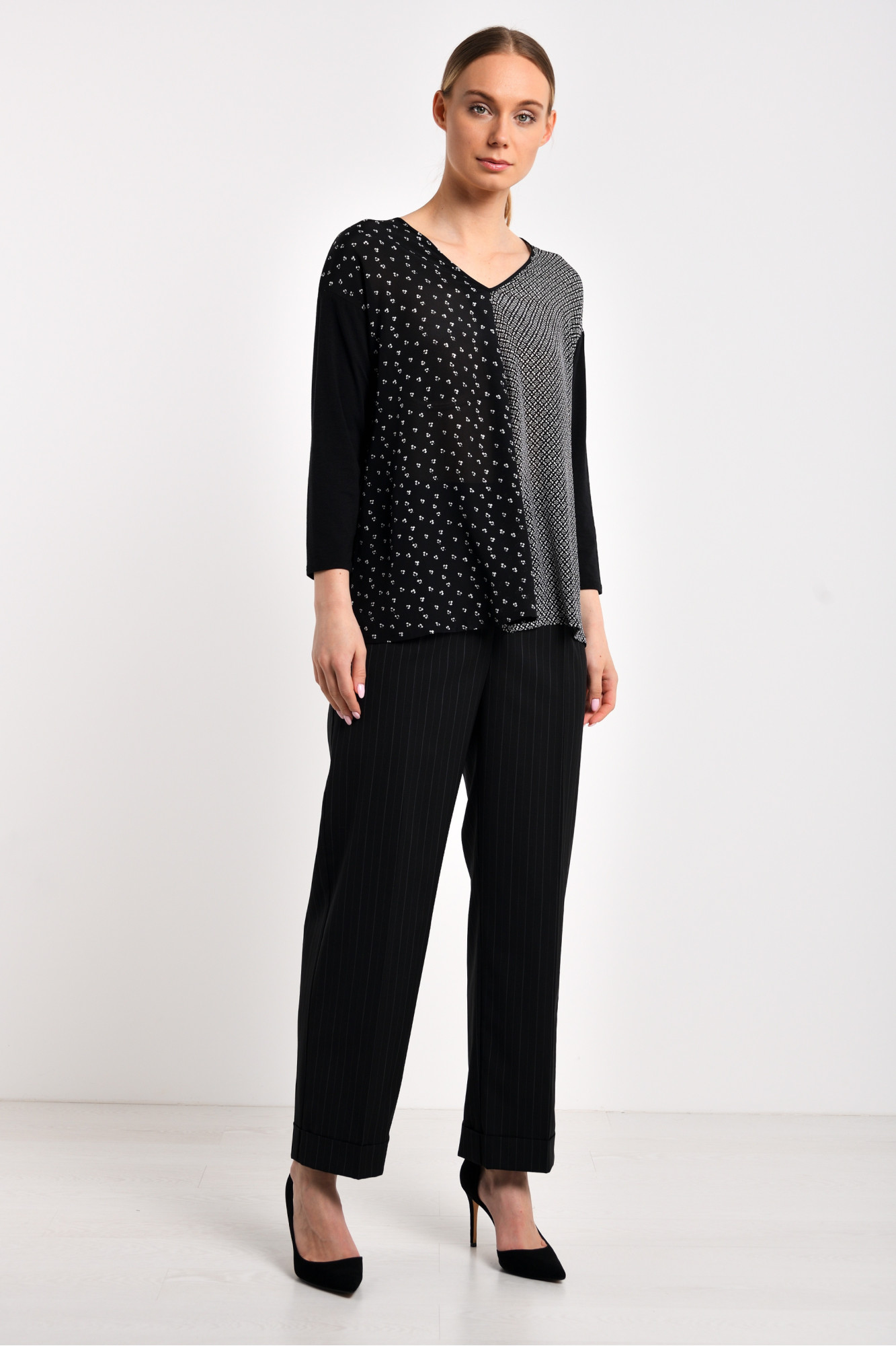Женская блуза с длинными рукавами изготовлена из комфортногго трикотажа в мелкий цветочный узор. Модель с V-образным вырезом - универсальная кофта: прекрасно сочитается с брюками для более делового образа и с джинсами для повседневного аутфита.