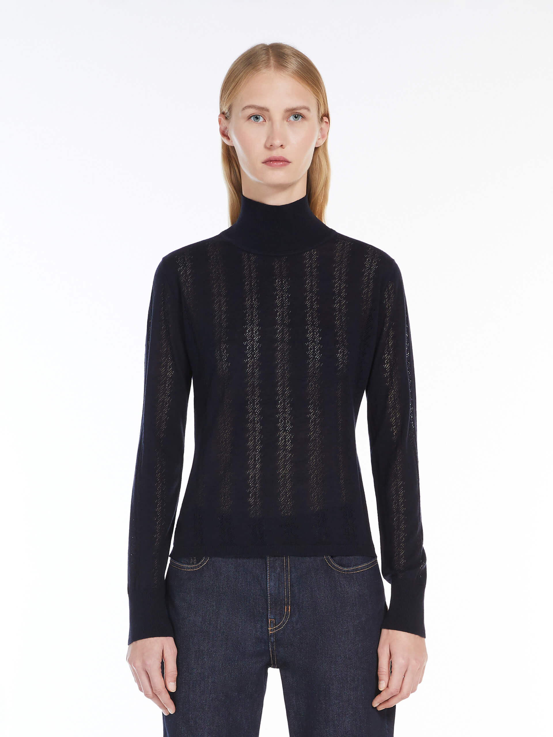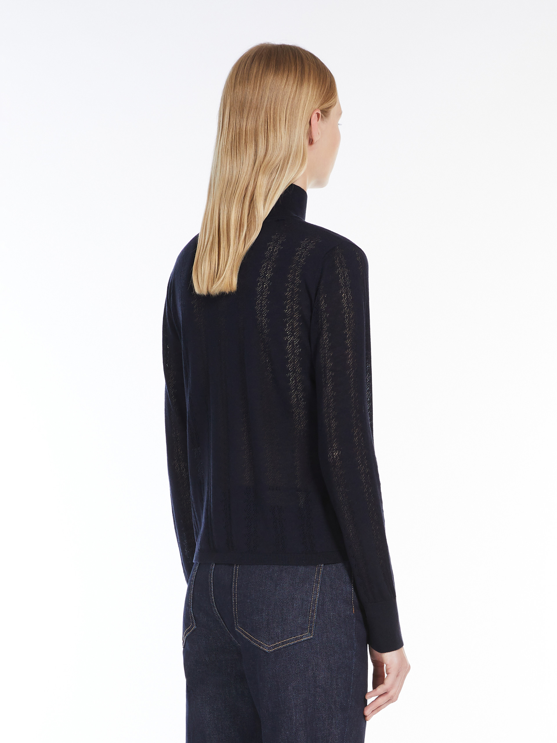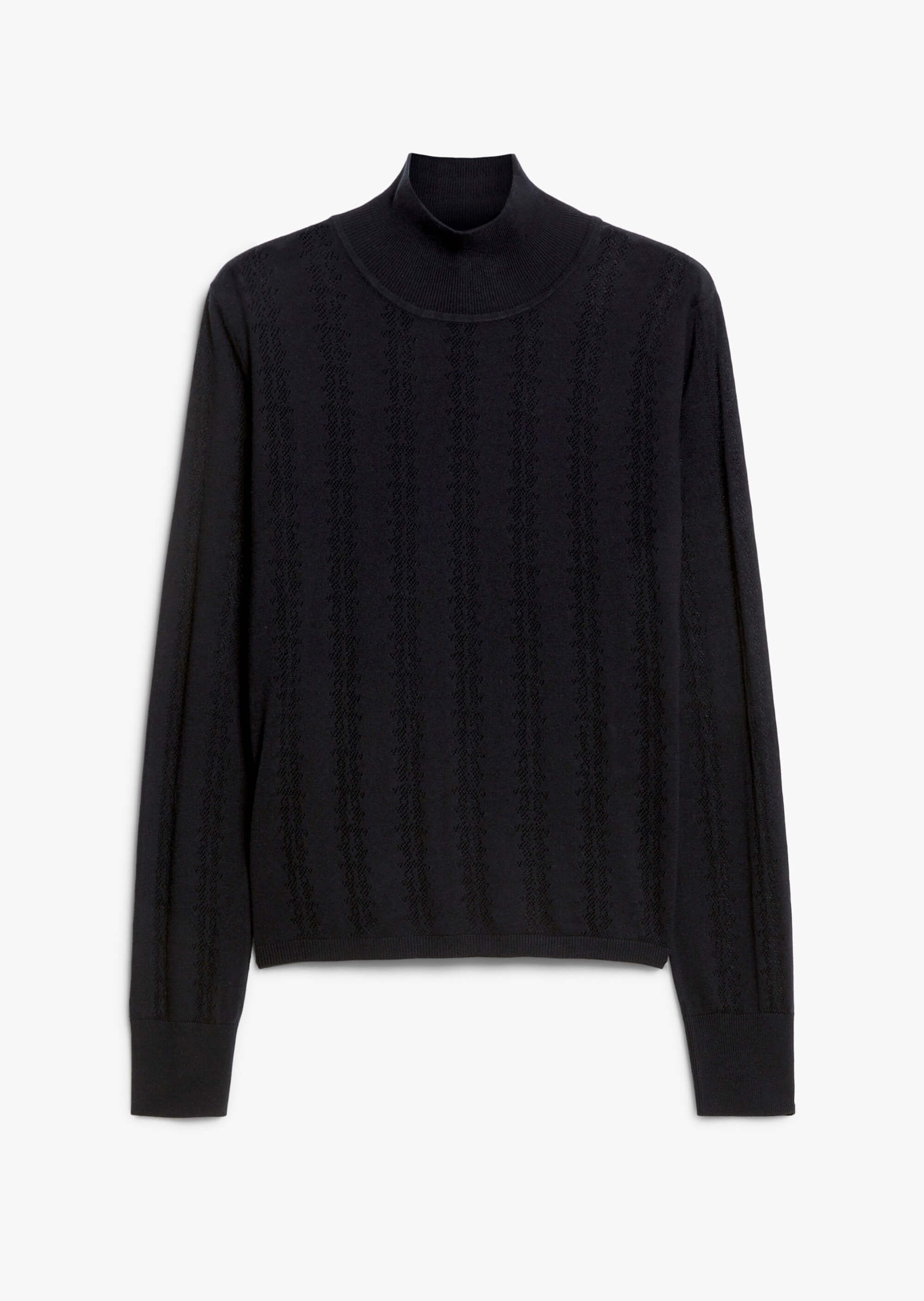 Джемпер с воротником-поло, выполнен из тонкой шерсти и шелка, с изящным кружевным узором. Модель приталенного кроя, имеет длинные втачные рукава, а также высокий воротник и манжеты, связанные резинкой.