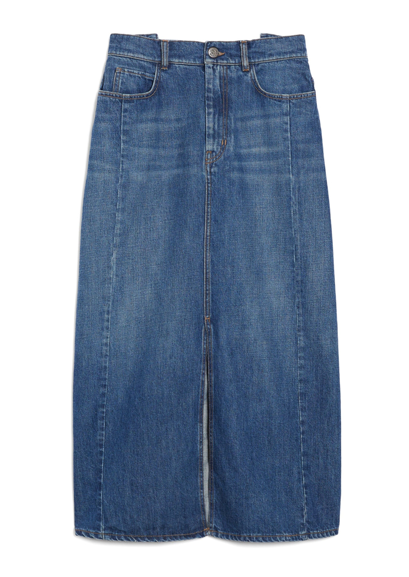 Джинсовая юбка с 5 карманами, вертикальными выточками спереди и сзади. Модель украшена асимметричными деталями, выделяющими заднюю часть изделия. Застежка на молнию и пуговицу спереди.