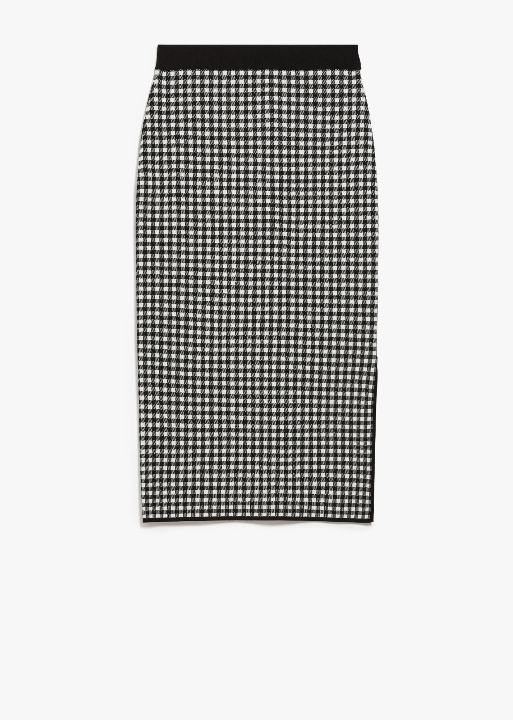 Юбка-карандаш из эластичной вискозной пряжи с роскошным двухцветным жаккардовым переплетением. Приталенный фасон с эластичной талией в рубчик и боковым разрезом по низу
