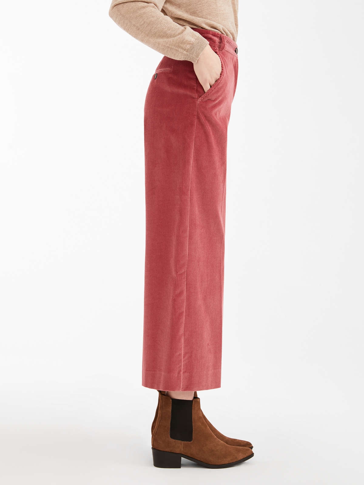 Брюки с широкими штанинами, выполнены из чистого хлопка. С наклонными боковыми карманами и небольшими задними карманами. Пояс на талии и застежка-молния с пуговицей.