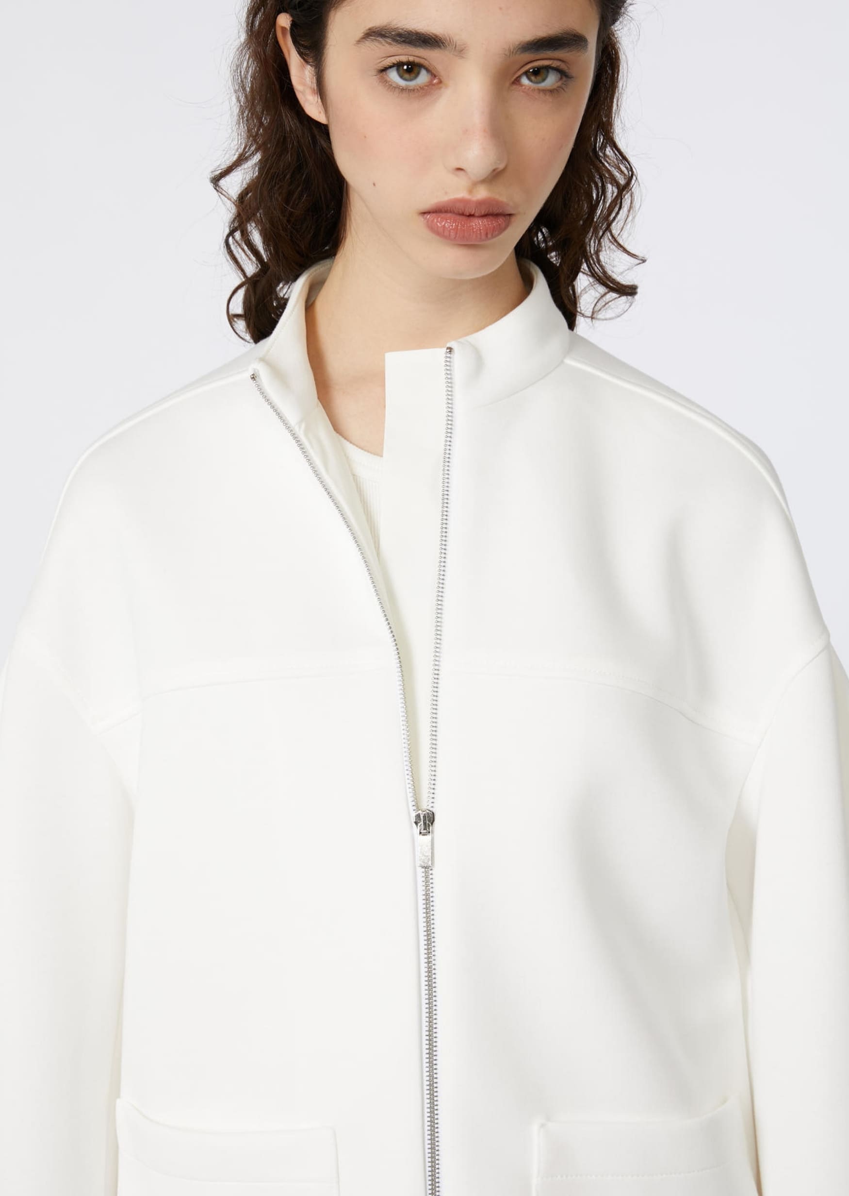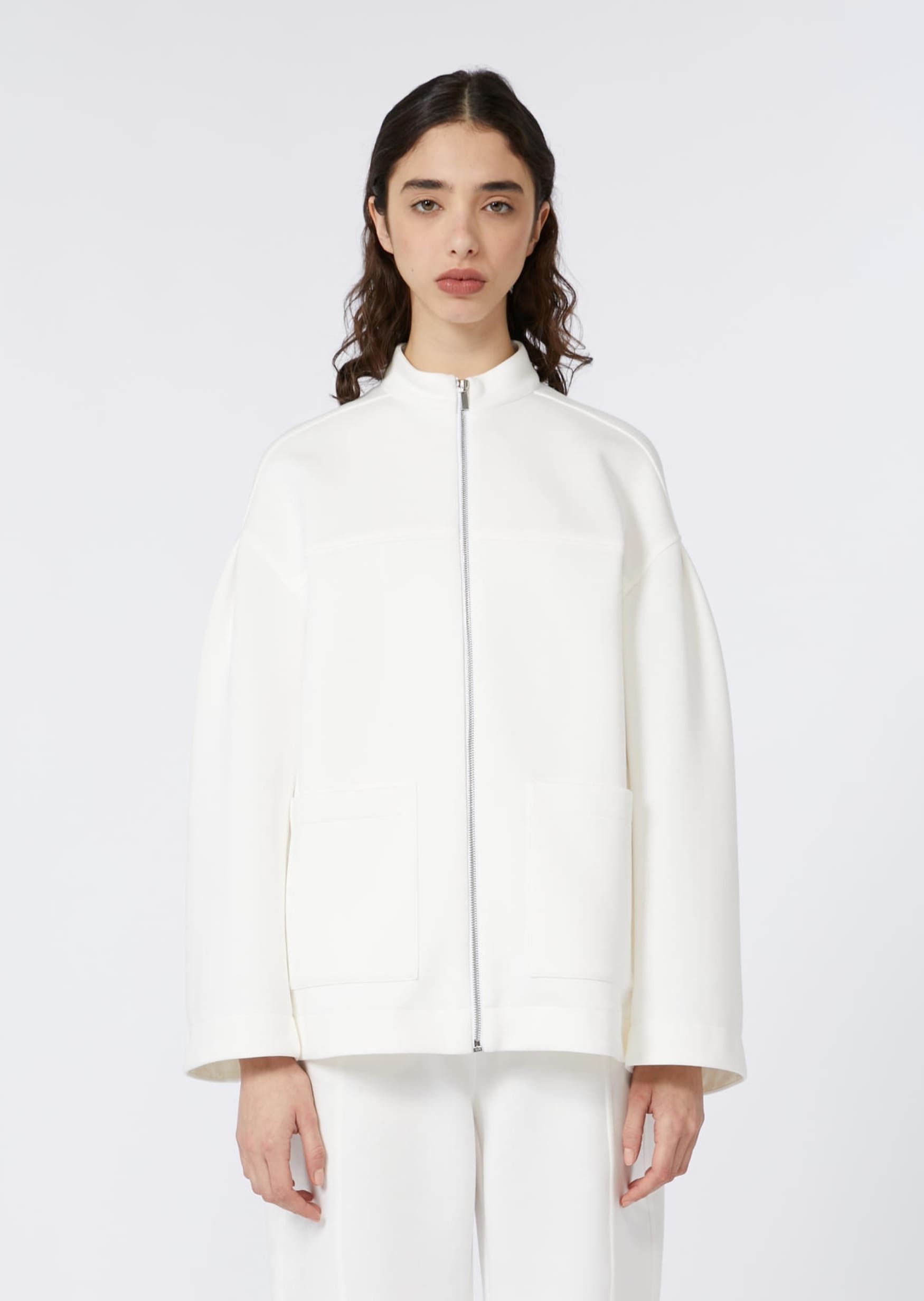 Белая куртка Max Mara прямого кроя с застёжкой на молнию. Минималистичный дизайн дополнен накладными карманами и мягкой линией плеч, что создаёт расслабленный и современный силуэт. Материал средней плотности хорошо держит форму и комфортен в носке. Сочетается с джинсами, чиносами, платьями рубашечного кроя и спортивной обувью. Функциональная и универсальная вещь для повседневного гардероба — подойдёт для межсезонья и прохладных летних вечеров.