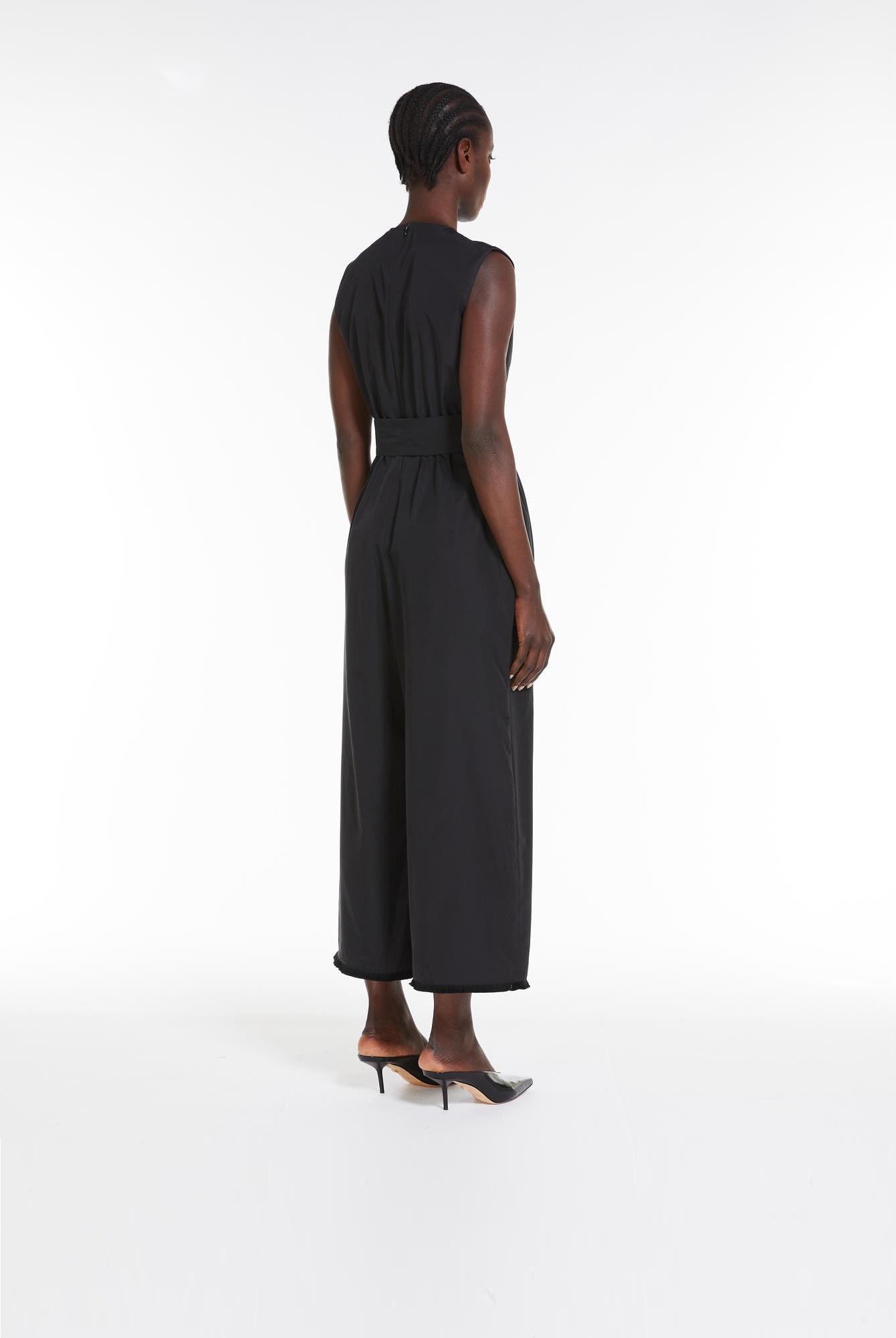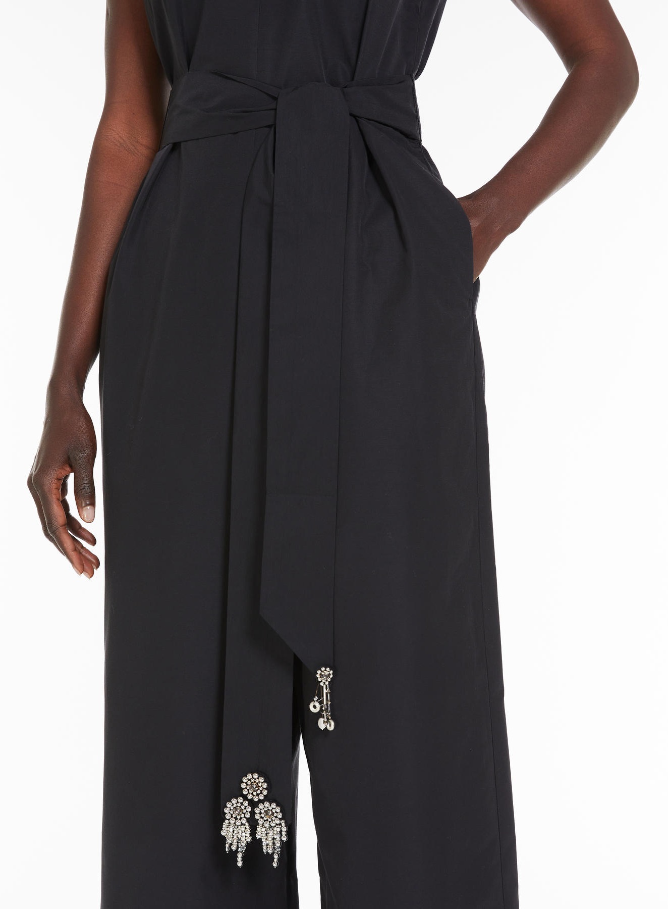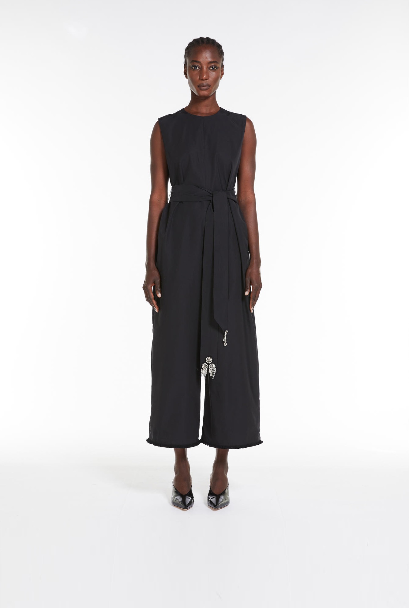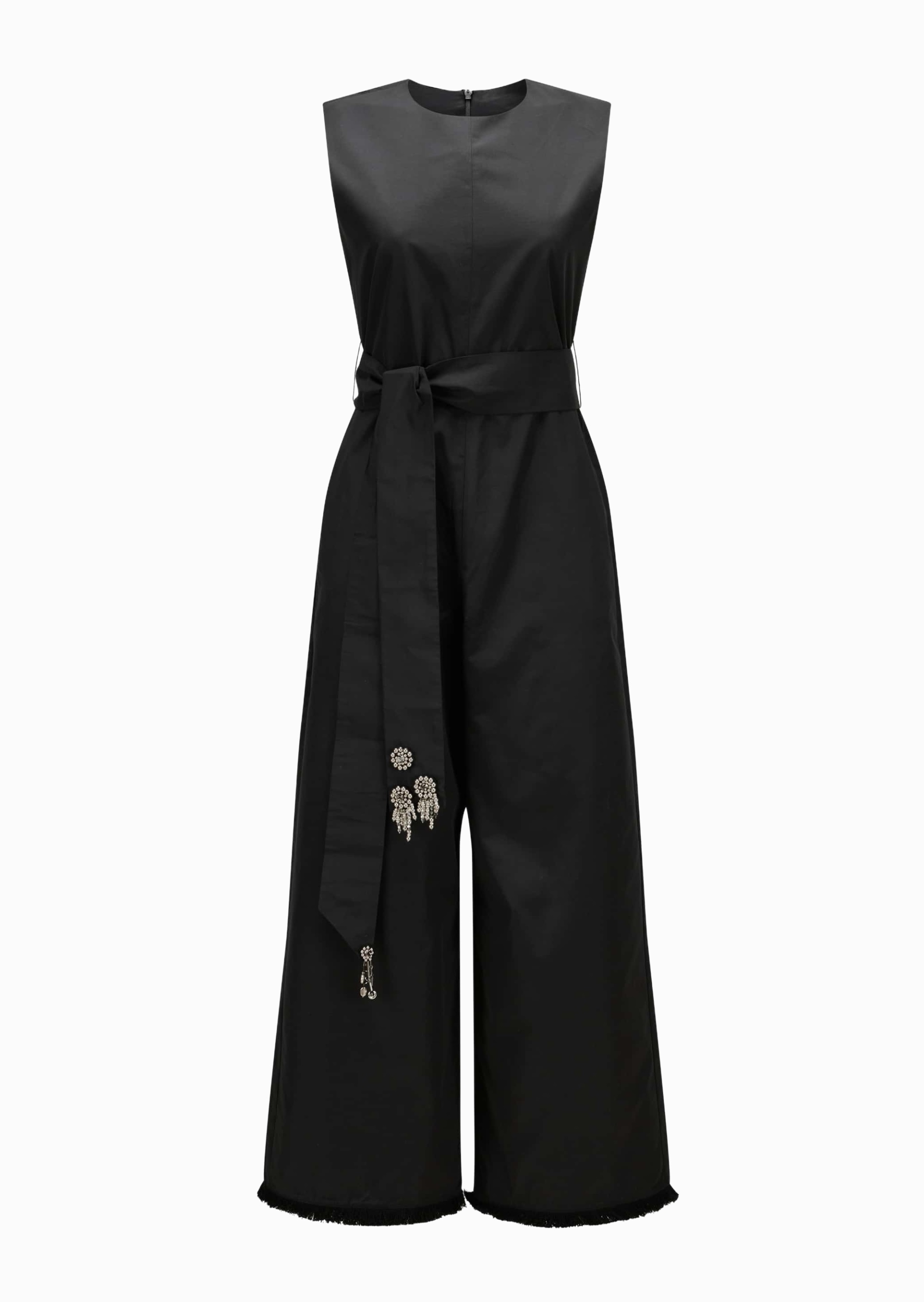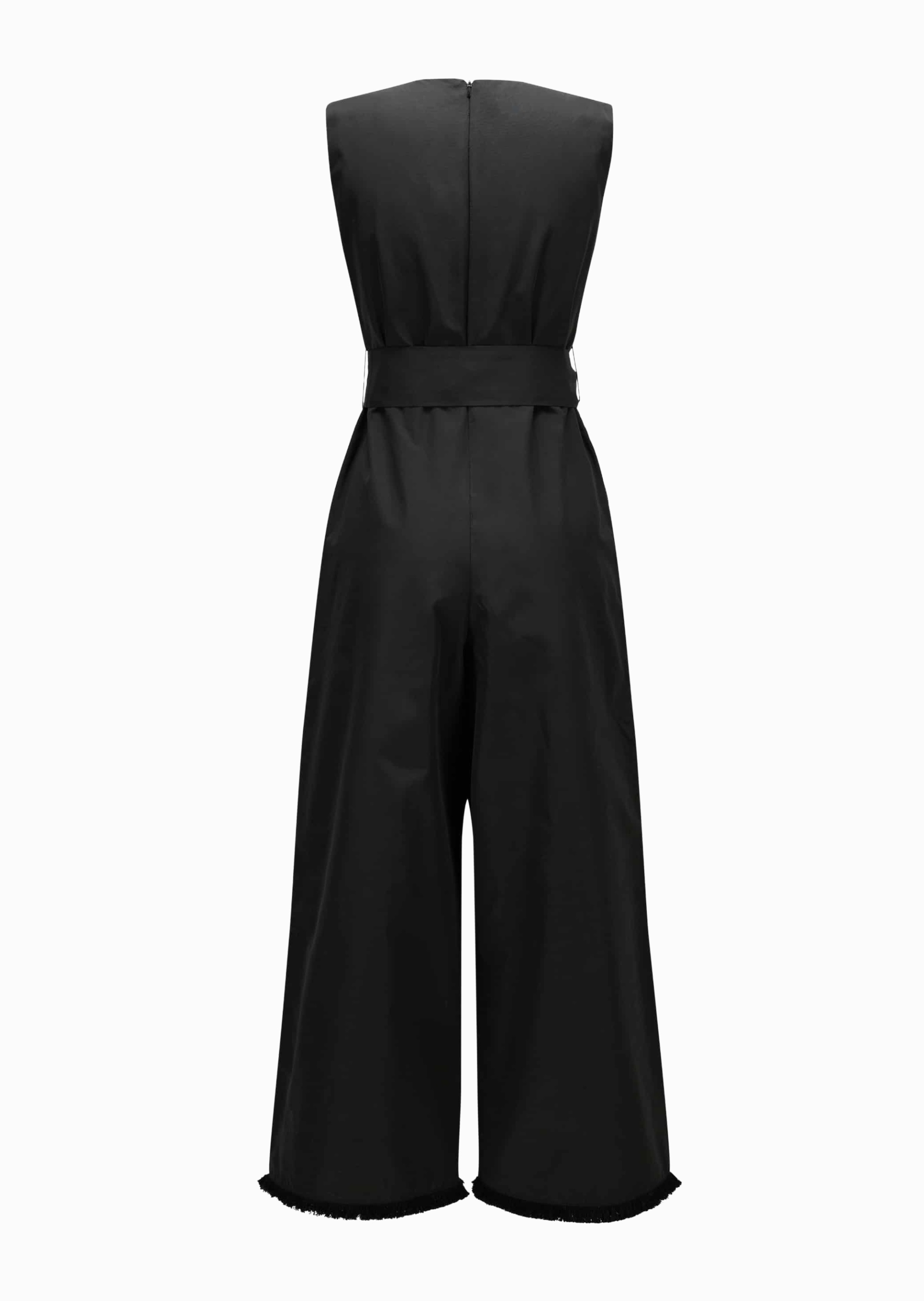 Комбинезон без рукавов из легкой хлопчатобумажной ткани с прямыми штанинами и поясом в тон, подчеркивающим линию талии. Подол украшен бахромой, а на поясе съемная вышивка. Боковые карманы в шве. Потайная молния сзади.