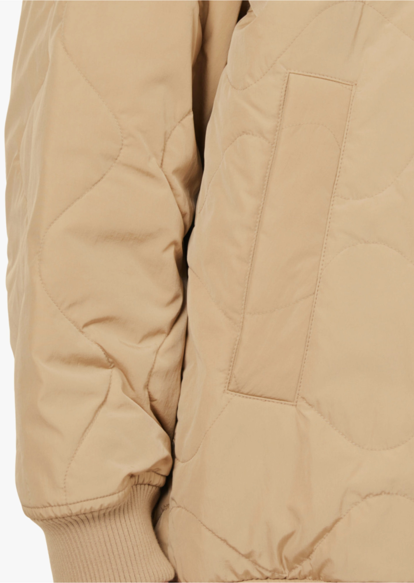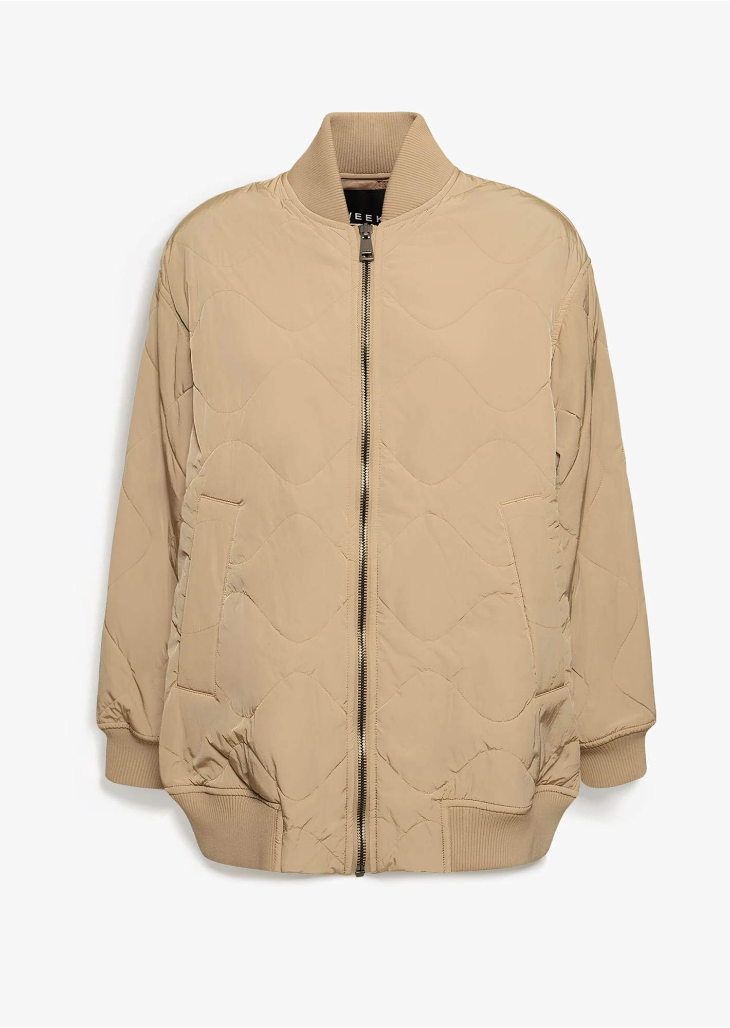 Классическая куртка-бомбер из водоотталкивающей ткани со стеганой поверхностью и утеплителем. Удобная модель имеет трикотажные детали в рубчик на воротнике, манжетах и подоле, имеет боковые карманы и молнию спереди. Он украшен маленькой эмблемой бабочки на задней части шеи.