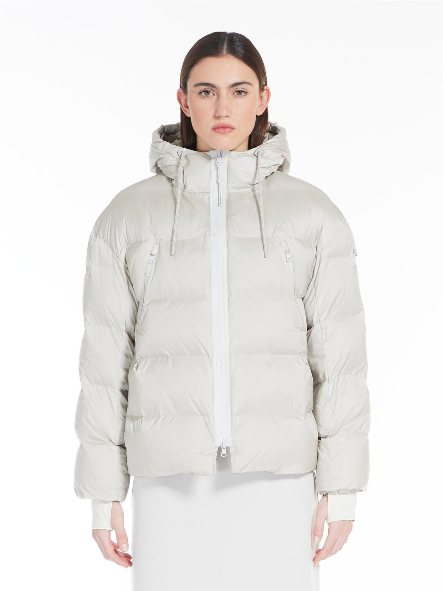 парка на гусином пуху из водоотталкивающей технической ткани Upcycling с горизонтальным полосатым стеганым мотивом по всей поверхности. Модель имеет капюшон на шнурке, боковые прорезные карманы и втачные рукава с эластичными манжетами, регулируемыми с помощью фиксатора и скрытой металлической кнопки. Застежка-молния спереди с кожаным двойным бегунком.