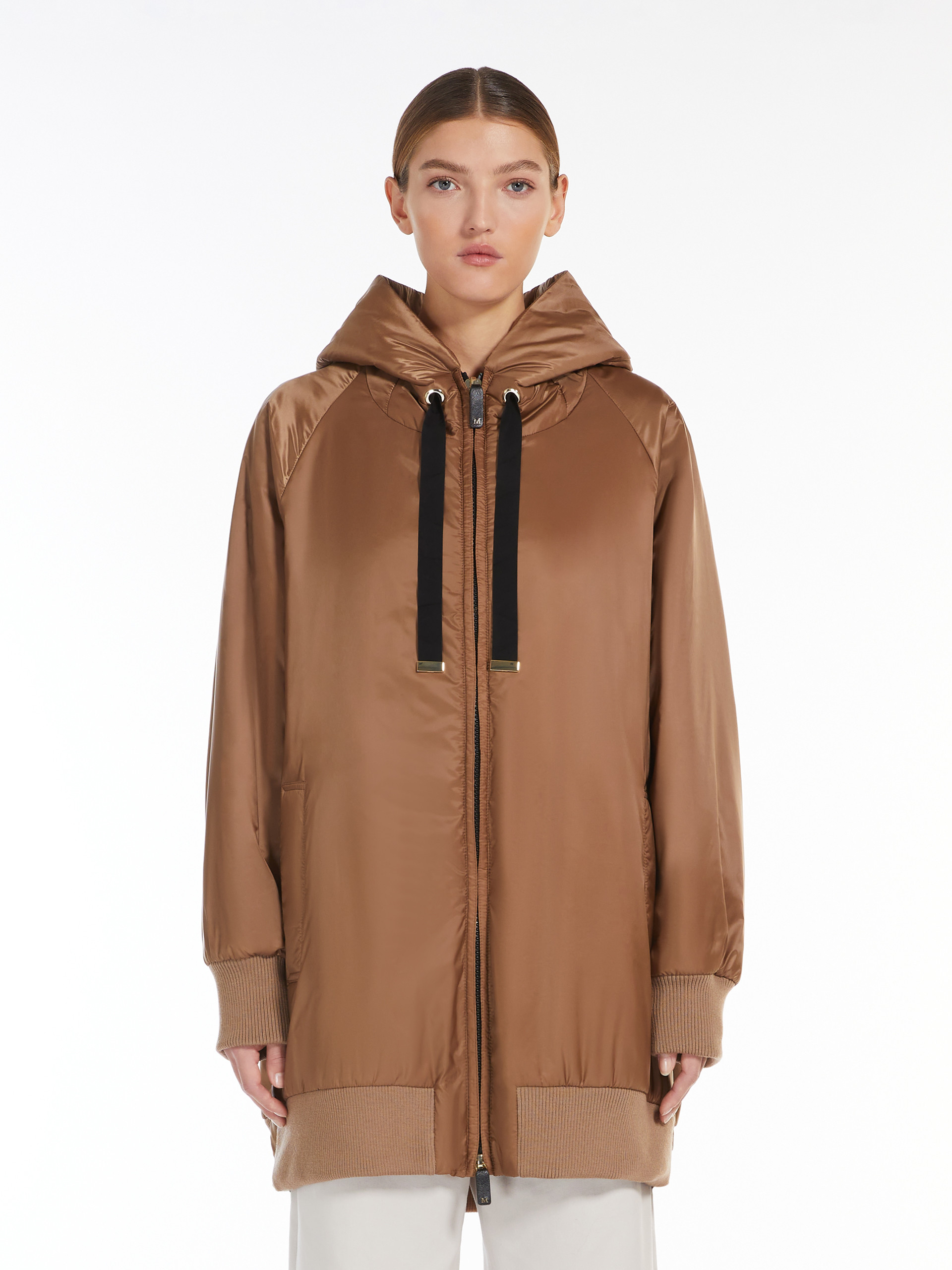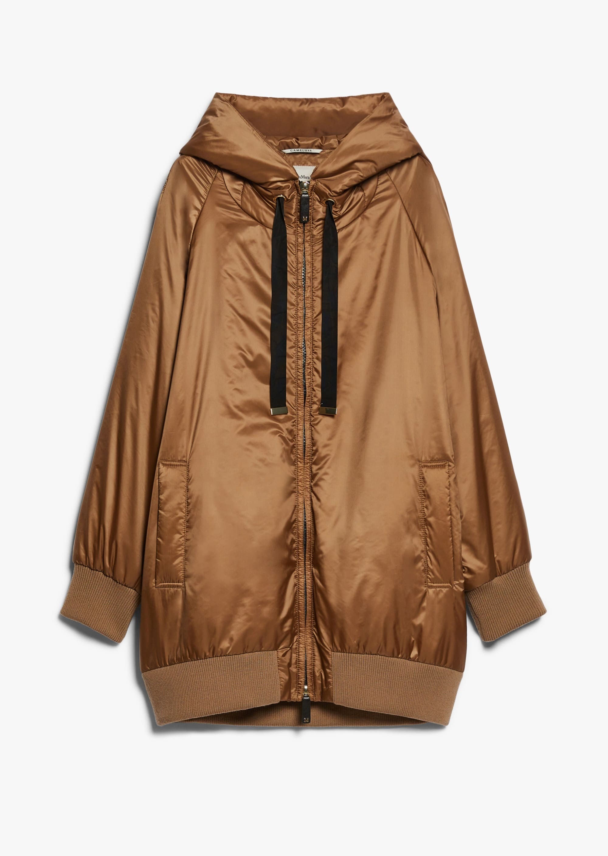 Куртка с капюшоном на шнуровке, выполнена из водоотталкивающей ткани, с прорезными карманами спереди, рукавами реглан, трикотажными манжетами. Боковые разрезы открываются на металлических кнопках. Застегивается на молнию с двойным кожаным бегунком.
