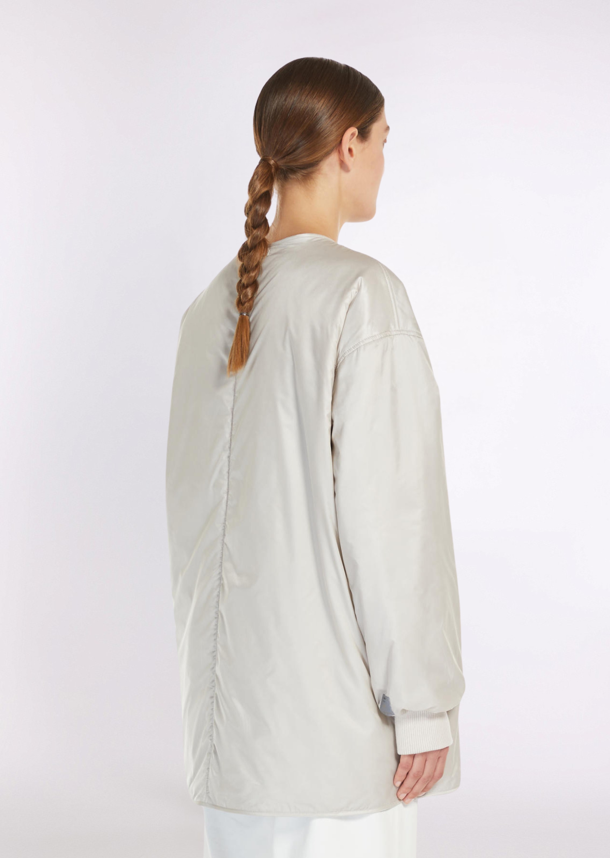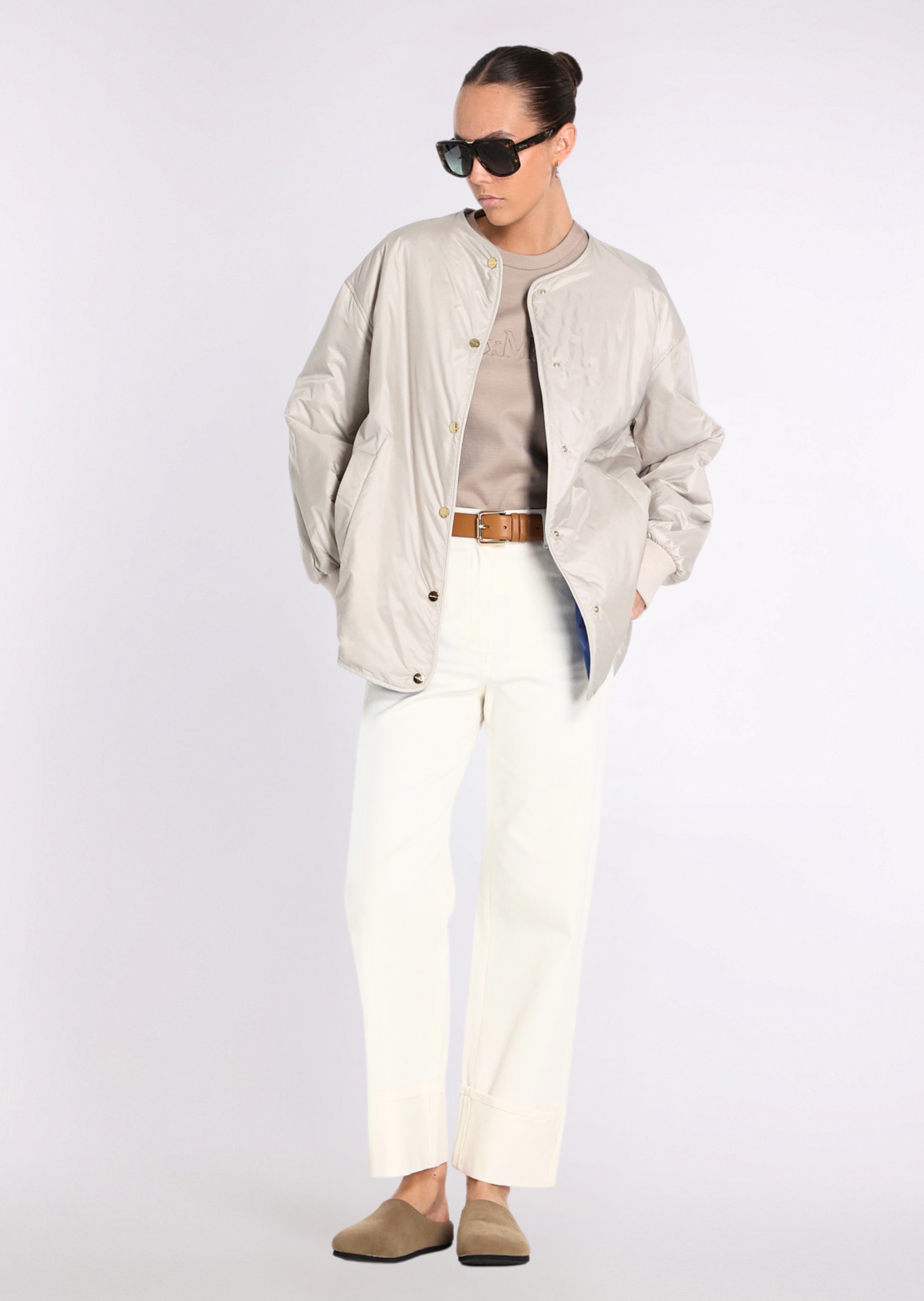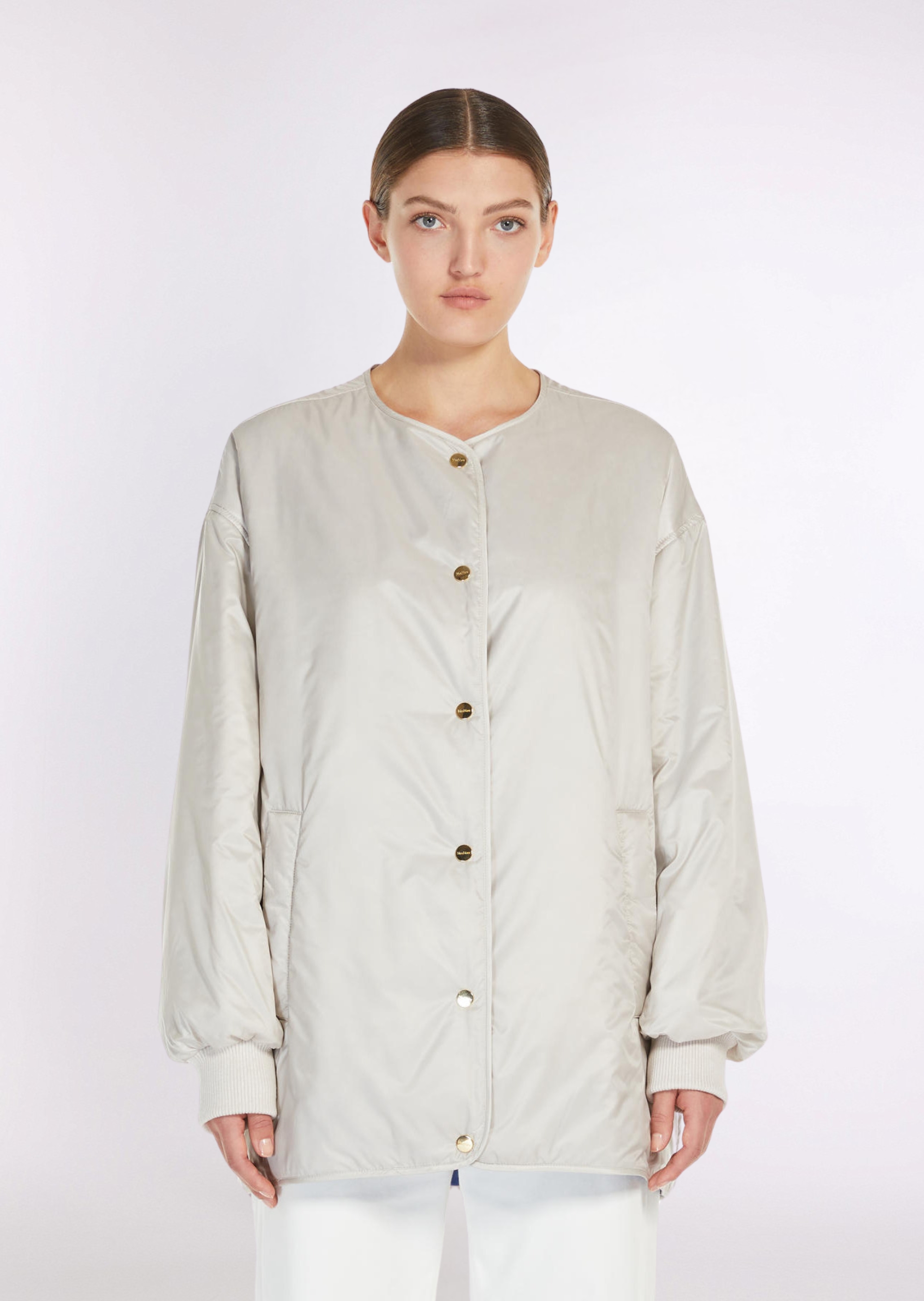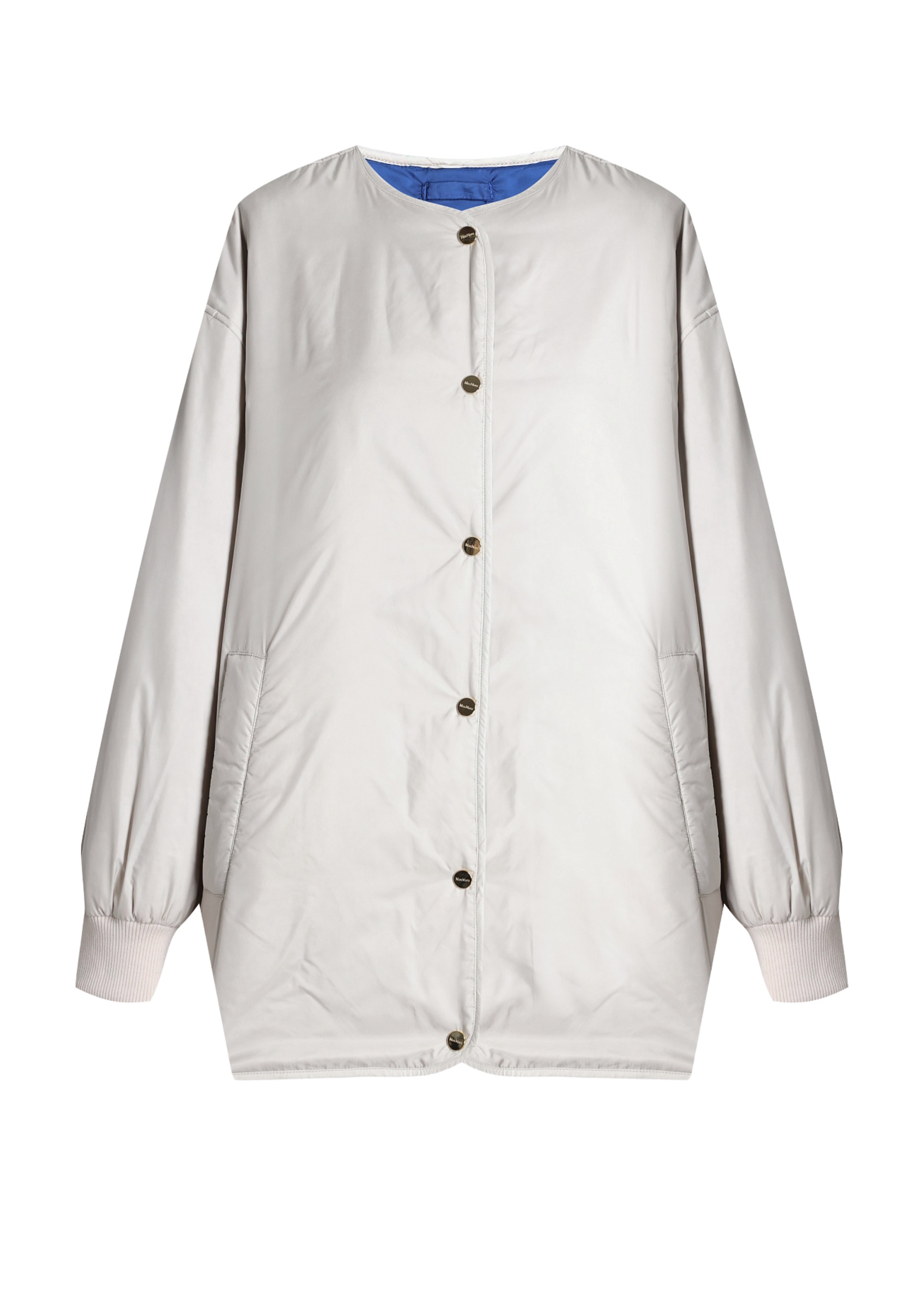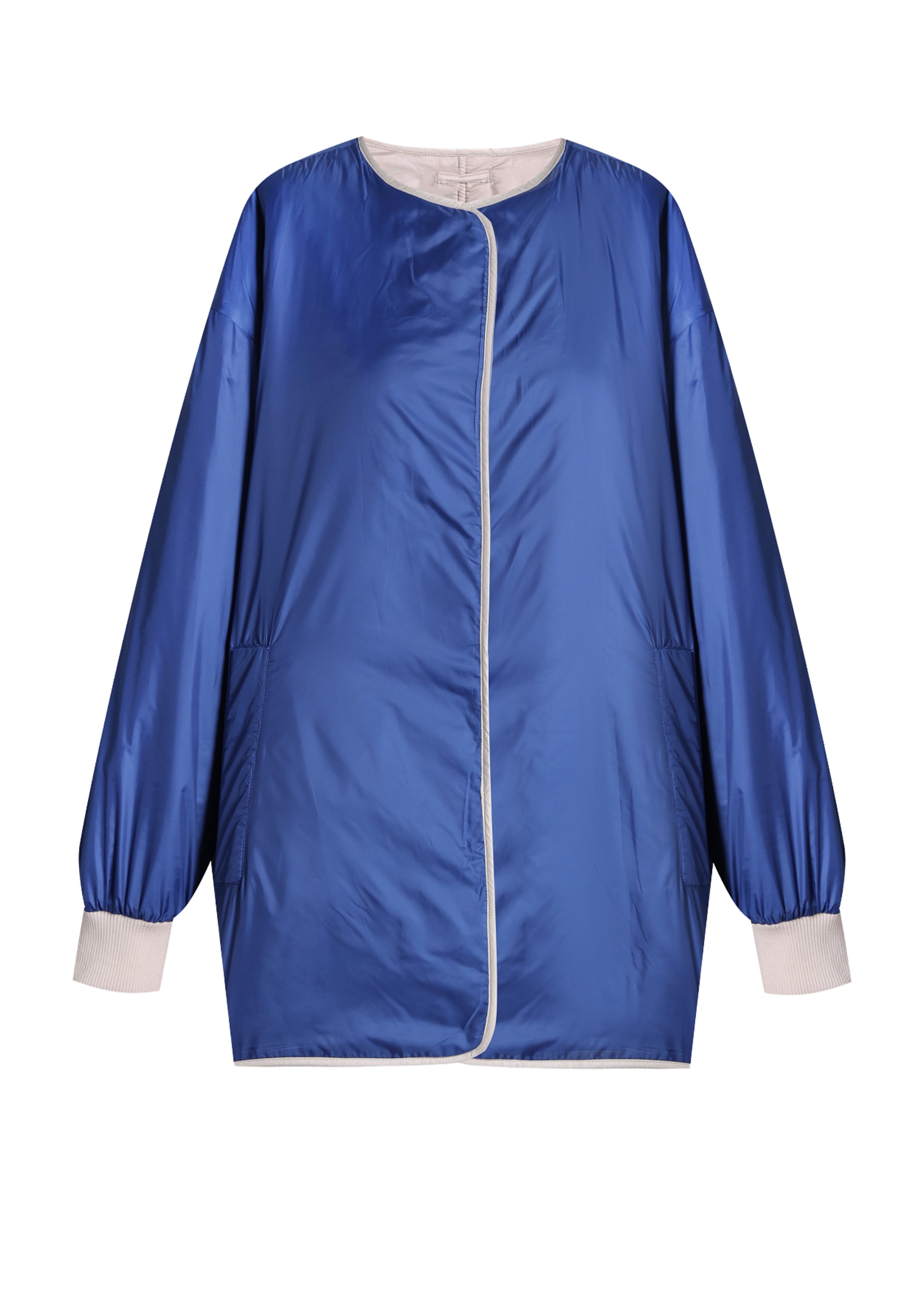 Двусторонний бомбер изготовлен из водоотталкивающей ткани. Модель с круглым вырезом, с длинными рукавами с заниженной линией плеч и прорезными боковыми карманами. Изделие украшено трикотажными манжетами и деталью с логотипом. Однобортная застежка на кнопки.