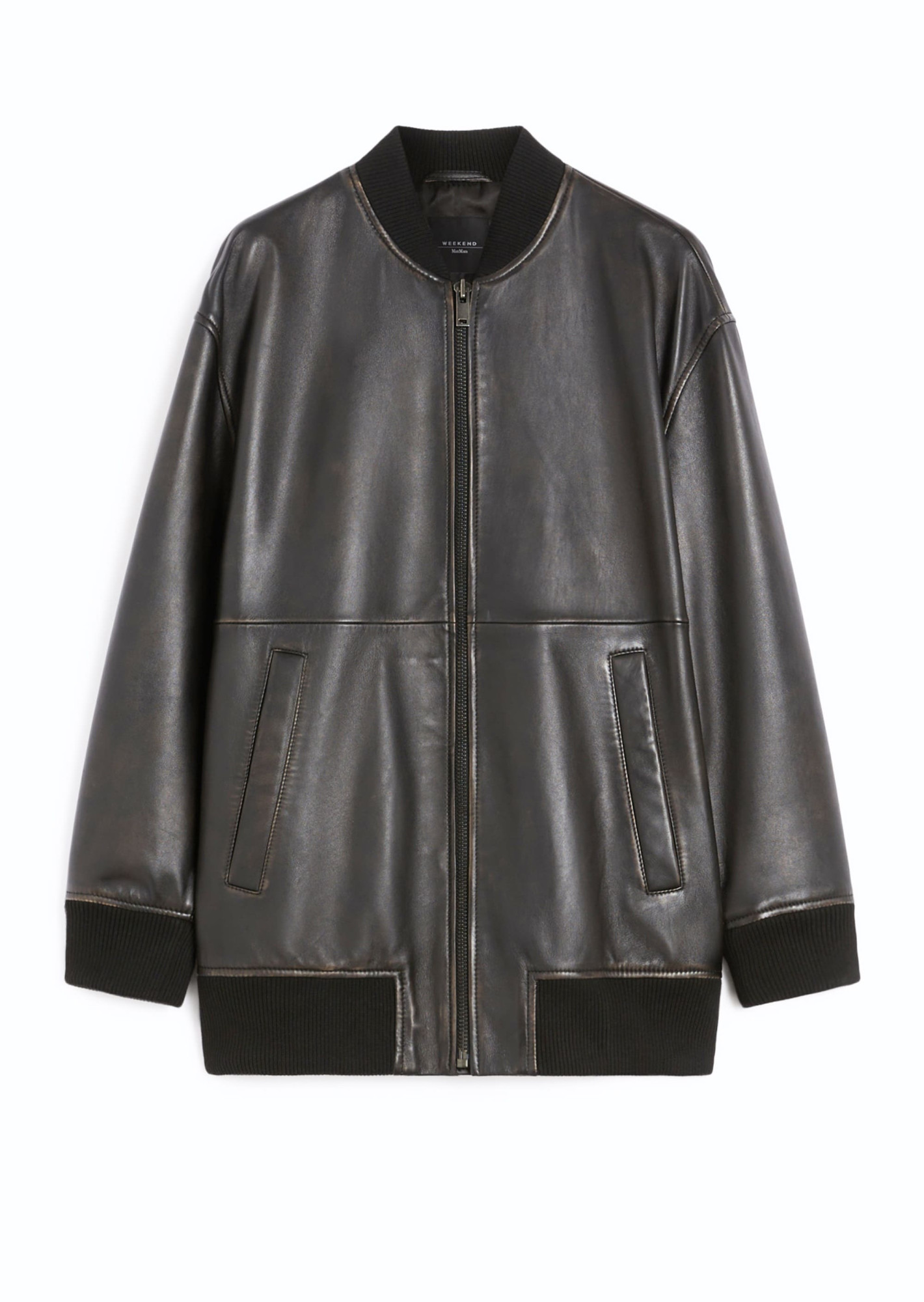 Кожання куртка Max Mara Weekend с винтажным эффектом. Выполнена в свободном крое, что придаёт образу непринуждённость и современность. Вязаные вставки на воротнике, манжетах и по низу изделия создают гармоничный контраст фактур. Куртка дополнена застёжкой на молнию, боковыми карманами в рамку и декоративной строчкой в стиле кожгалантереи. Полностью на подкладке для дополнительного комфорта. Глубокий чёрный оттенок делает изделие универсальным решением для базового гардероба. Идеально сочетается с прямыми джинсами, шерстяными брюками и лаконичными рубашками. Кожання куртка станет стильным акцентом образа, объединяя в себе премиальные материалы и расслабленную эстетику Weekend Max Mara.