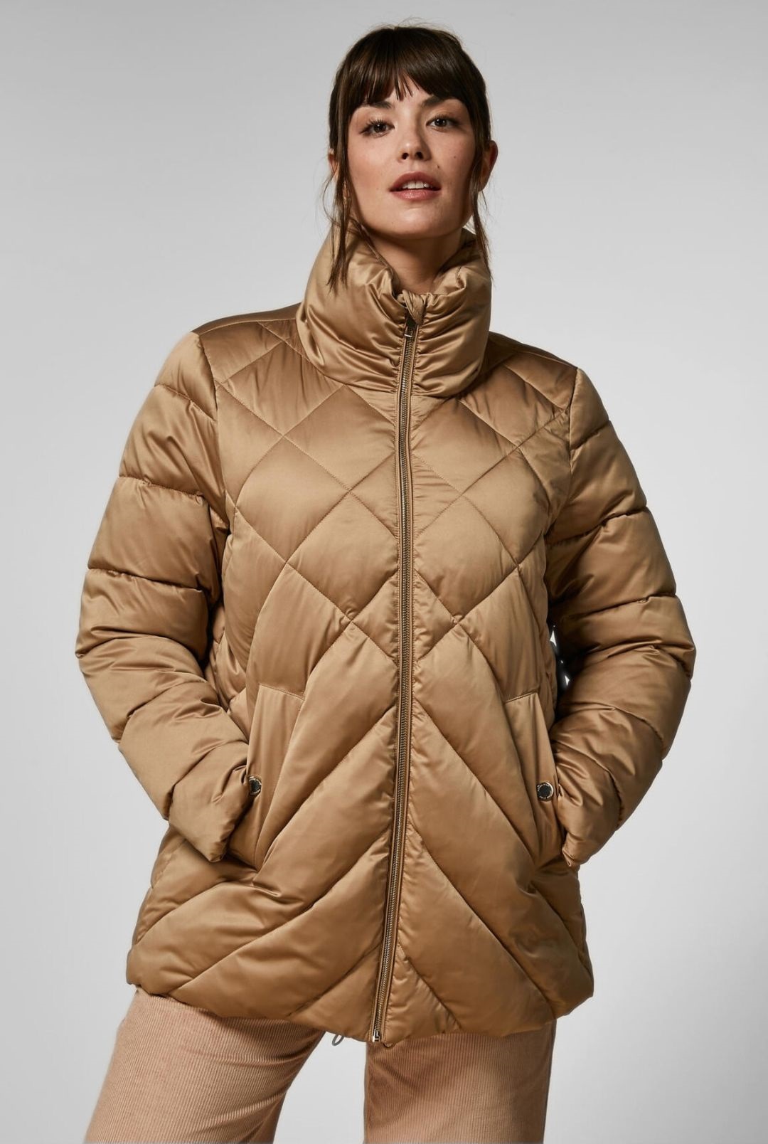 Утепленная куртка с наполнителем халофайбер. Выполнена из стеганного текстиля, модель прямого кроя имет застежку на молнии, высокий воротник-стойку и косые карманы на кнопках с золотой фурнитурой.
