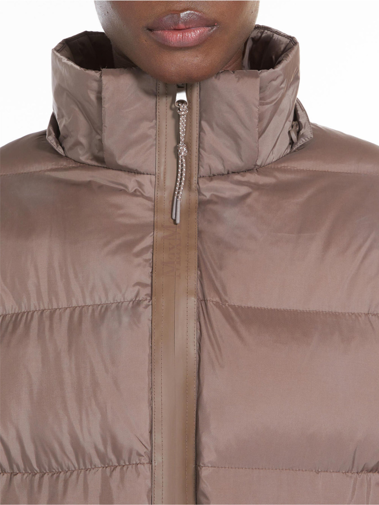 Длинная парка на гусином пуху из водоотталкивающей технической ткани Upcycling с горизонтальным полосатым стеганым мотивом по всей поверхности. Модель имеет капюшон на шнурке, боковые прорезные карманы и втачные рукава с эластичными манжетами, регулируемыми с помощью фиксатора и скрытой металлической кнопки. Застежка-молния спереди с кожаным двойным бегунком.