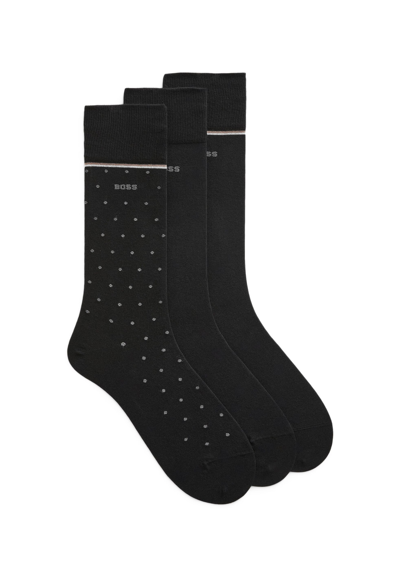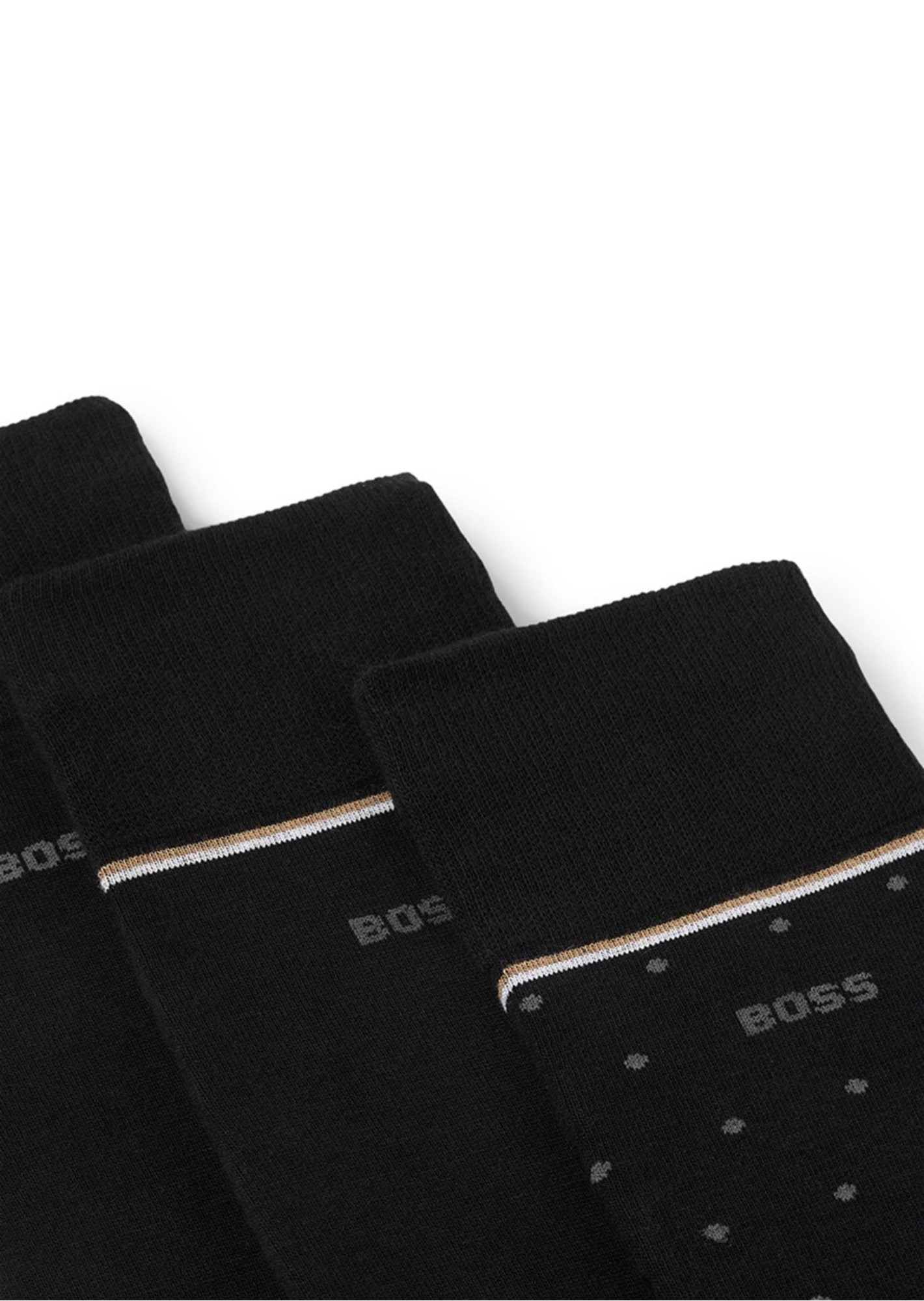 Набор из трёх пар носков BOSS выполнен из хлопкового трикотажа с добавлением эластана для оптимальной эластичности и комфорта. Облегающая посадка и мягкая резинка на щиколотке обеспечивают надёжную фиксацию без давления. Классический чёрный цвет и минималистичный контрастный логотип делают носки универсальными для любого образа. Сочетаются с повседневной, деловой и спортивной обувью. Функциональный базовый элемент гардероба, подчёркивающий утончённость даже в деталях.